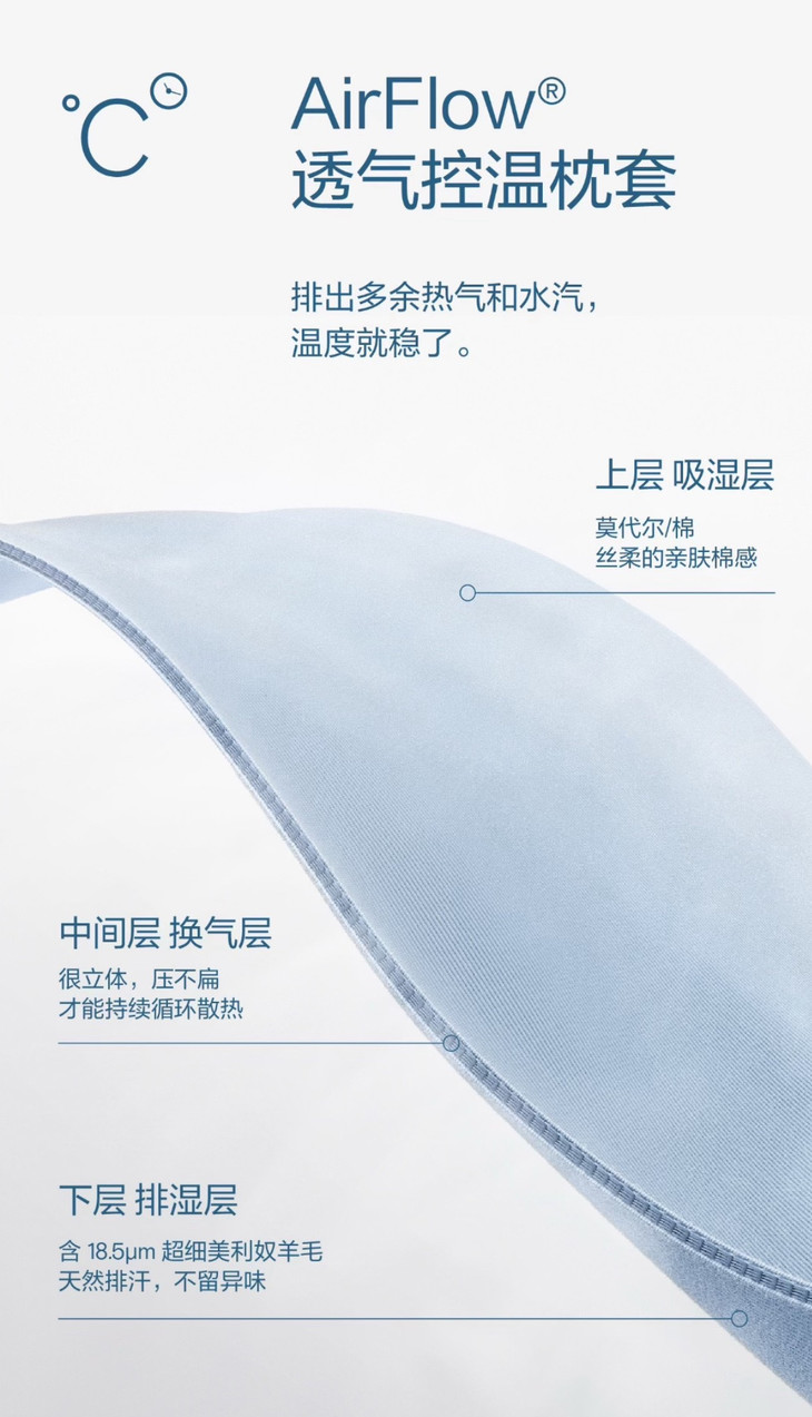 而且这次的Airflow枕套面料也很讲究,枕面散热快,睡温稳定,添加超细美利奴羊毛,天然排汗,不留异味,后脑勺和脖子一整晚清爽不闷