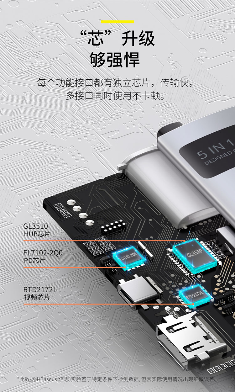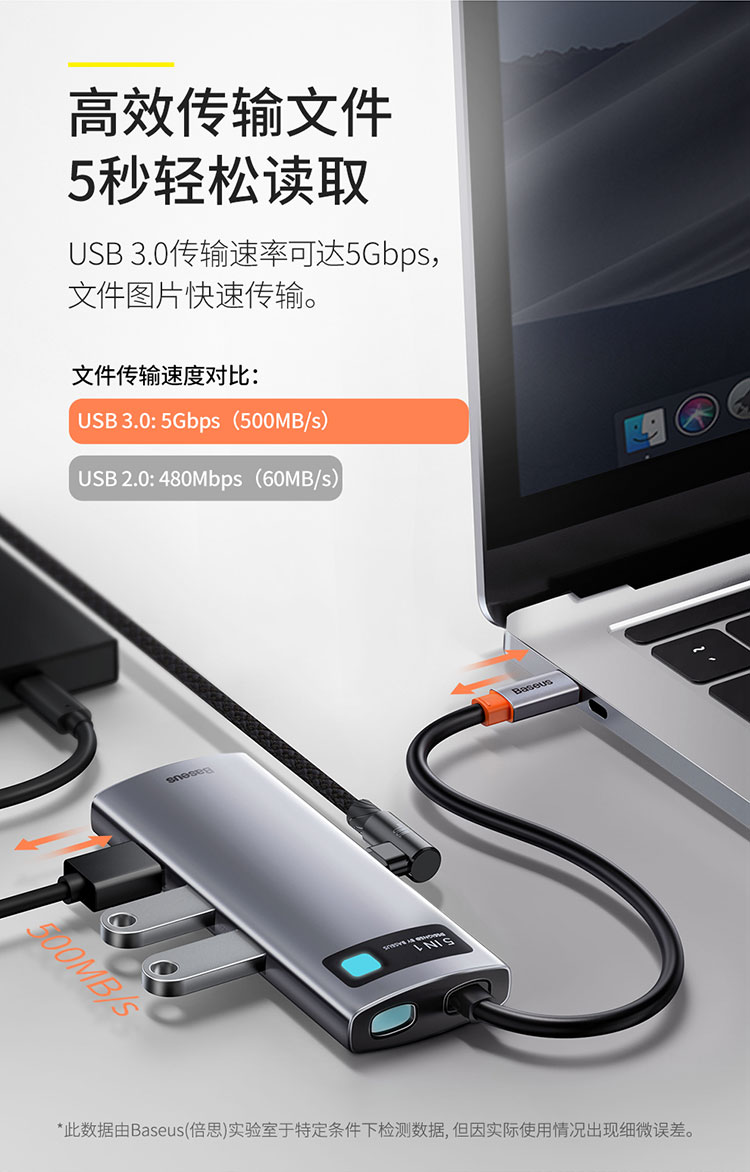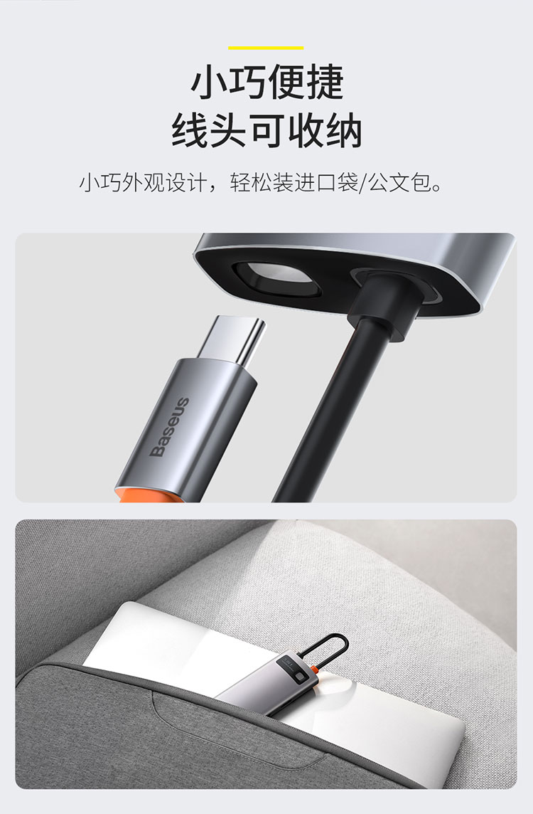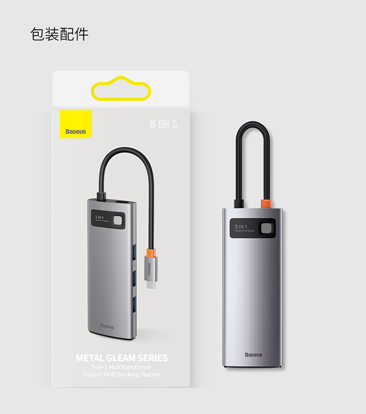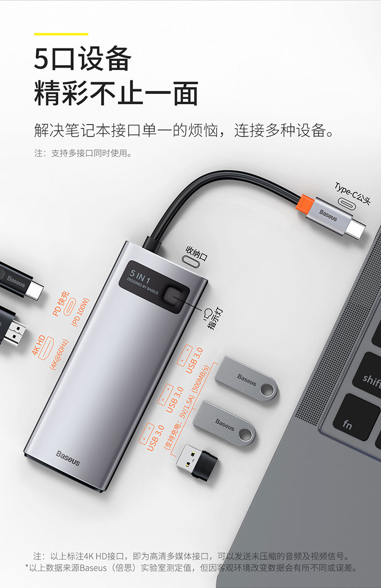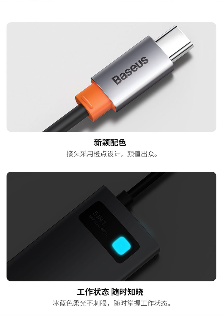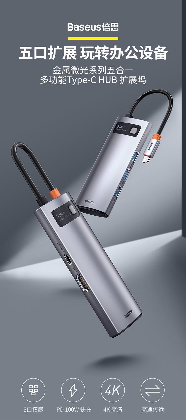 倍思 金属微光系列 五合一多功能Type-C HUB 扩展坞 (Type-C to HDMI*1+USB3.0*3+PD*1)