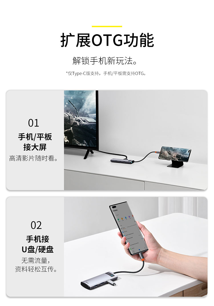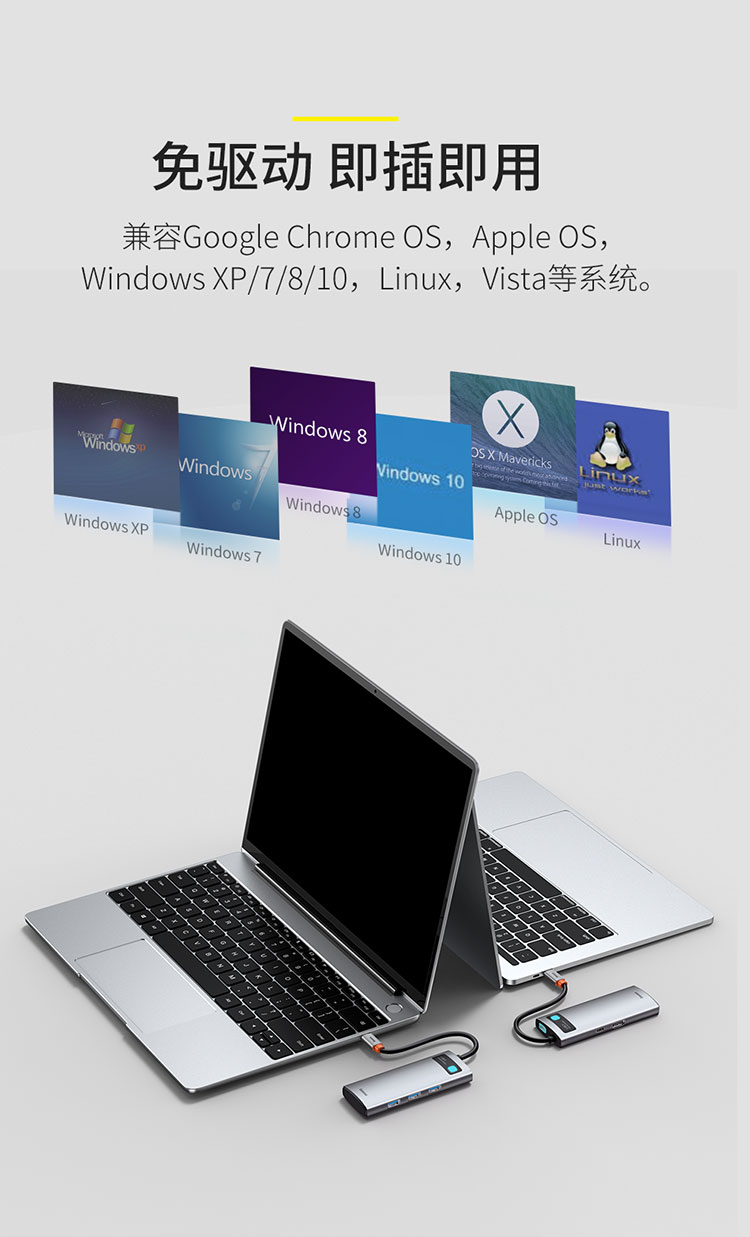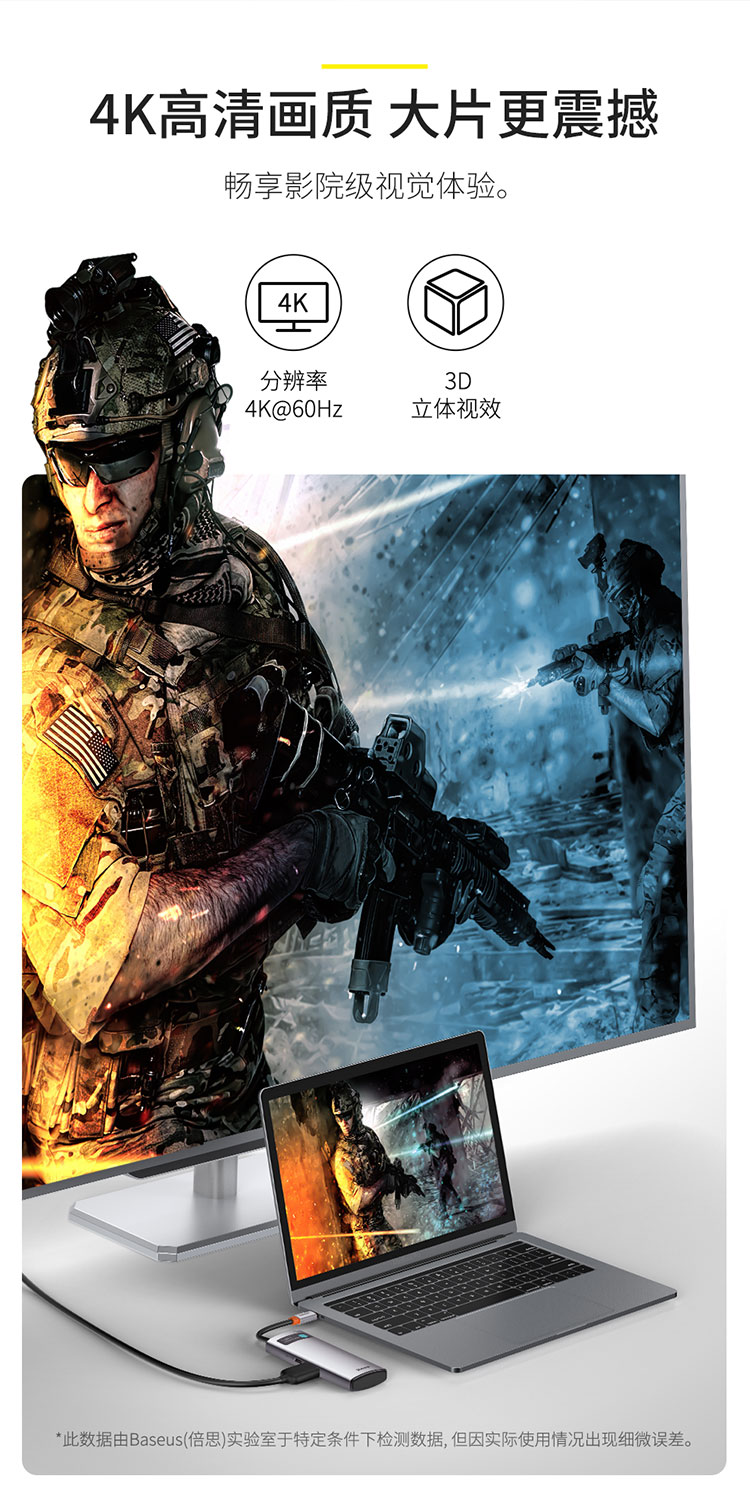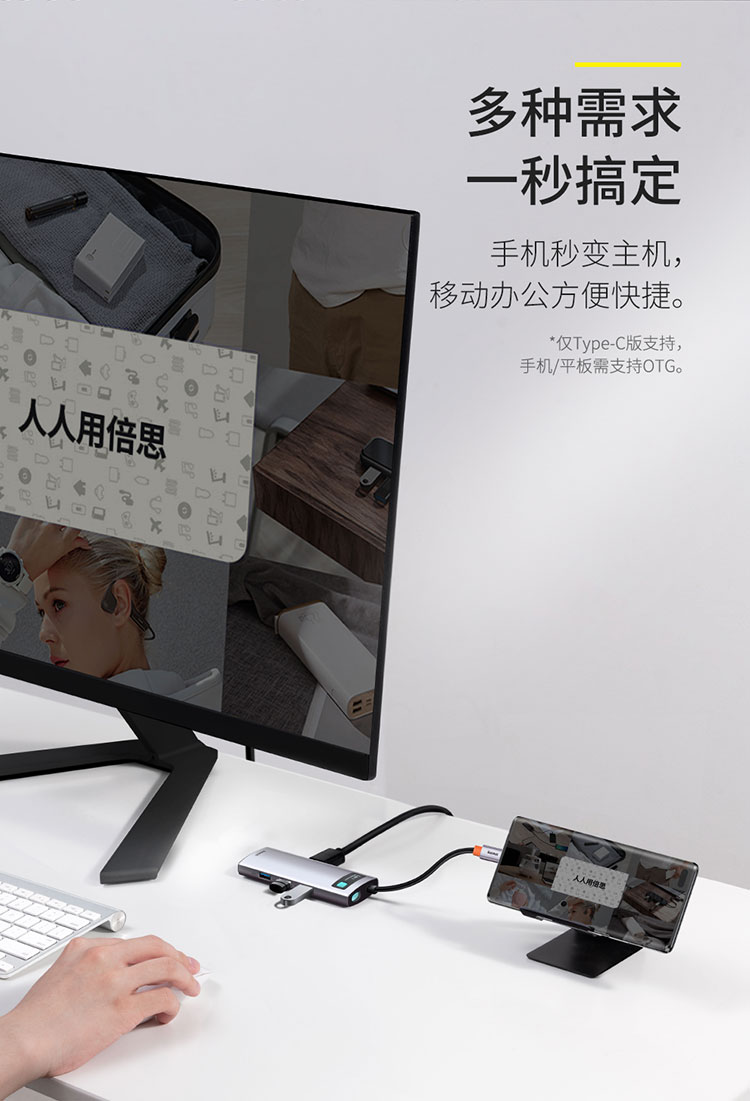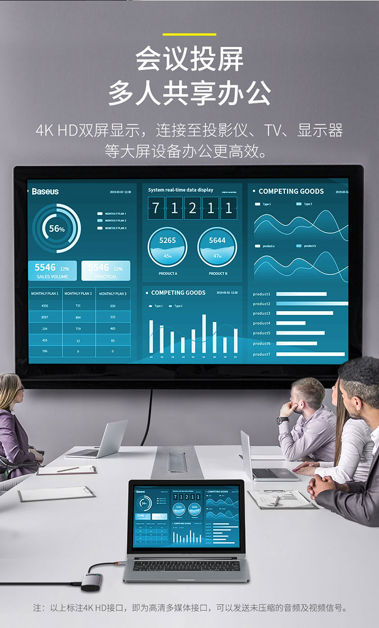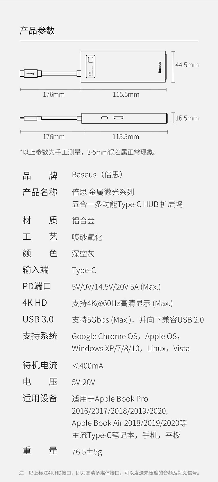 倍思 金属微光系列 五合一多功能Type-C HUB 扩展坞 (Type-C to HDMI*1+USB3.0*3+PD*1)