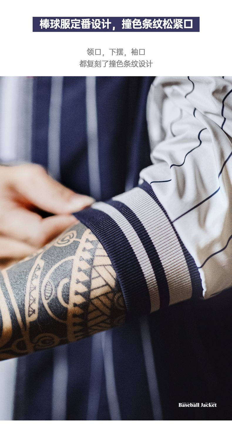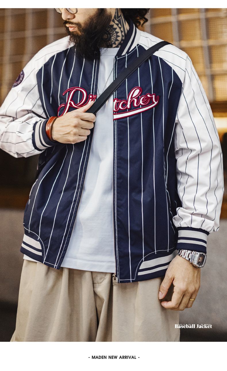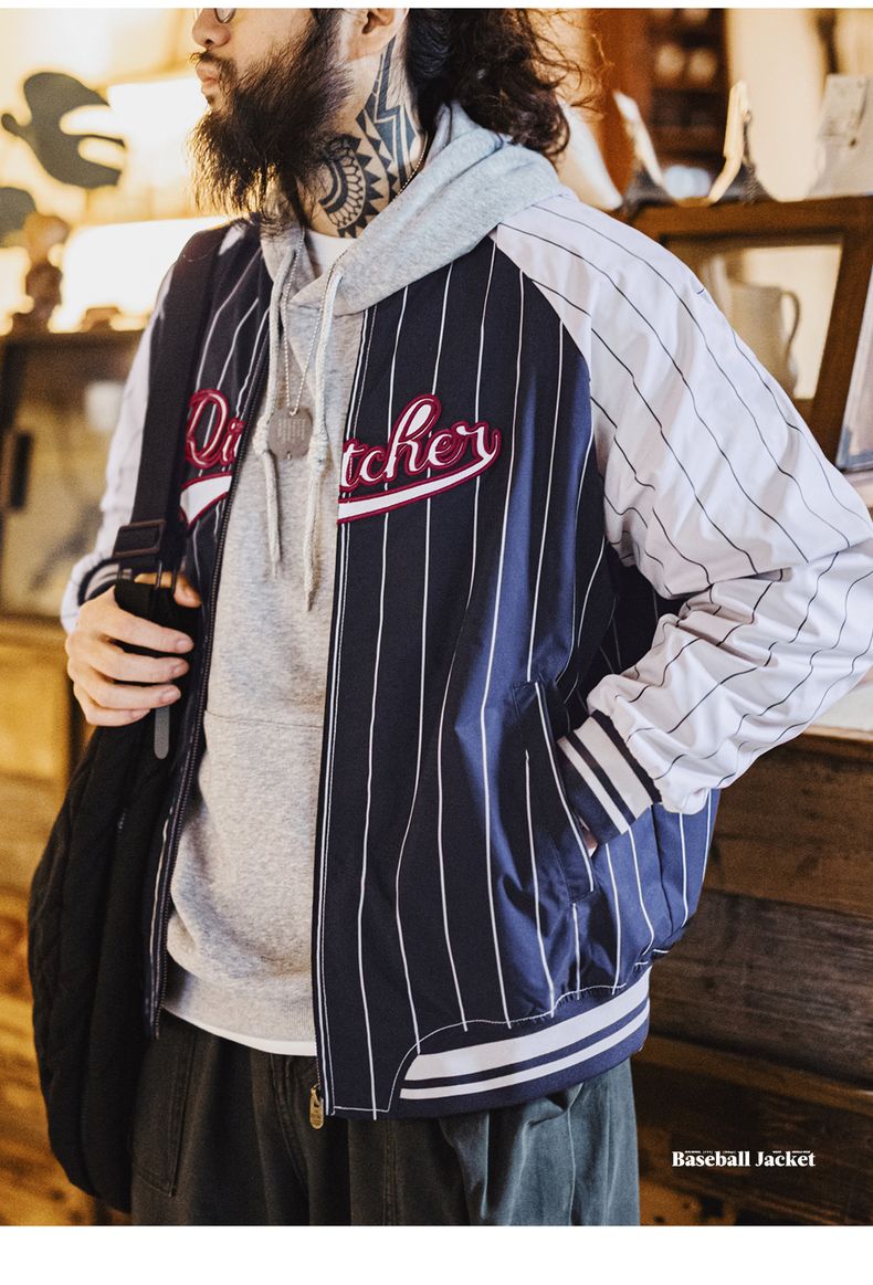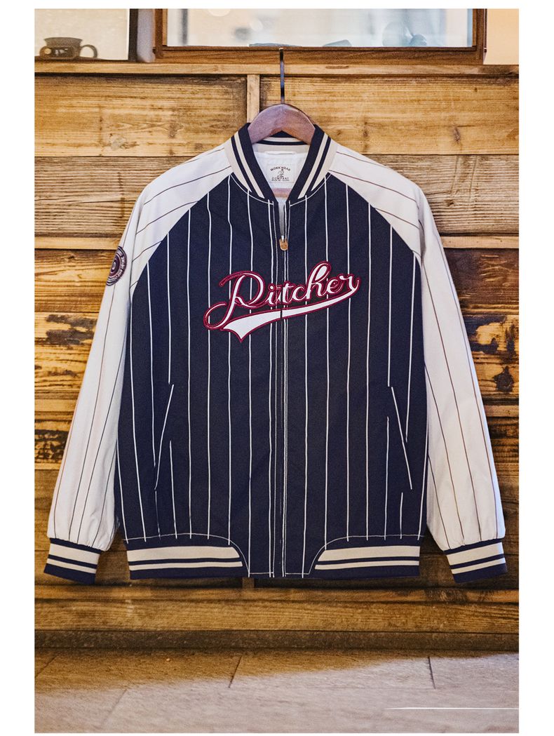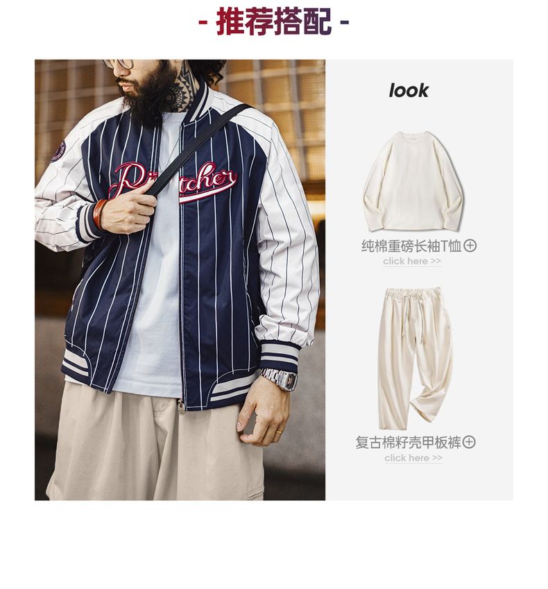 工装优选美式复古条纹棒球夹克字母刺绣徽章撞色拼接休闲外套男春