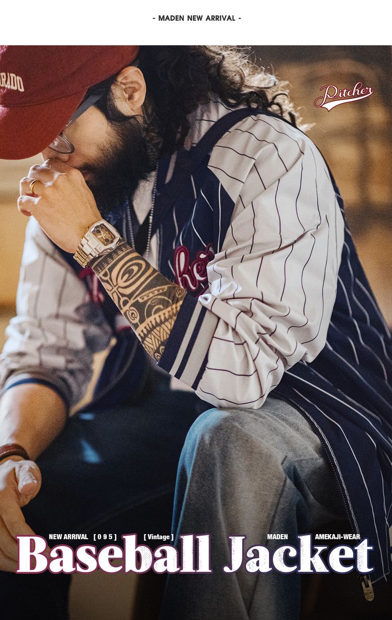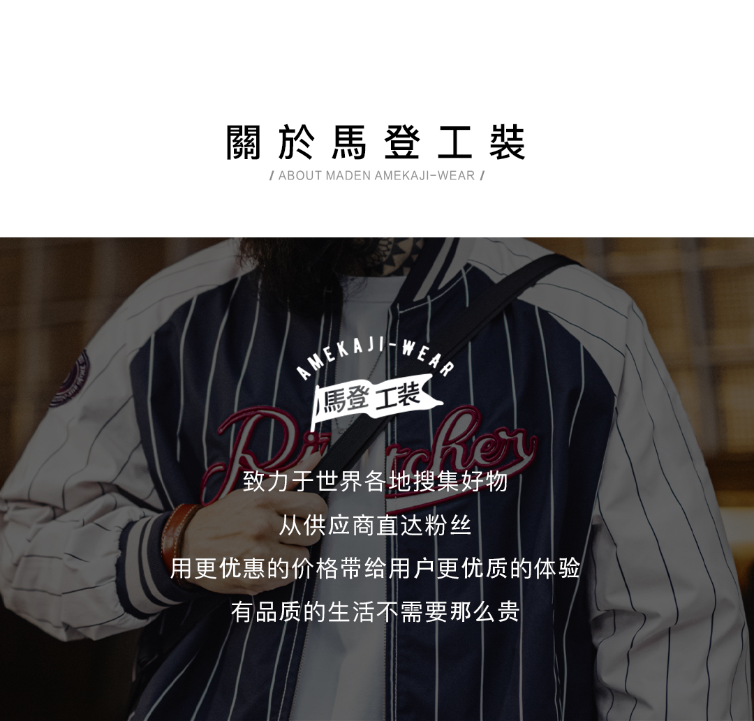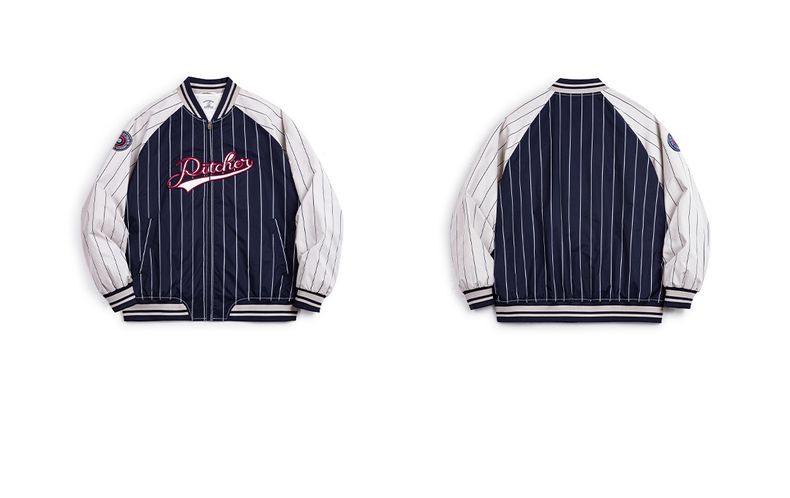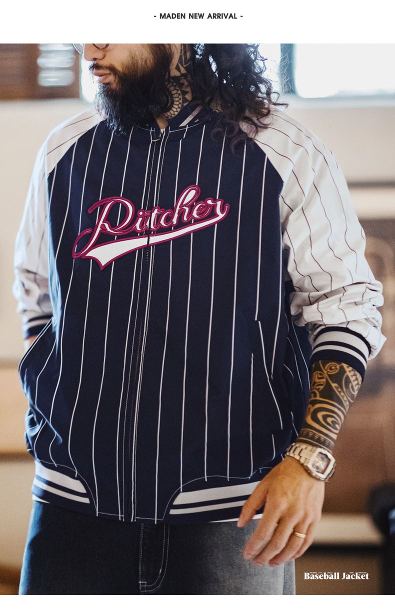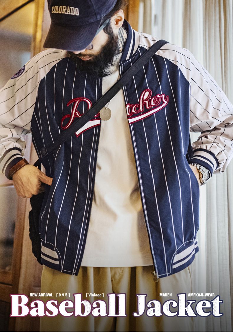 工装优选美式复古条纹棒球夹克字母刺绣徽章撞色拼接休闲外套男春