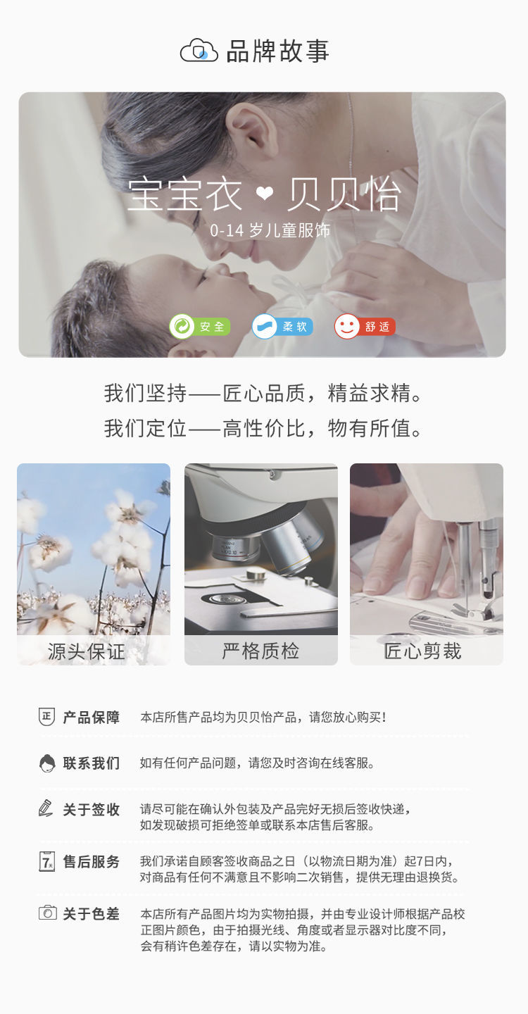 - 贝贝怡专注0-6岁婴幼儿服饰,坚持安全、柔软、舒适的产品理念,为千万中国家庭提供超高品质、安全可靠的婴幼儿服饰产品,妈妈放心,宝宝开心!