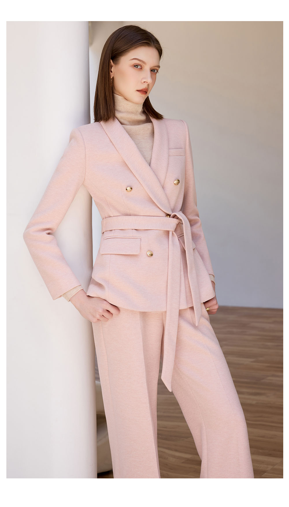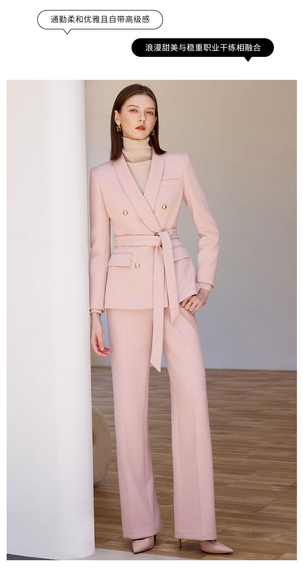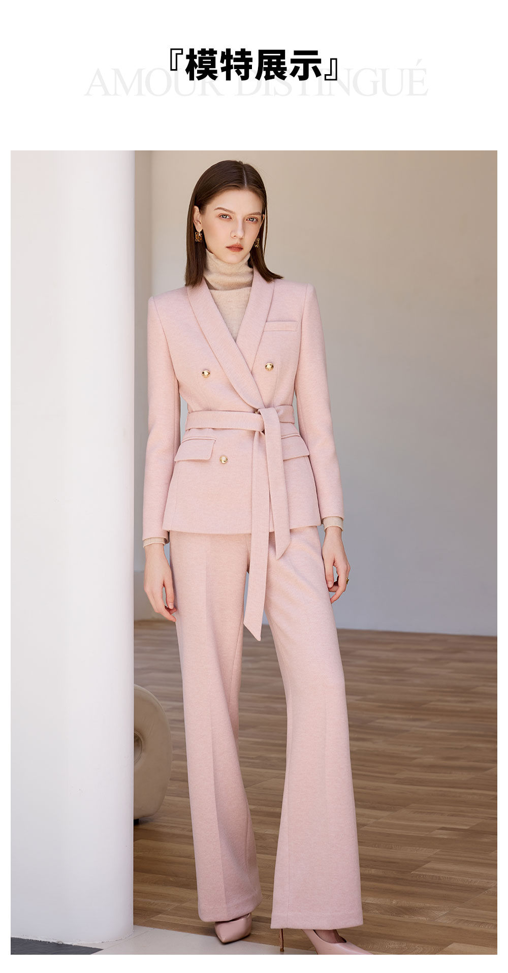 AD粉色西装外套女气质收腰系带羊毛西服正装2025新款呢子阔腿裤