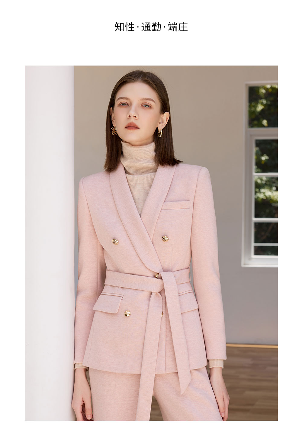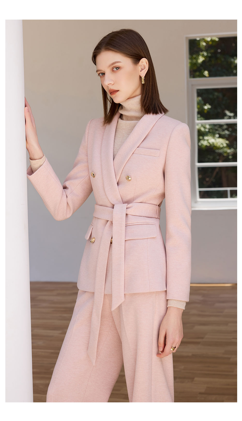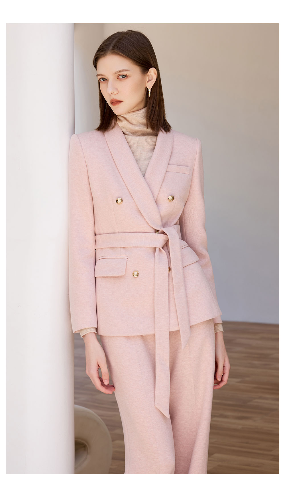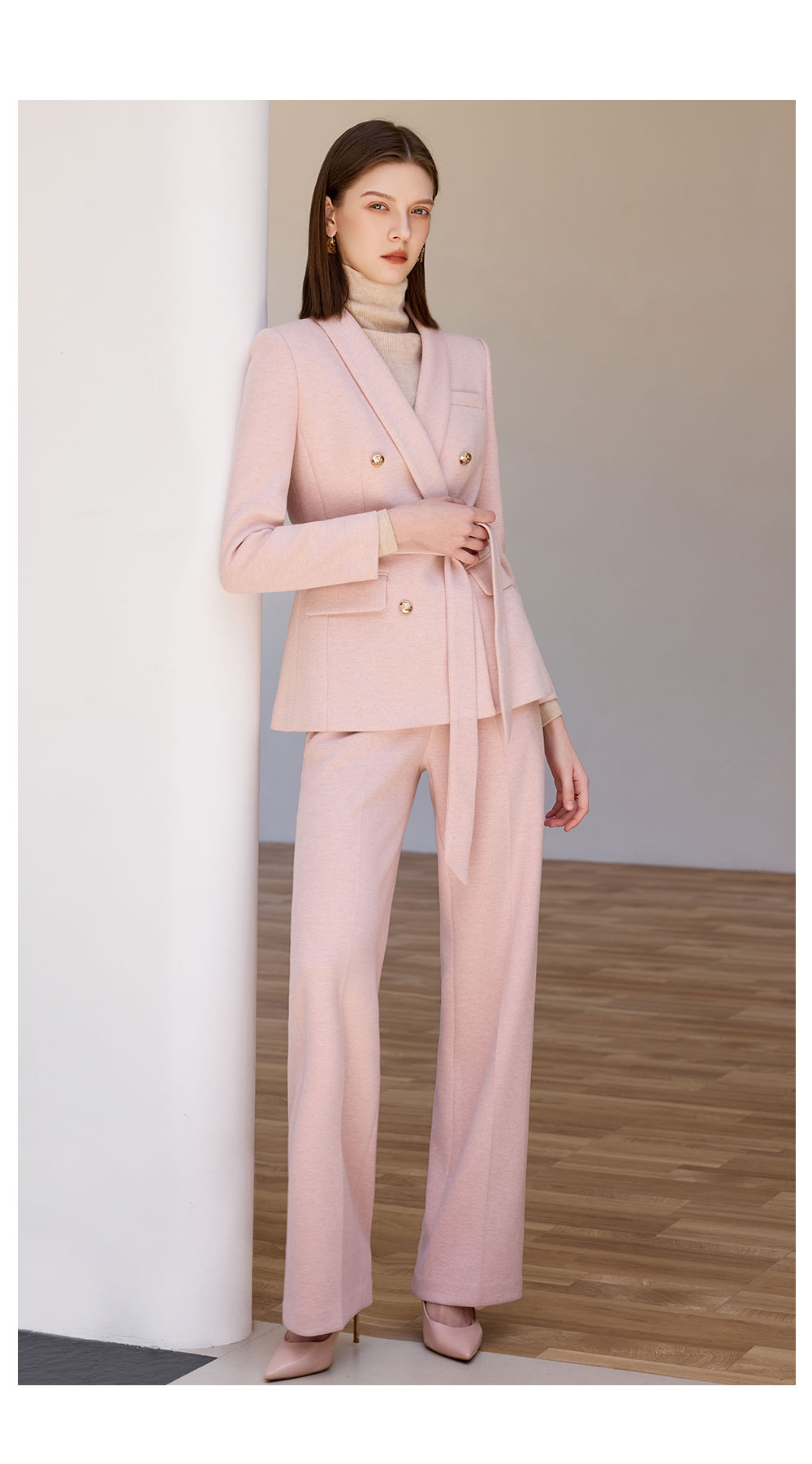 AD粉色西装外套女气质收腰系带羊毛西服正装2025新款呢子阔腿裤
