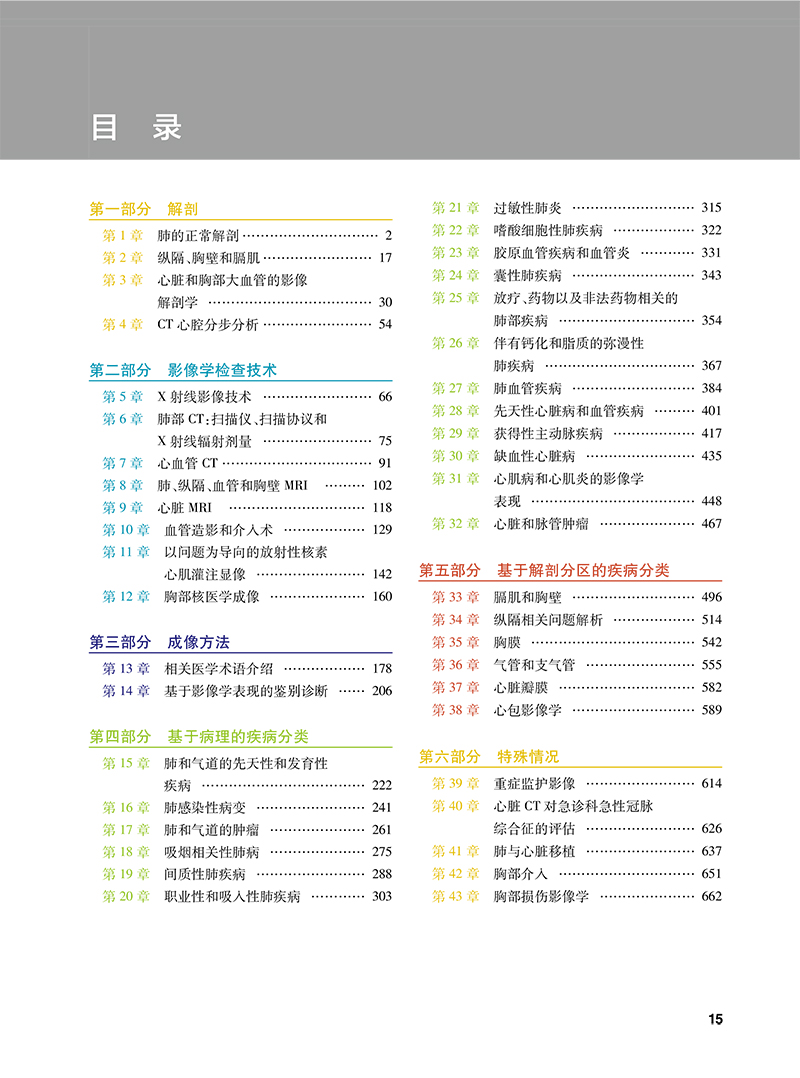 5 专注于胸部影像问题解析所需的核心知识,包括解剖学、成像技术、成像方法、按病理和解剖区域以及特殊情况划分的病种。