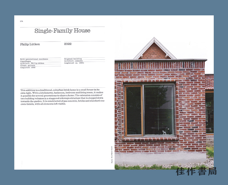 本书收录的案例共计60个,均曾刊登于丹麦期刊《建筑师》或《丹麦建筑》在1996年至2025年这29年间出版的各期中。特别是1990年代中期,由于几个开创性的丹麦项目重新思考了对待既有建筑的基本方式,从而推动该领域此后发生了相当剧烈的演变,因此那段时期具有重要的奠基意义。其中一个关键案例便是亨宁·拉森设计的纽约嘉士伯 Glyptotek 博物馆1998年扩建项目,该项目闻名世界。这些实践为丹麦建筑师积累了丰富的洞察力和技术知识,使他们为应对当今气候变化要求建筑可回收利用的现实做好了充分准备。范例的力量在此至关重要——因此我们精选了一批杰出项目,并决定将其汇集成册出版。最后,本书还收录了阿尔伯特·阿尔格伦-彼得森撰写的文章《房子永远不会完工》,文章指出,作为长期可持续性战略的一部分,我们需要重新关注古锈(时间的痕迹)。