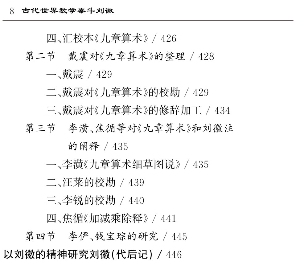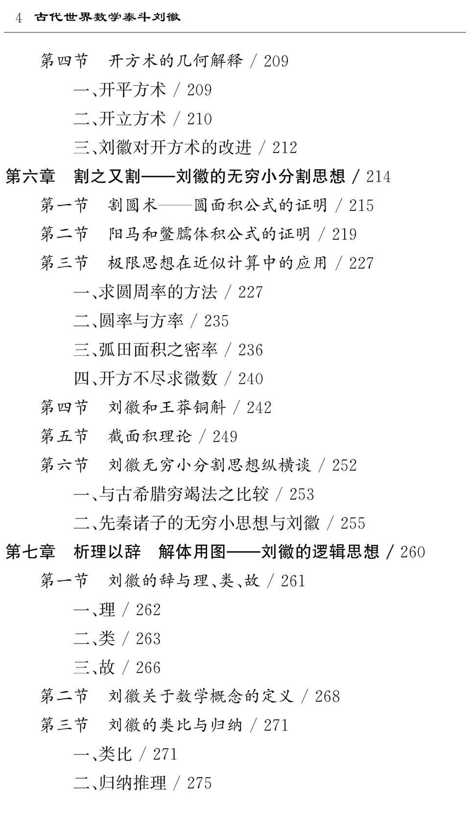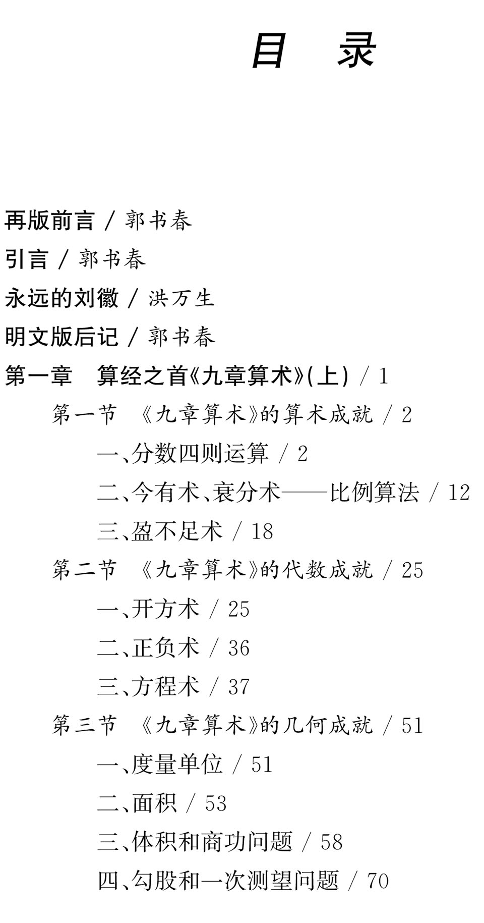刘徽的《九章算术注》是中国古代最伟大的数学家为最重要的数学著作所作的注。本书全面评介《九章算术》和刘徽的数学成就,重在刘徽的数学思想、数学理论、逻辑思想,兼及中国古代数学的特色、《九章算术》的版本和校勘等问题。从中可以看出中国古代数学以数量关系的研究为主、以计算为中心的鲜明特点,这种思想和方法对当今的数学研究和数学教学有极大的启迪作用。