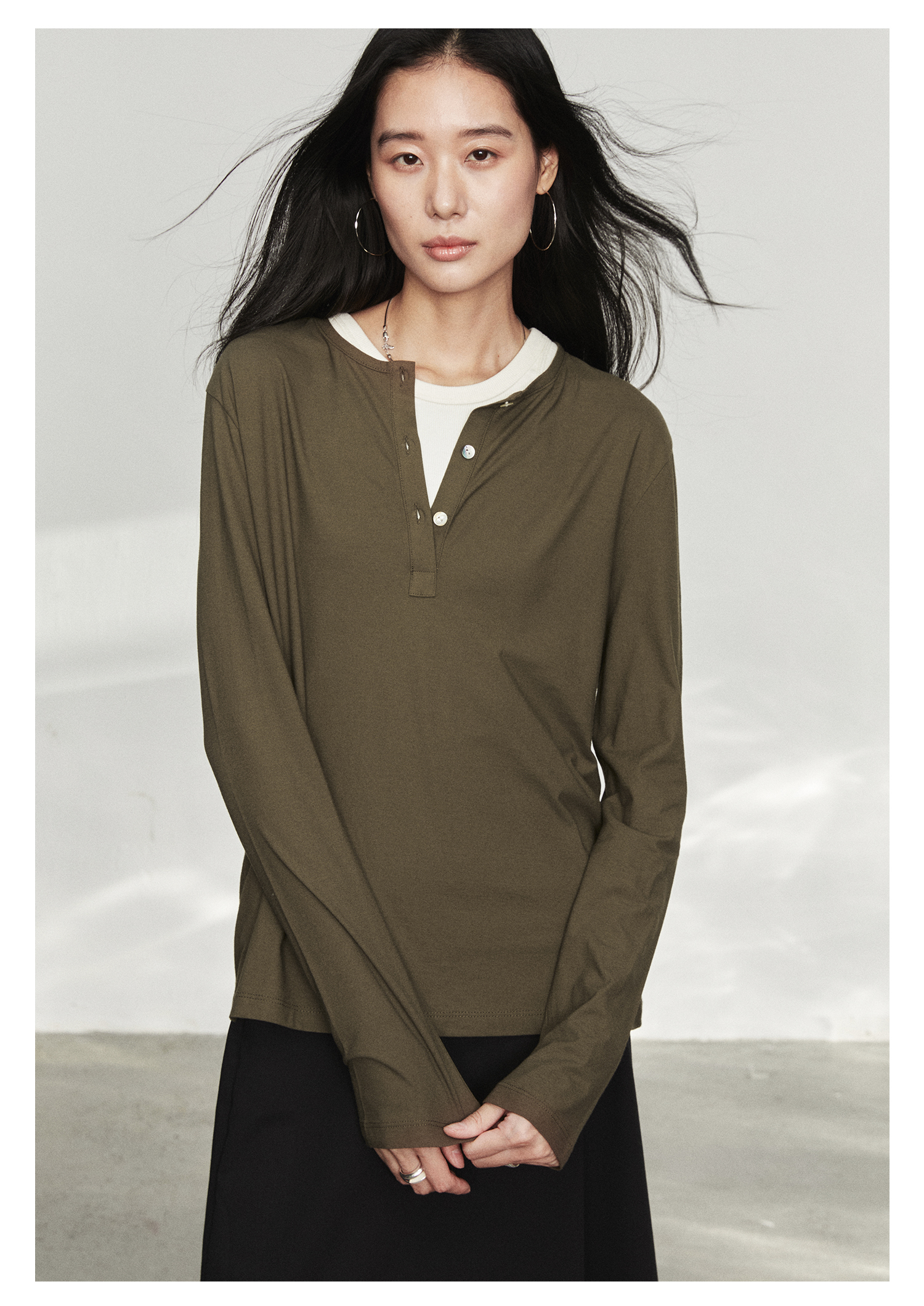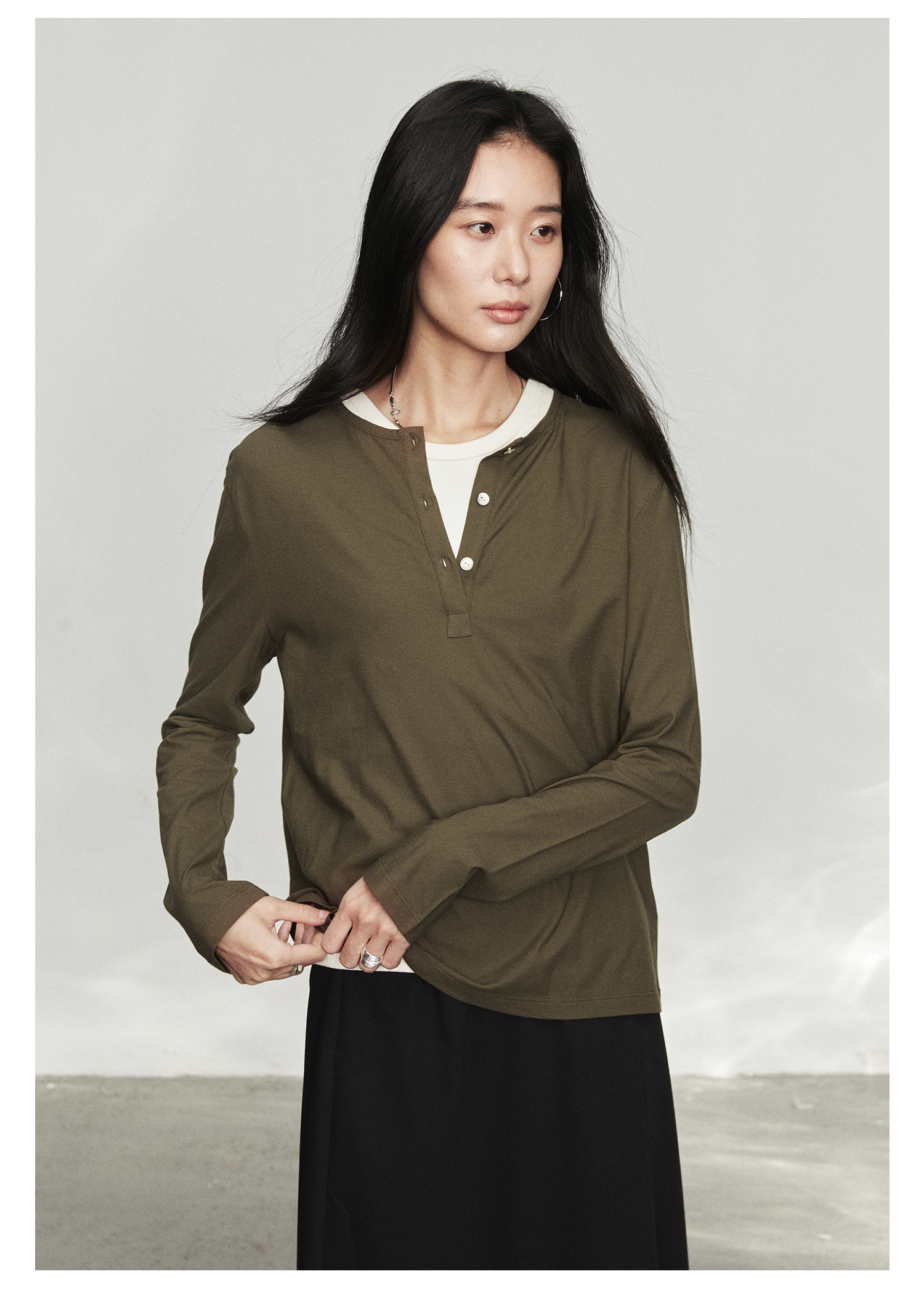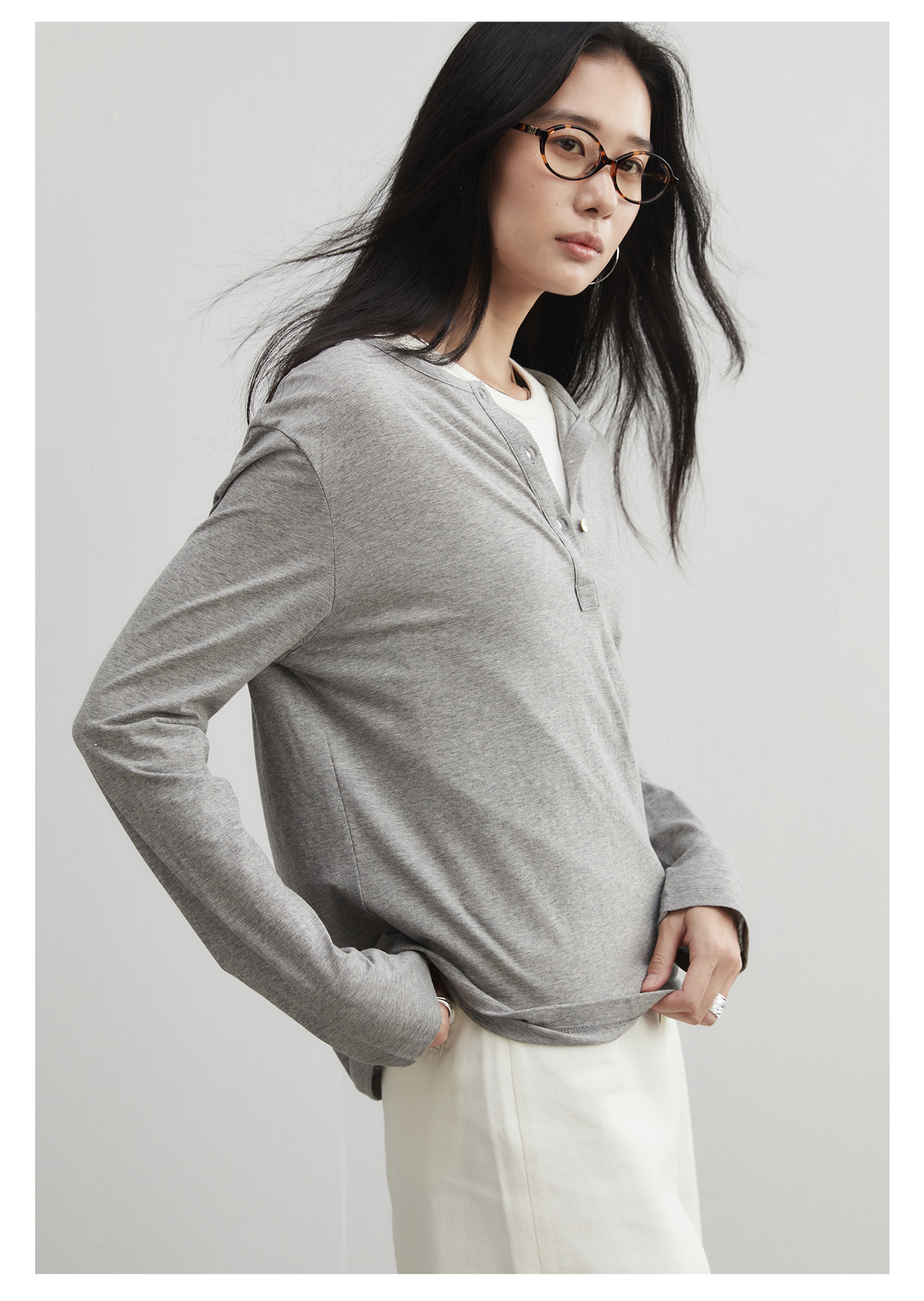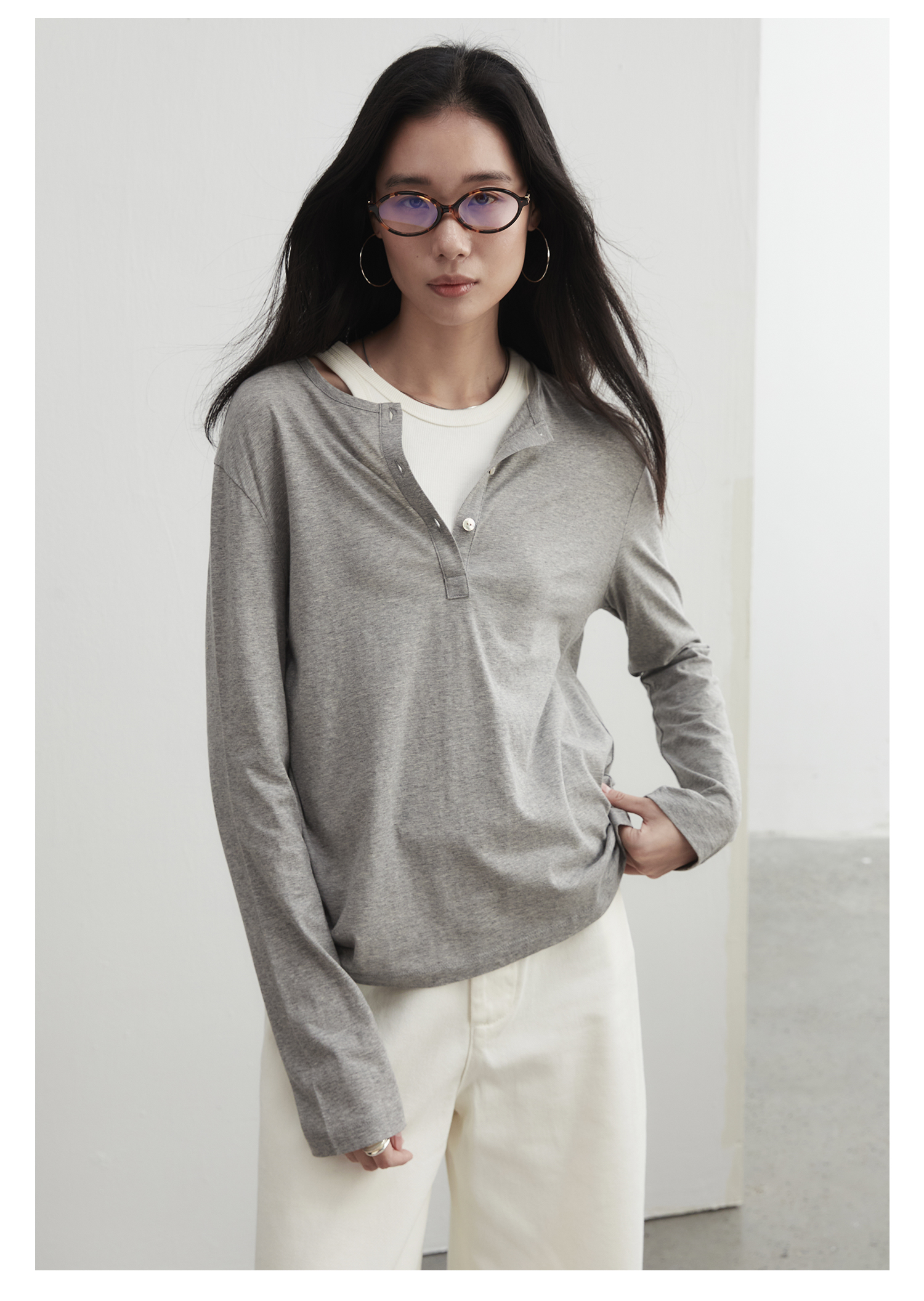 棉仓3561501002-秋装新中式亨利零长袖T恤 松弛感宽松设计感上衣打底衫