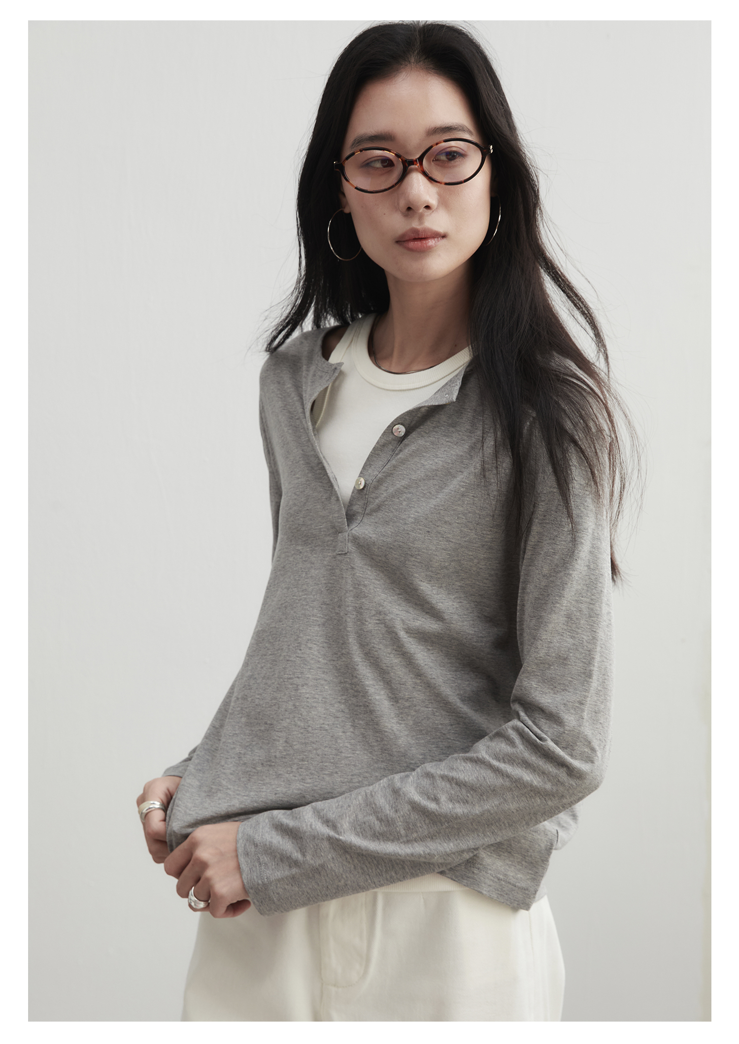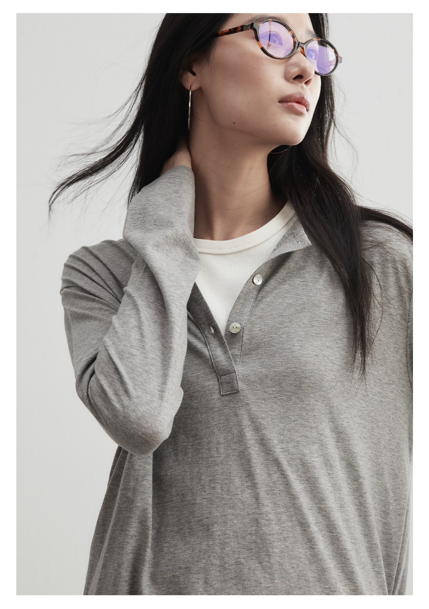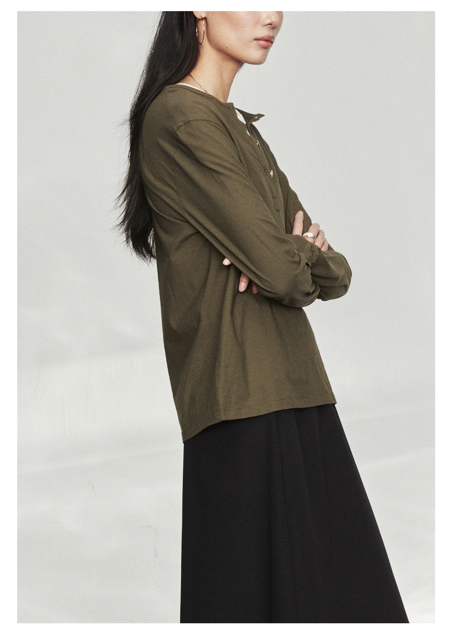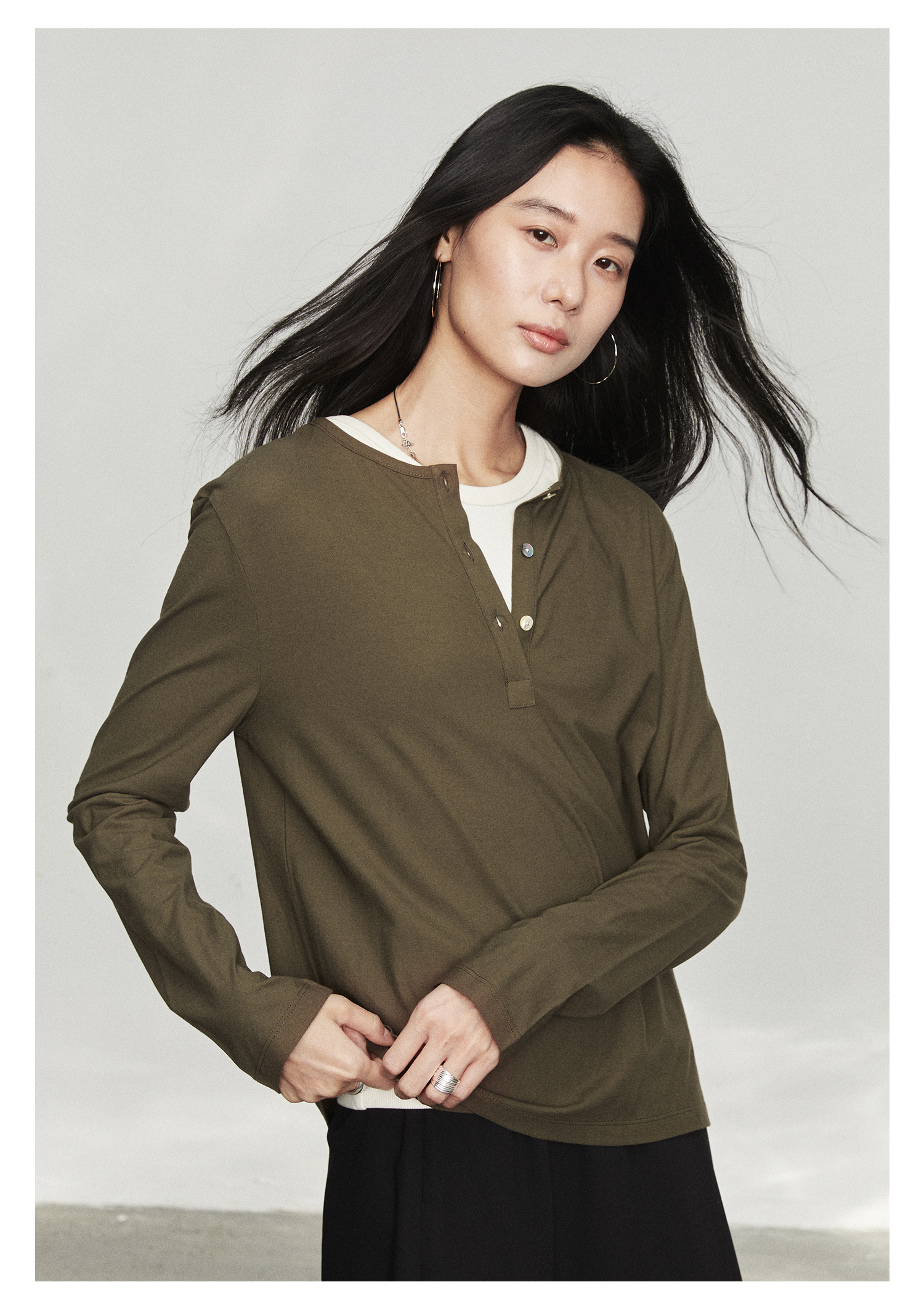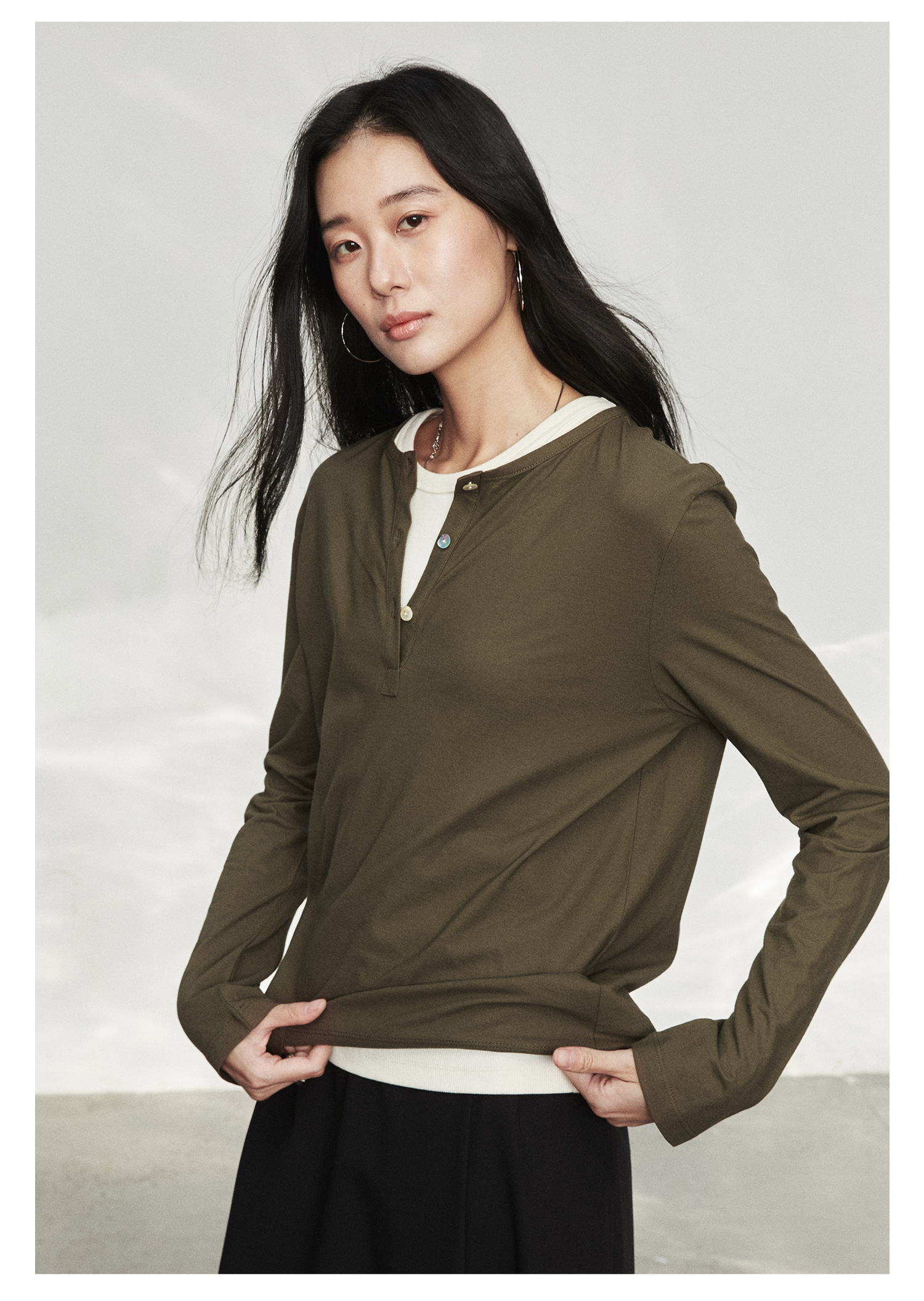 棉仓3561501002-秋装新中式亨利零长袖T恤 松弛感宽松设计感上衣打底衫