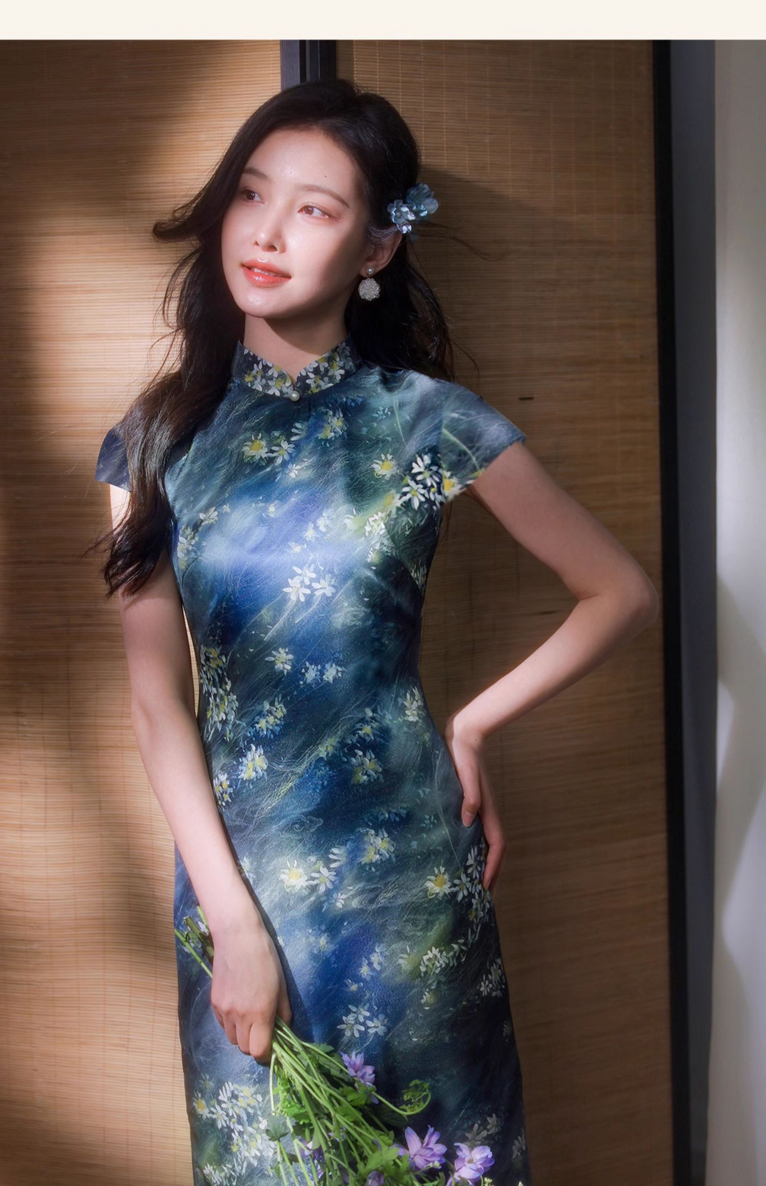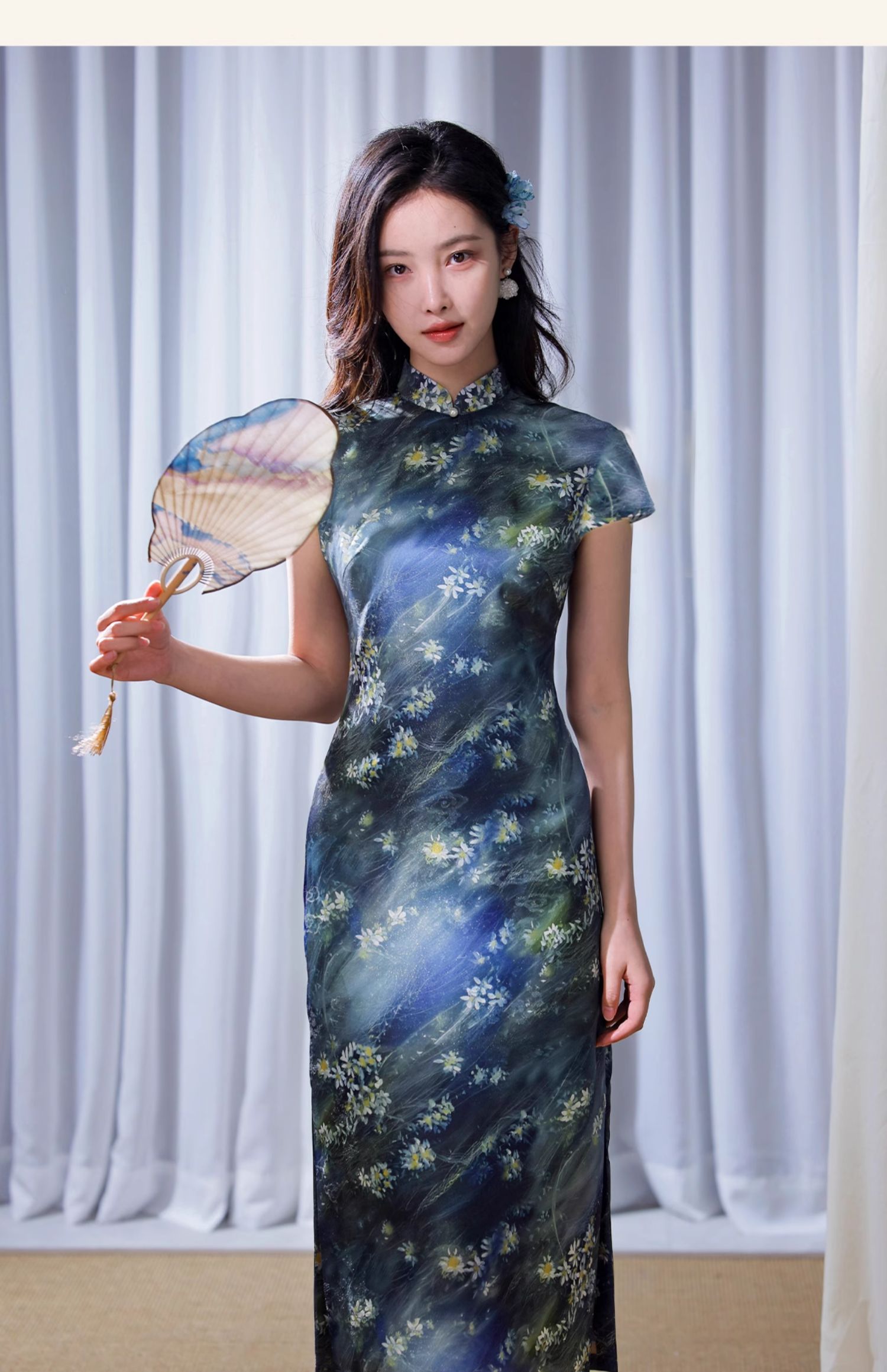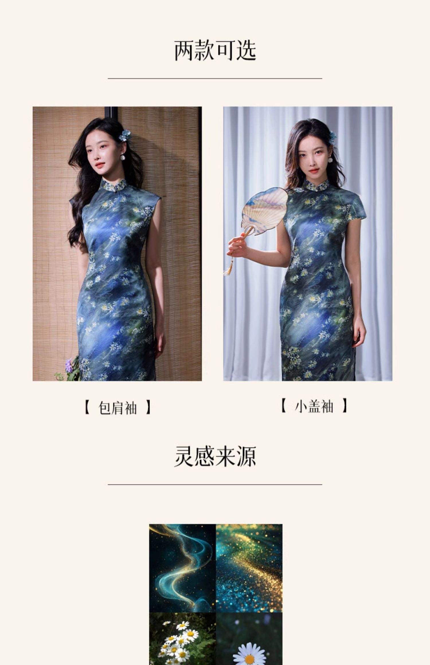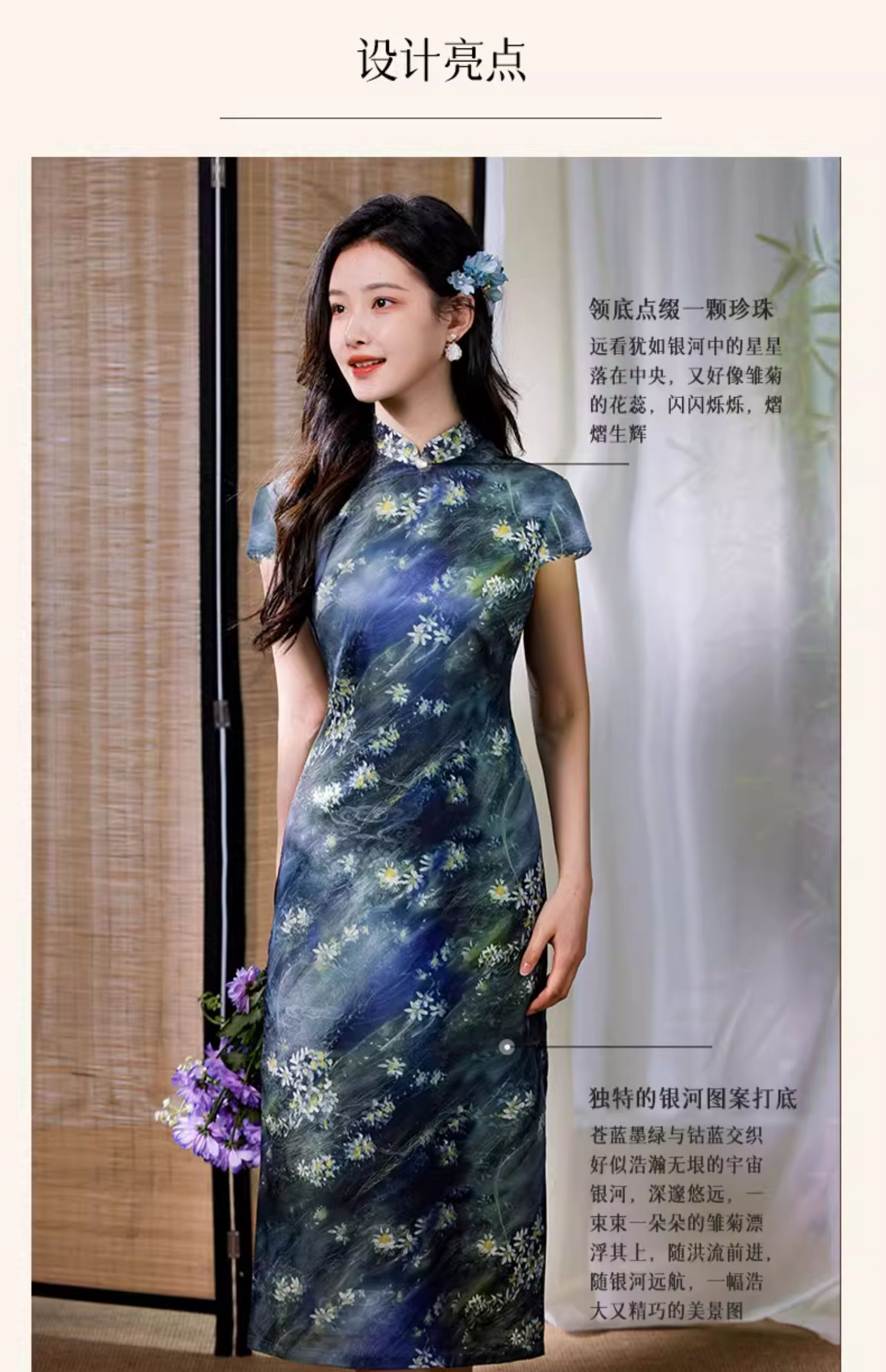 逸红颜彗予2025夏新款略宽松有腰身版金绫缎银河雏菊松弛感长旗袍