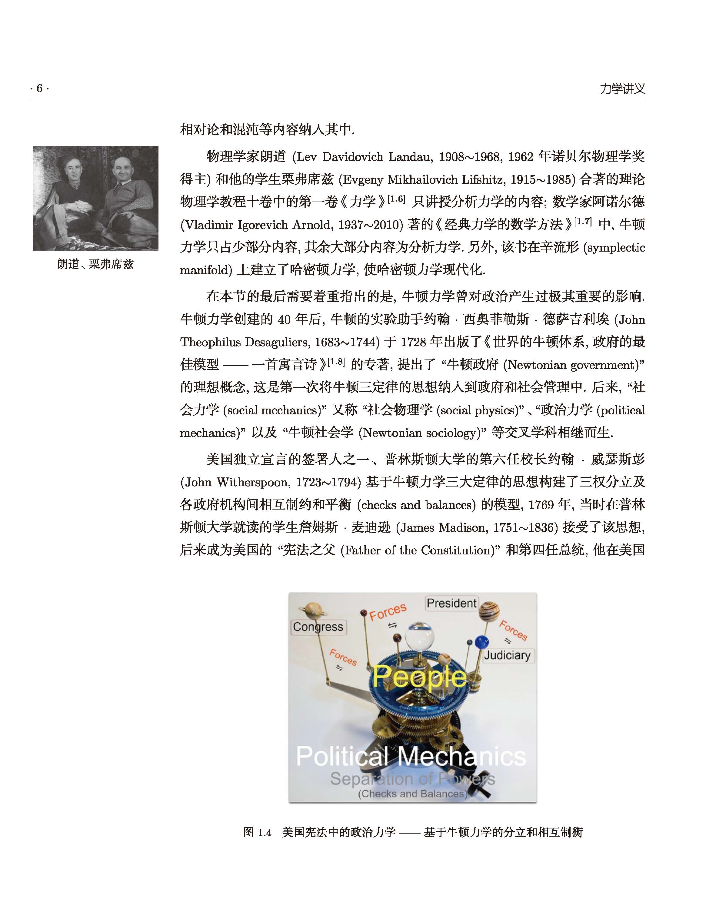 物理学家朗道(Lev Davidovich Landau,1908 )1968,1962年诺贝尔物理学奖得主)和他的学生栗弗席兹(Evgeny Mikhailovich Lifshitz,1915~1985)合著的理论物理学教程十卷中的第*卷《力学》只讲授分析力学的内容:数学家阿诺尔德(Vladimir Igorevich Arnold,1937~2010)著的《经典力学的数学方法》[17]中,牛顿力学只占少部分内容,其余大部分内容为分析力学.另外,该书在辛流形(symplectic manifold)上建立了哈密顿力学,使哈密顿力学现代化.