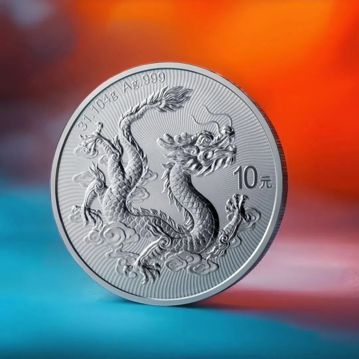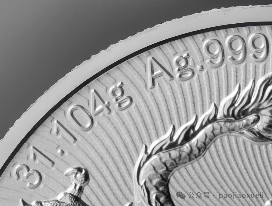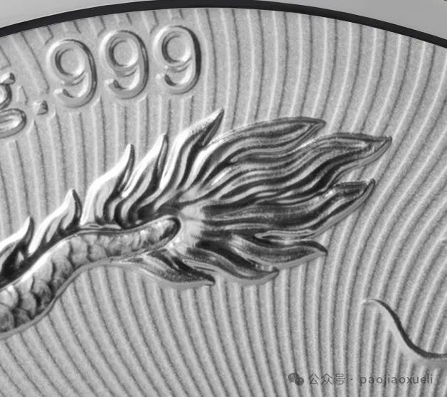 背面:币面上一条浮雕的中国龙宛如腾空而起,四周有面值、克重、Ag.999(足银)等字样。