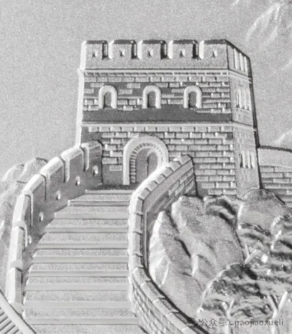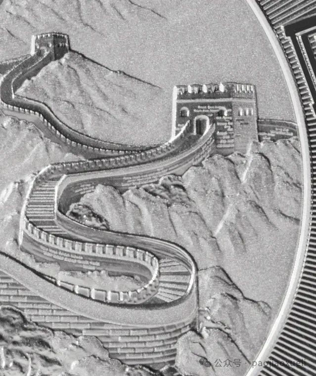 正面:币的中央图案为蜿蜒的万里长城,具有浮雕的质感,币的边缘刻有国名+激光雕刻年号,非常大气!