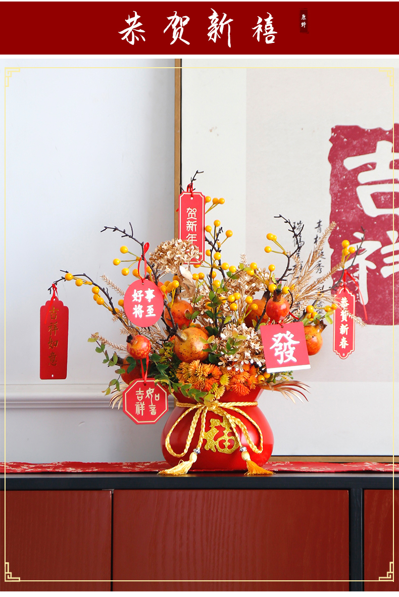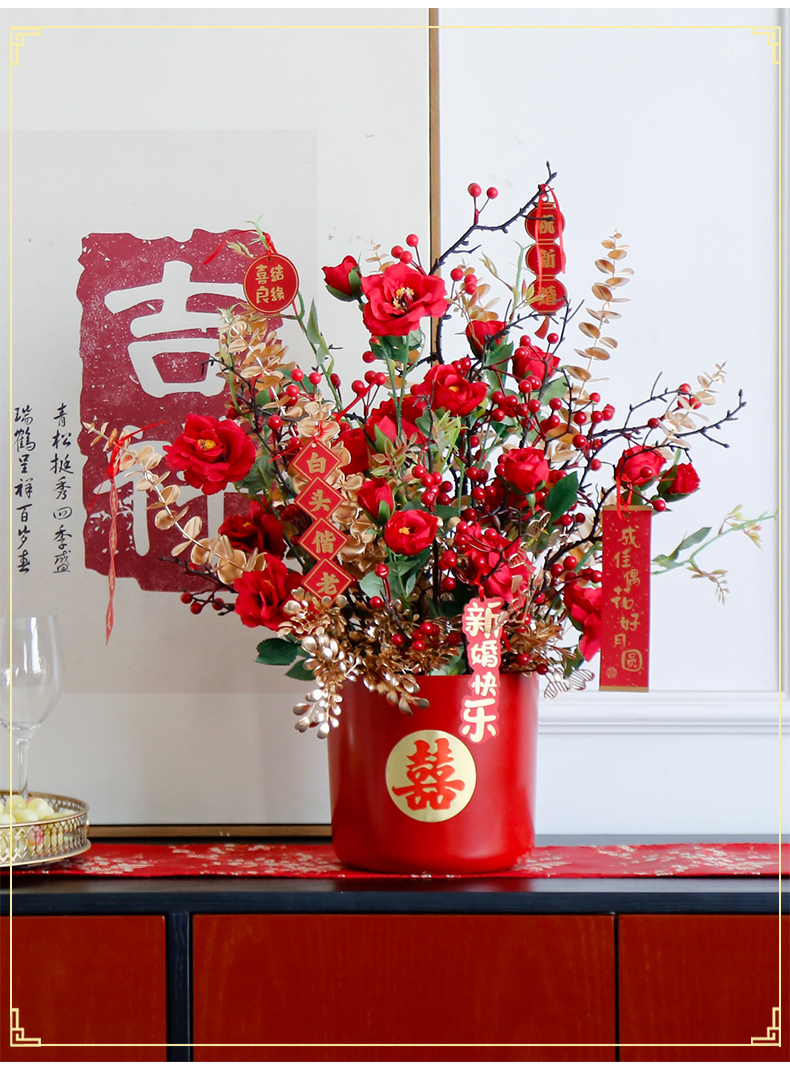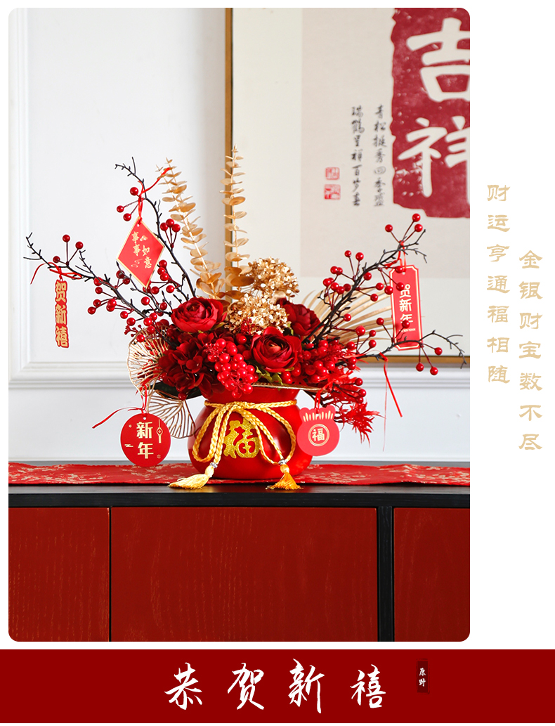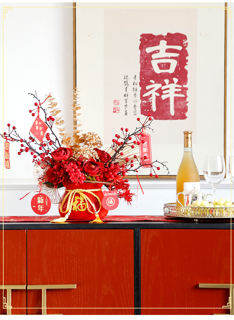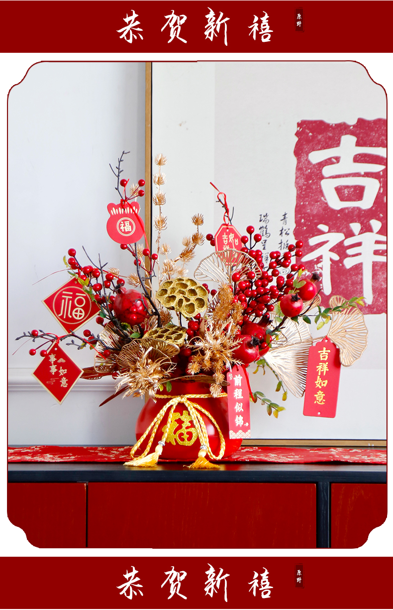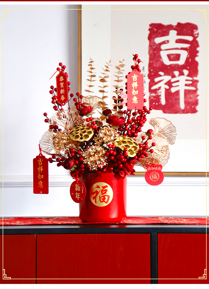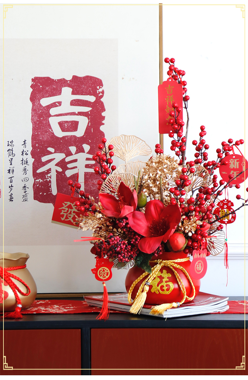 红色发财果仿真花福桶摆件客厅开业乔迁新居高档新房年宵花装饰品