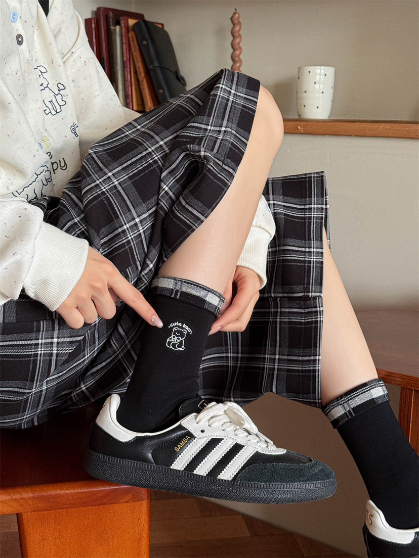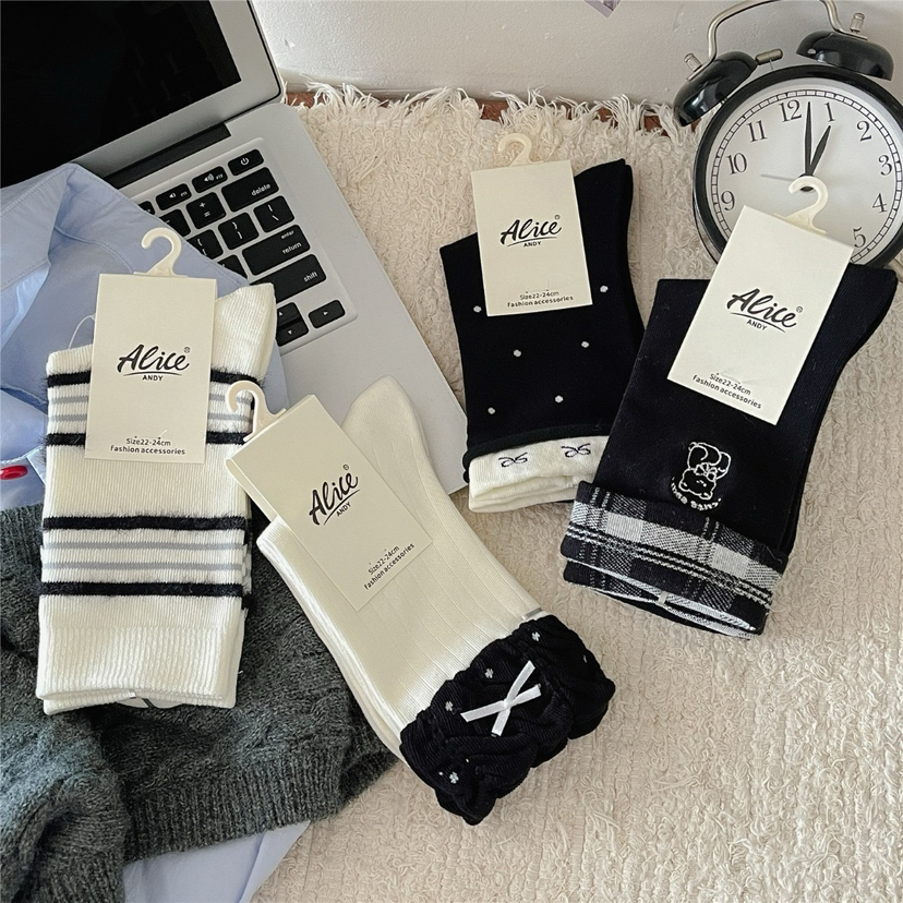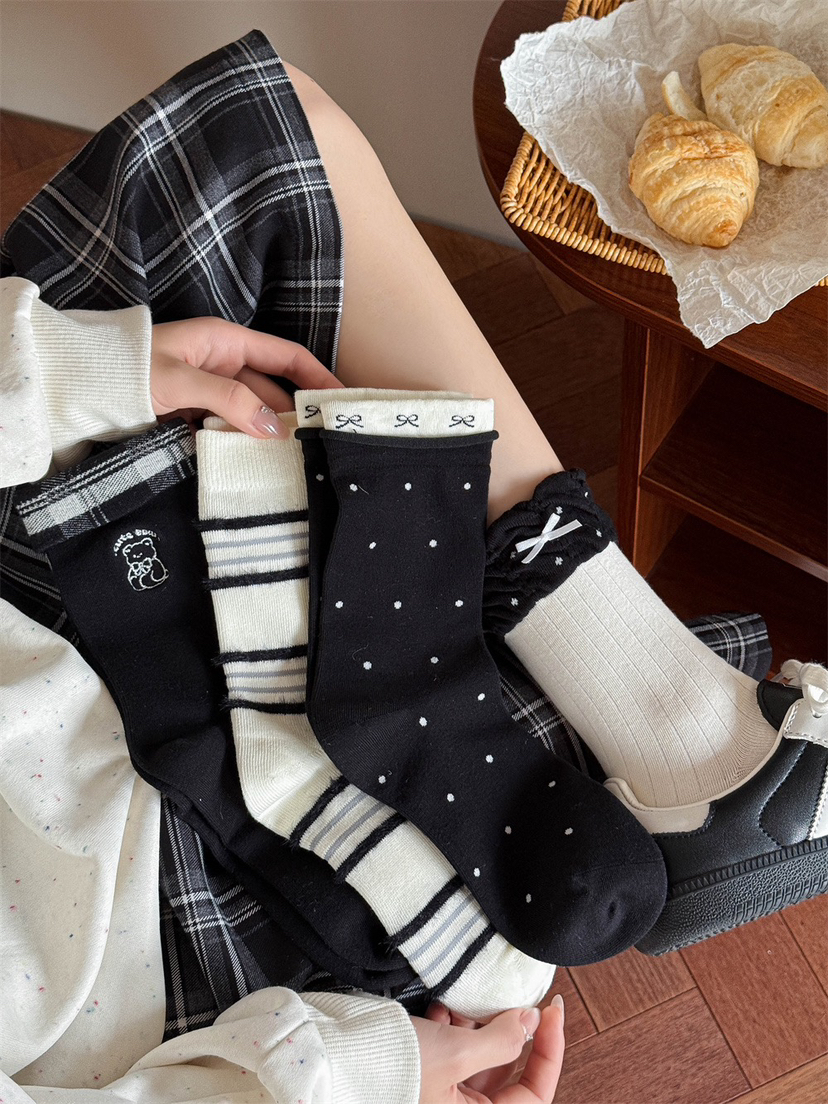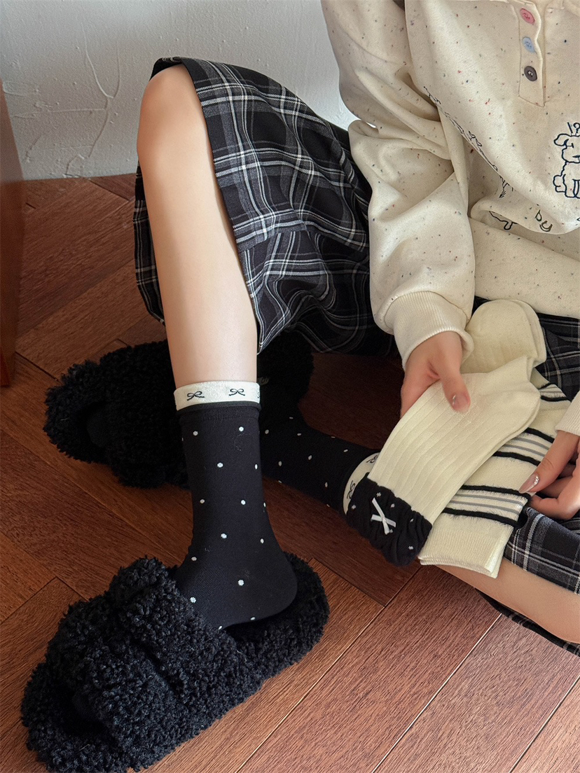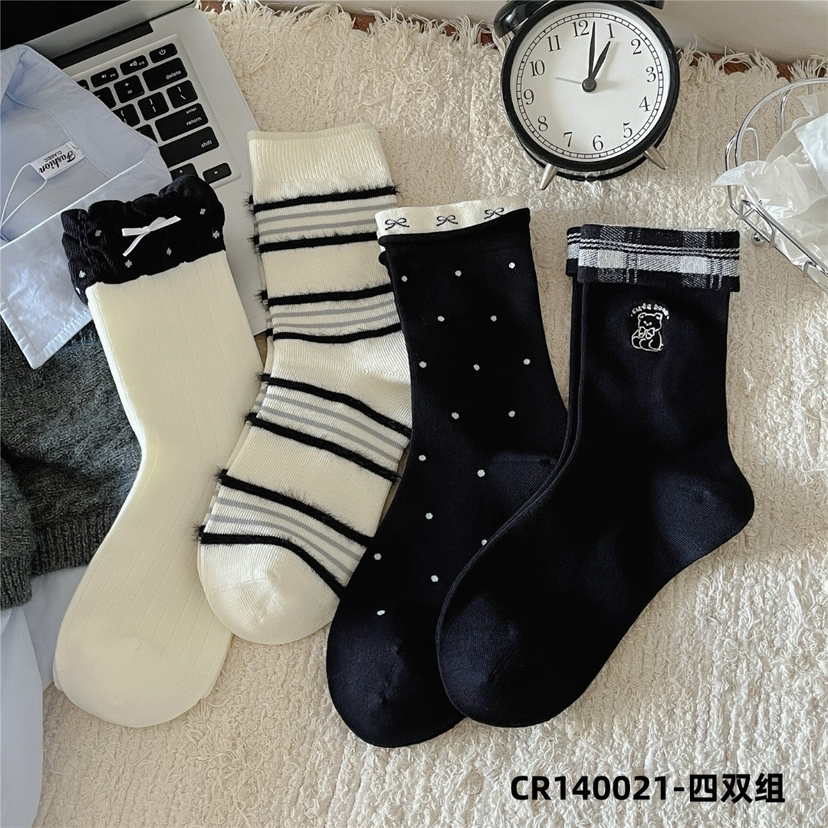 4双一组!2025秋冬无骨袜 小熊miu系蝴蝶结黑白色女袜中筒袜 高密度一体机织造 袜头无骨缝合柔软舒适