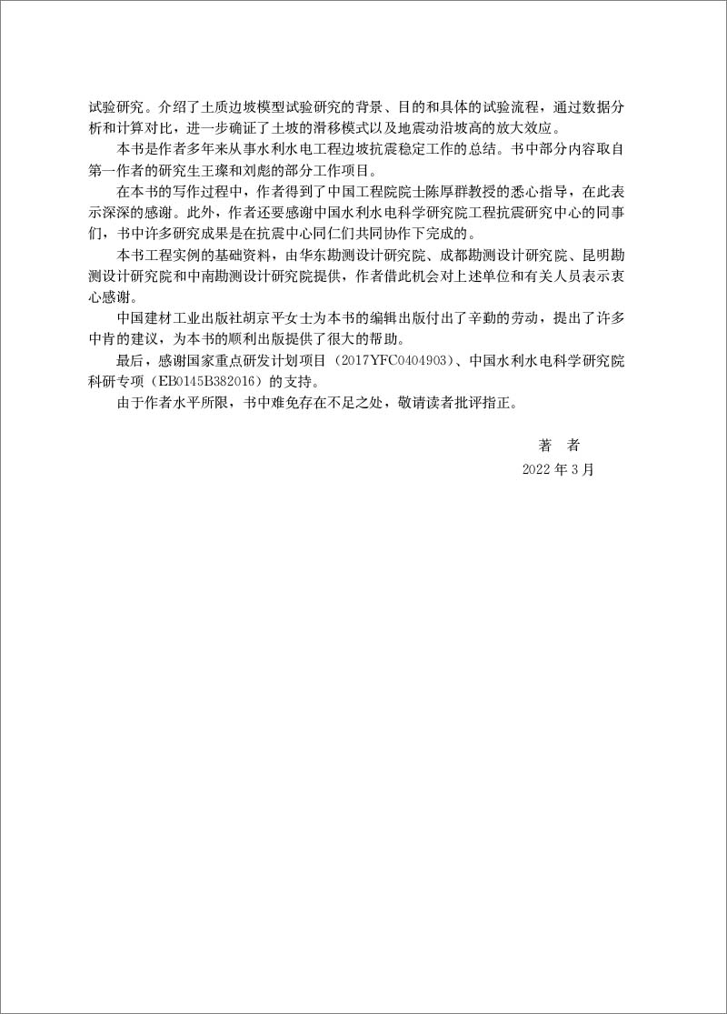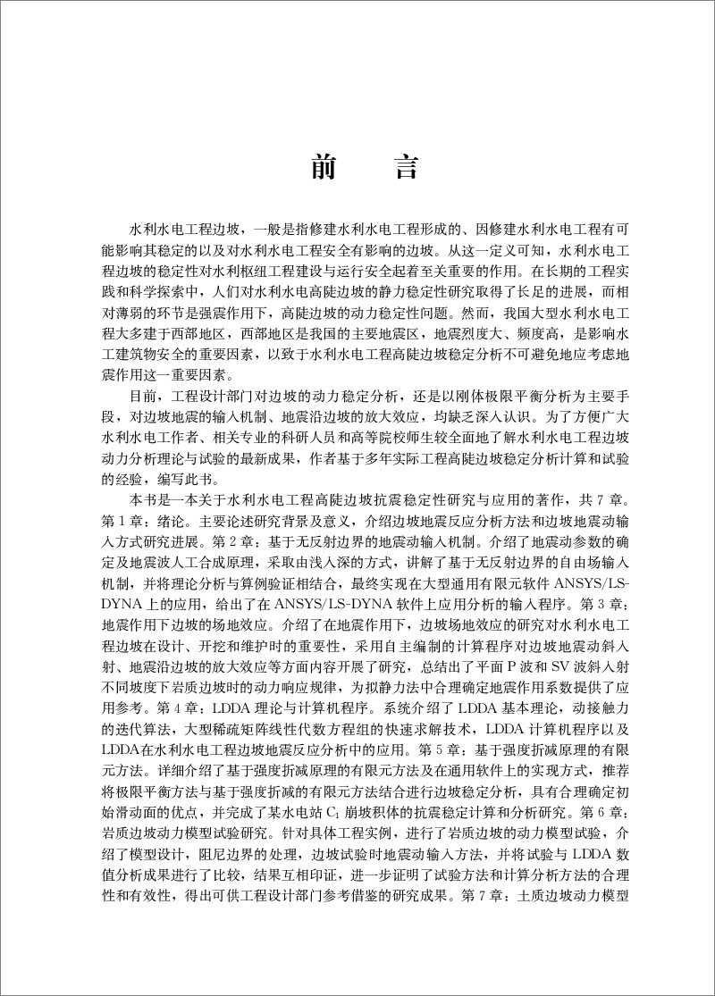本书的作者有中国水利水电科学研究院的工程抗震研究中心团队的核心成员,他们在承担国家重点科技攻关项目、部重点项目、国家自然科学基金项目、研究解决重大水利水电工程抗震问题中攻坚克难,取得了一些结合工程实例、深入探索和研究边坡抗震的重要科研成果。多年来他们基于为解决实际工程中高陡边坡抗震稳定问题所进行的分析计算和振动台模型试验研究的成果和经验,撰写了这部《国家重大水利水电工程边坡抗震分析理论与试验研究》著作,以支撑和实施国家为保障人民生命财产安全和社会经济安全可持续发展的防灾减灾重大战略需求为导向的、对重大水利水电工程高陡边坡抗震安全评价为目标的研究。该书为国家重大水利水电工程高陡边坡抗震设计提供了重要参考,并推动了对其抗震安全深化研究的学科发展。