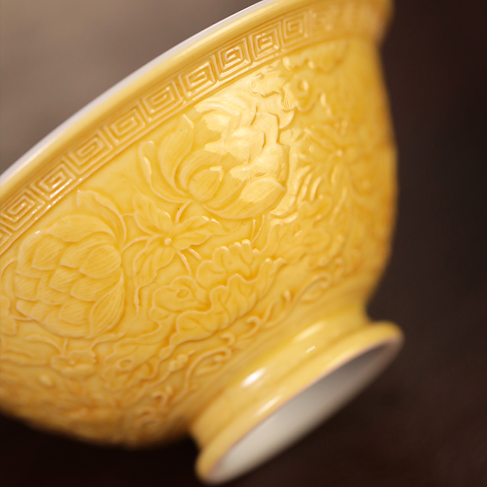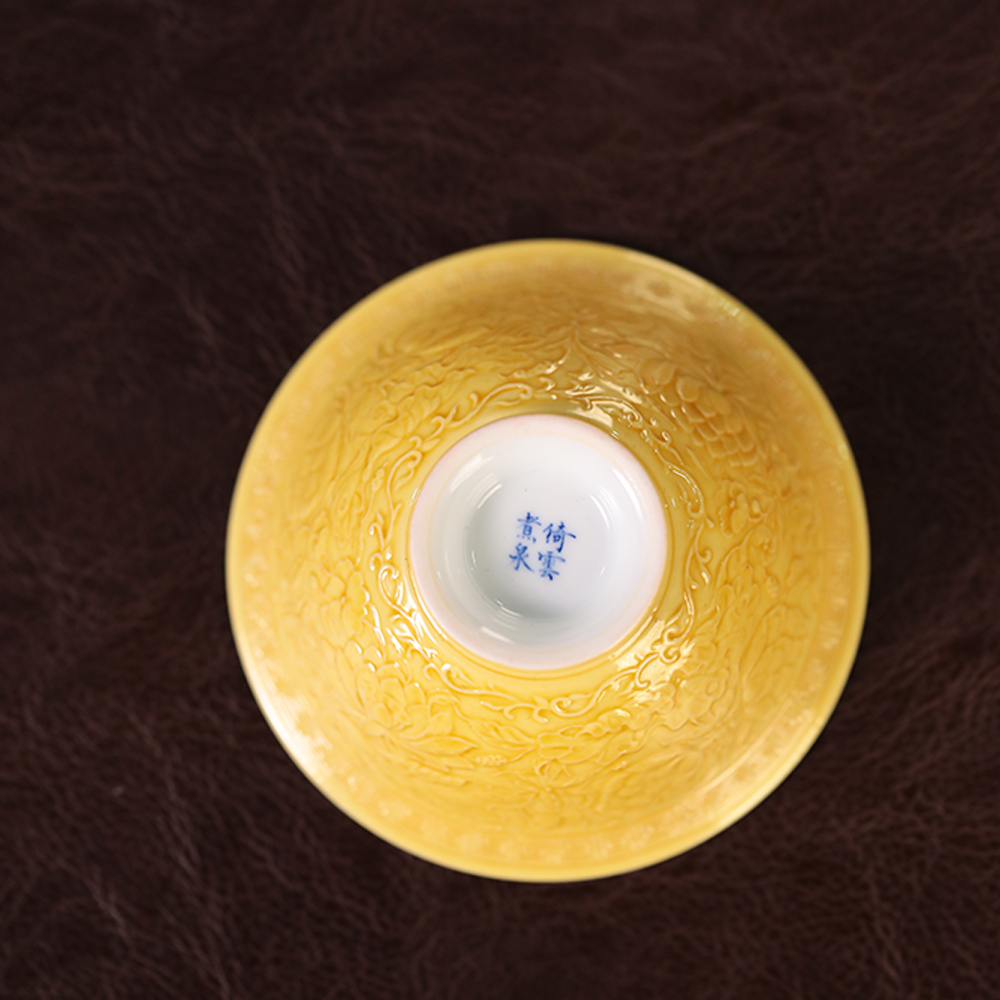 倚云煮泉 鱼藻纹 外雕刻 帝王黄釉 压手杯
