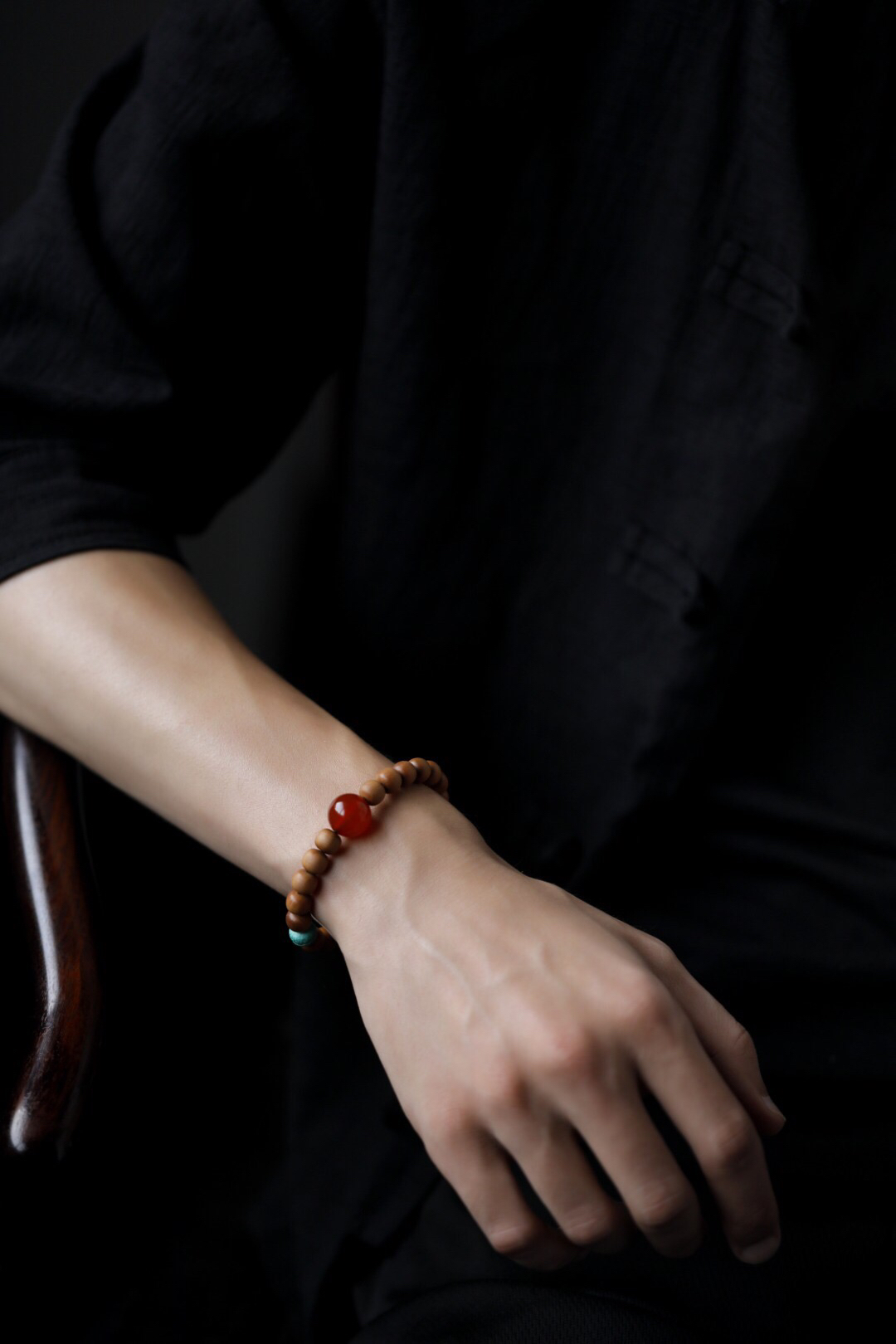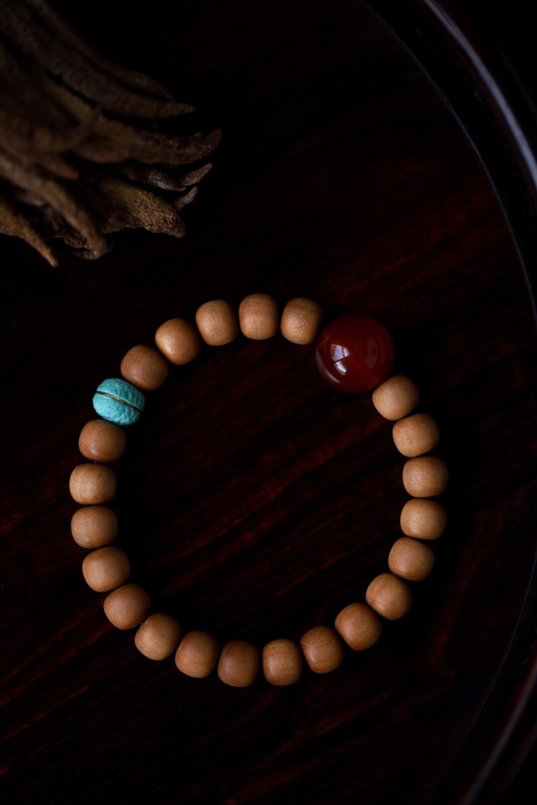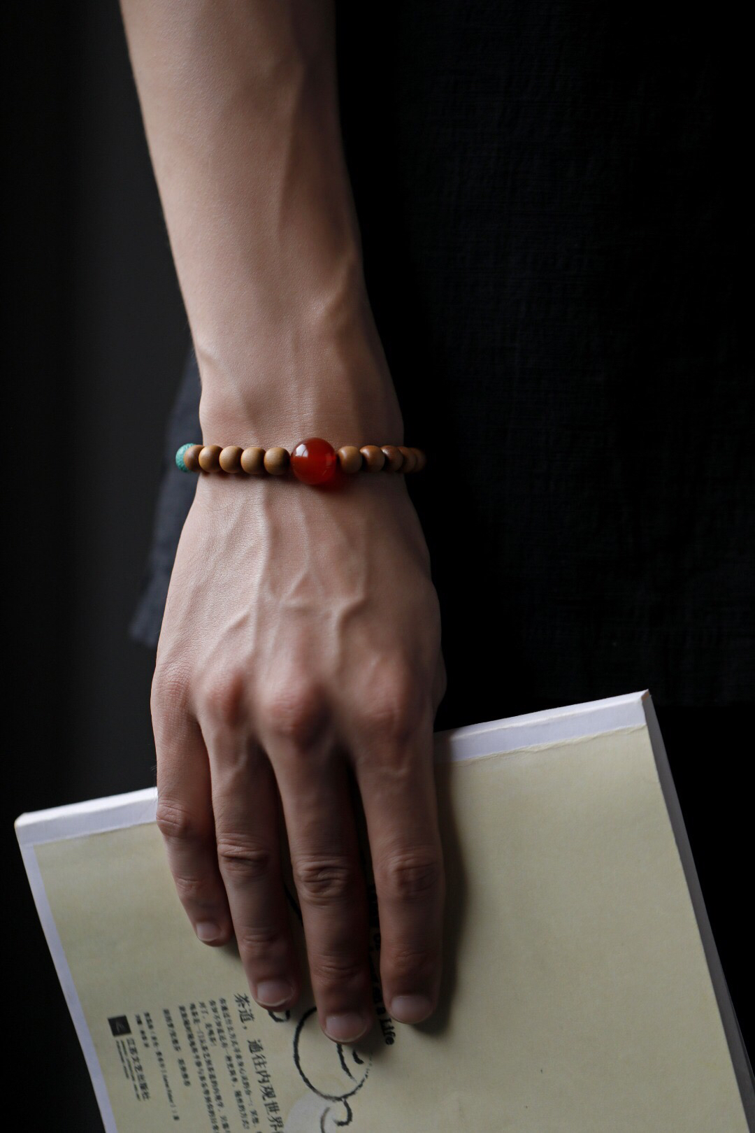 老山檀香 原创手串 松石、玛瑙为饰,彰显老山玲珑气质; 颗颗圆润饱满,香韵清而不腻; 色调柔润,令人一眼喜爱、心动。