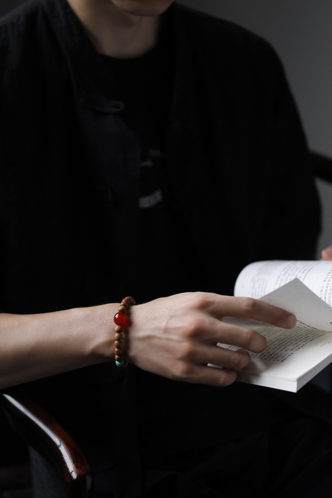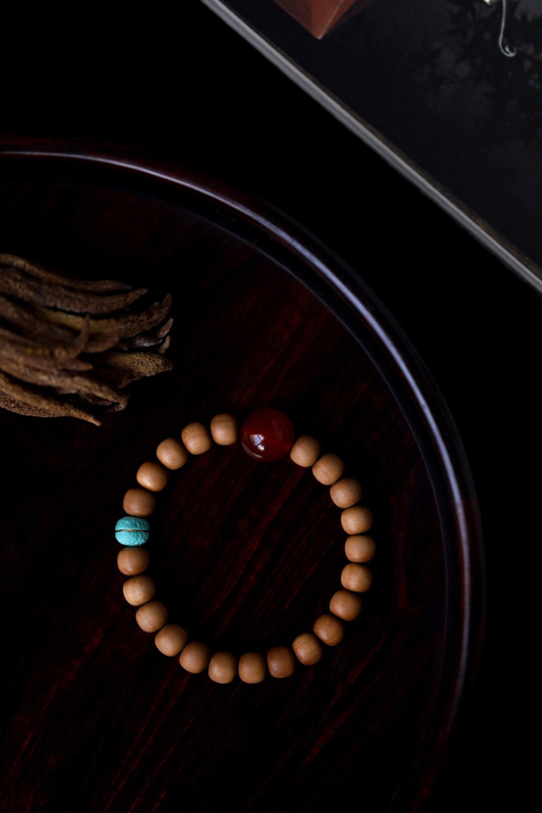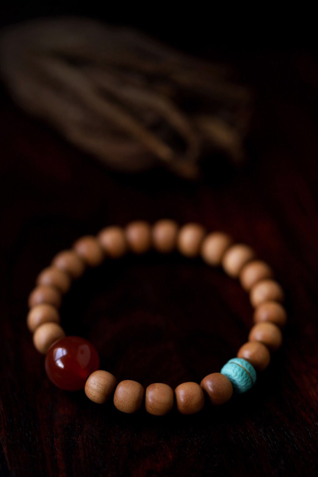 老山檀香 原创手串 松石、玛瑙为饰,彰显老山玲珑气质; 颗颗圆润饱满,香韵清而不腻; 色调柔润,令人一眼喜爱、心动。