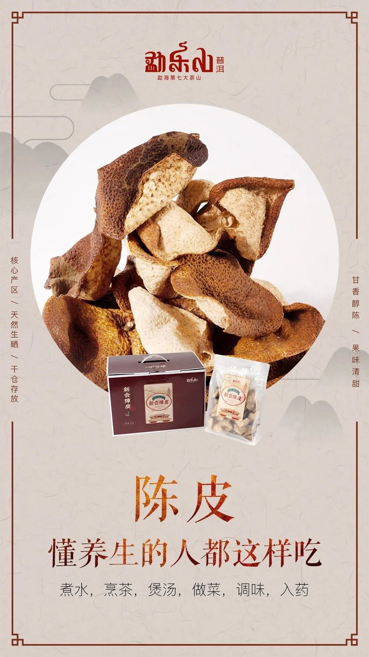 一样陈皮百样用,煮水,烹茶,煲汤,做菜,调味,入药样样皆可。陈皮水,陈皮普洱,陈皮柠檬膏,陈皮雪梨银耳汤,海带陈皮绿豆煲鸭子,九制陈皮骨,陈皮红豆沙,莲子陈皮绿豆沙,陈皮红烧肉,陈皮薏米红豆汤,蜂蜜陈皮茶,陈皮蒸鲍鱼,黑豆陈皮猪手汤,陈皮粉葛骨头汤,陈皮山楂茶,红烧陈皮排骨……勐乐山陈皮在手,花样美食随便有!陈皮祛湿燥湿的功效,在中国古代的医术中频频可见。《神农本草经》载其:"主胸中瘕热,逆气,利水谷,久服去臭,下气。";《名医别录》载其:"下气,止呕咳"。"主脾不能消谷,气冲胸中,吐逆霍乱,止泄。"《本草纲目》载其:"疗呕哕反胃嘈杂,时吐清水,痰痞咳疟,大便闭塞,妇人乳痈。入食料,解鱼腥毒。""其治百病,总取其理气燥湿之功。同补药则补,同泻药则泻,同升药则升,同降药则降。"钟南山院士科研团队实验证明:陈皮能够有效预防和减轻空气污染中有害气体引发的肺部炎症,并对肺泡间隔的破裂、小气道重塑和粘液高分泌等具有一定的保护作用。据了解,新型冠状病毒,目前尚没有特效药物或疫苗,因此支持和对症治疗,中西协同、优势互补救治病患显得尤为重要。陈皮,正是防新型冠状病毒感染的肺炎的中药之一!陈皮抗疫,有益无疫!