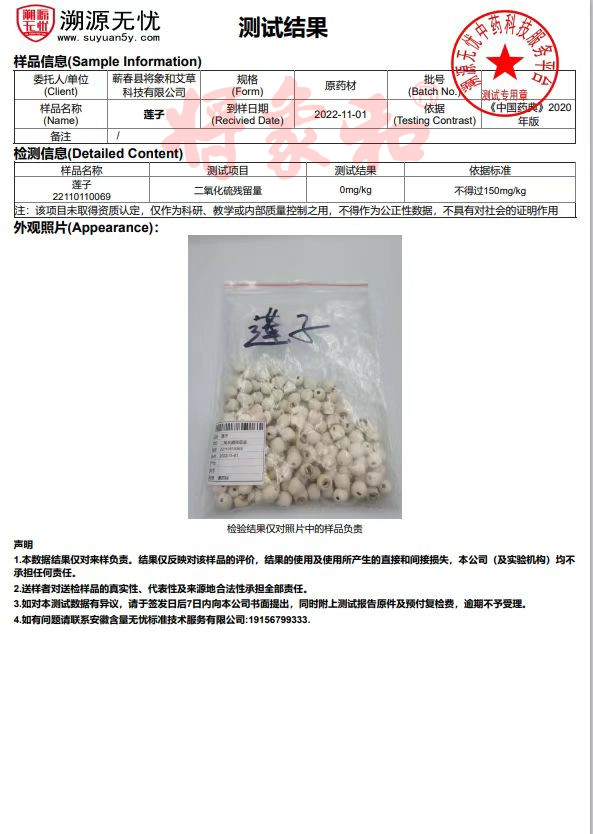 我们的莲子按照国家药典标准检测:二氧化硫残留物为:0