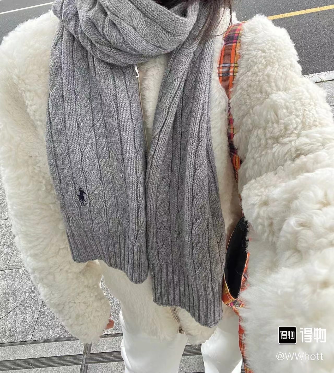 两色麻花针织羊毛围巾 基础款麻花纹理围巾 老钱风 品质非常好 含80%羊毛 保暖柔软舒适 编织纹理jing致 小马刺绣清晰 精典百搭款式 适合日常搭配 可以搭配任何衣服 灰色和藏青耐看 男女通用 搭配大衣外套都好看 好慵懒的感觉 冬天氛围感满满
