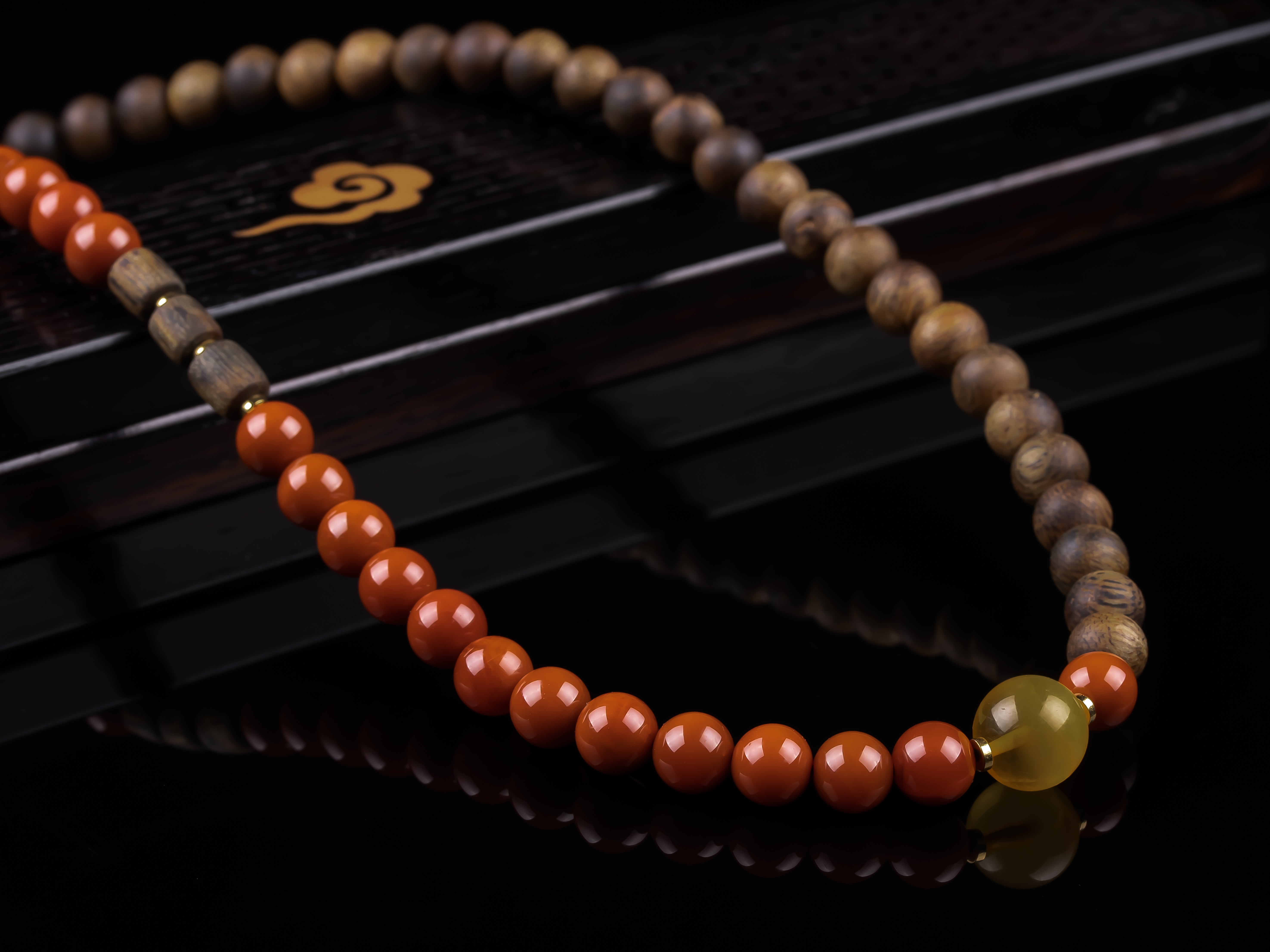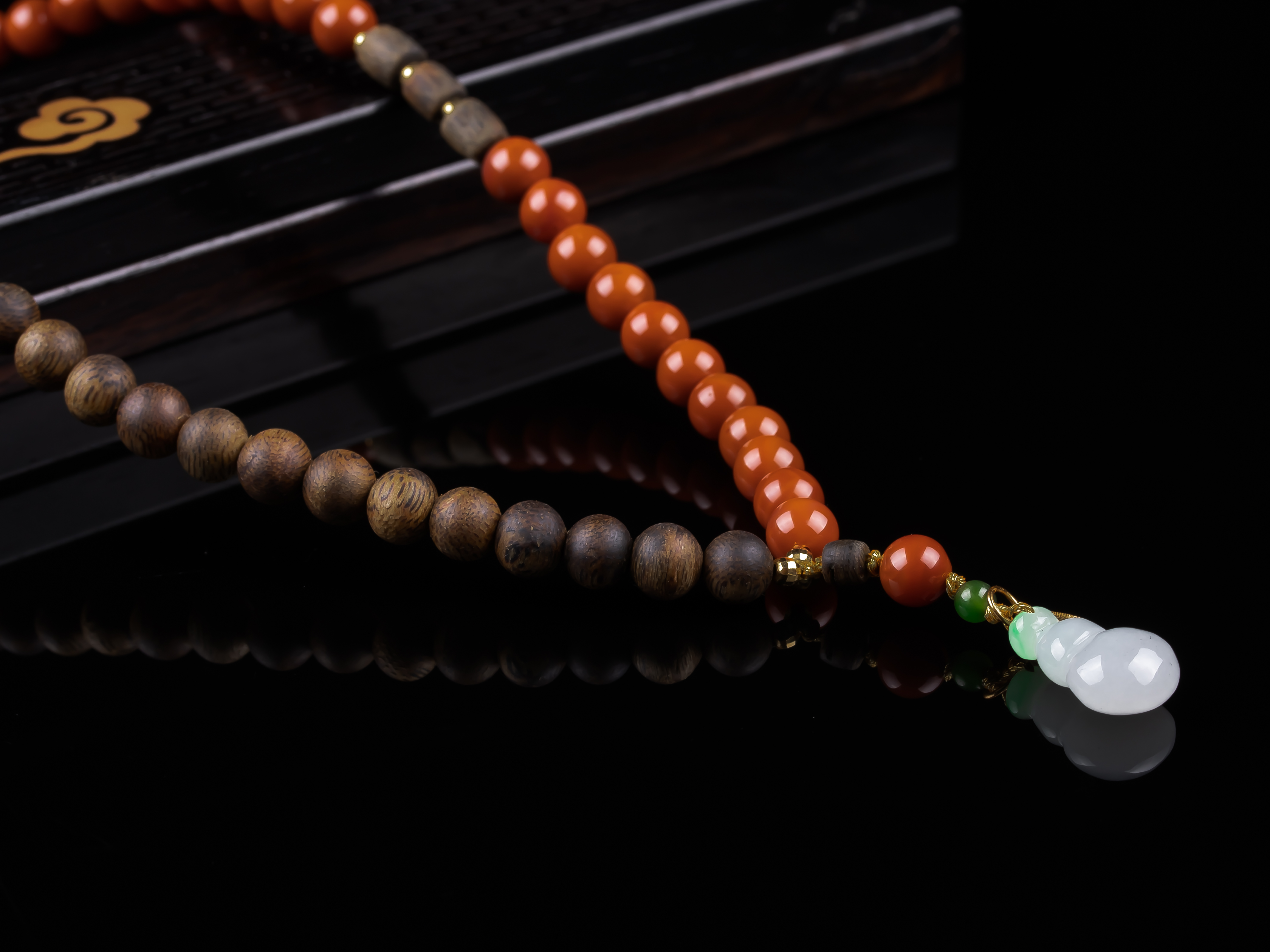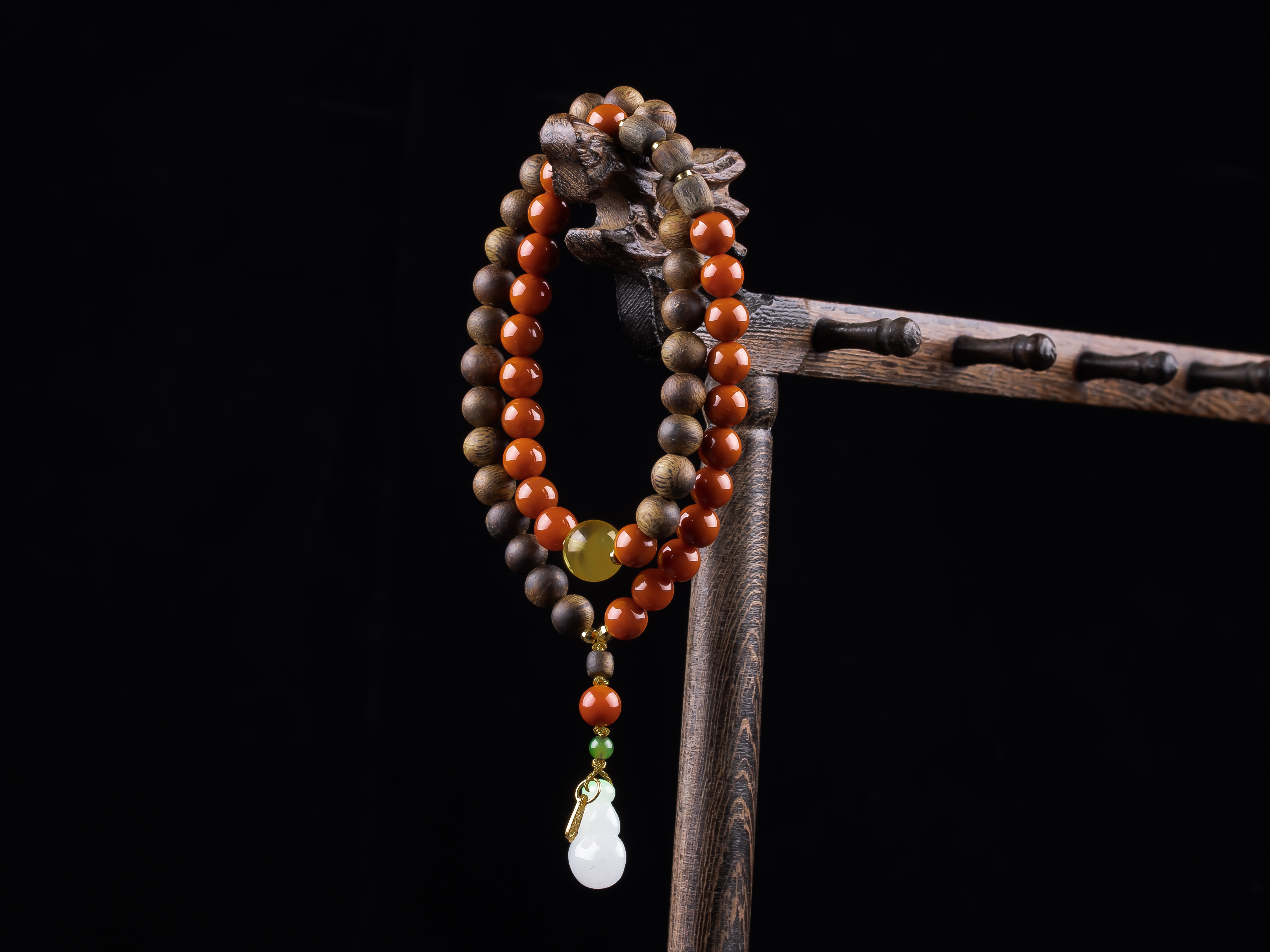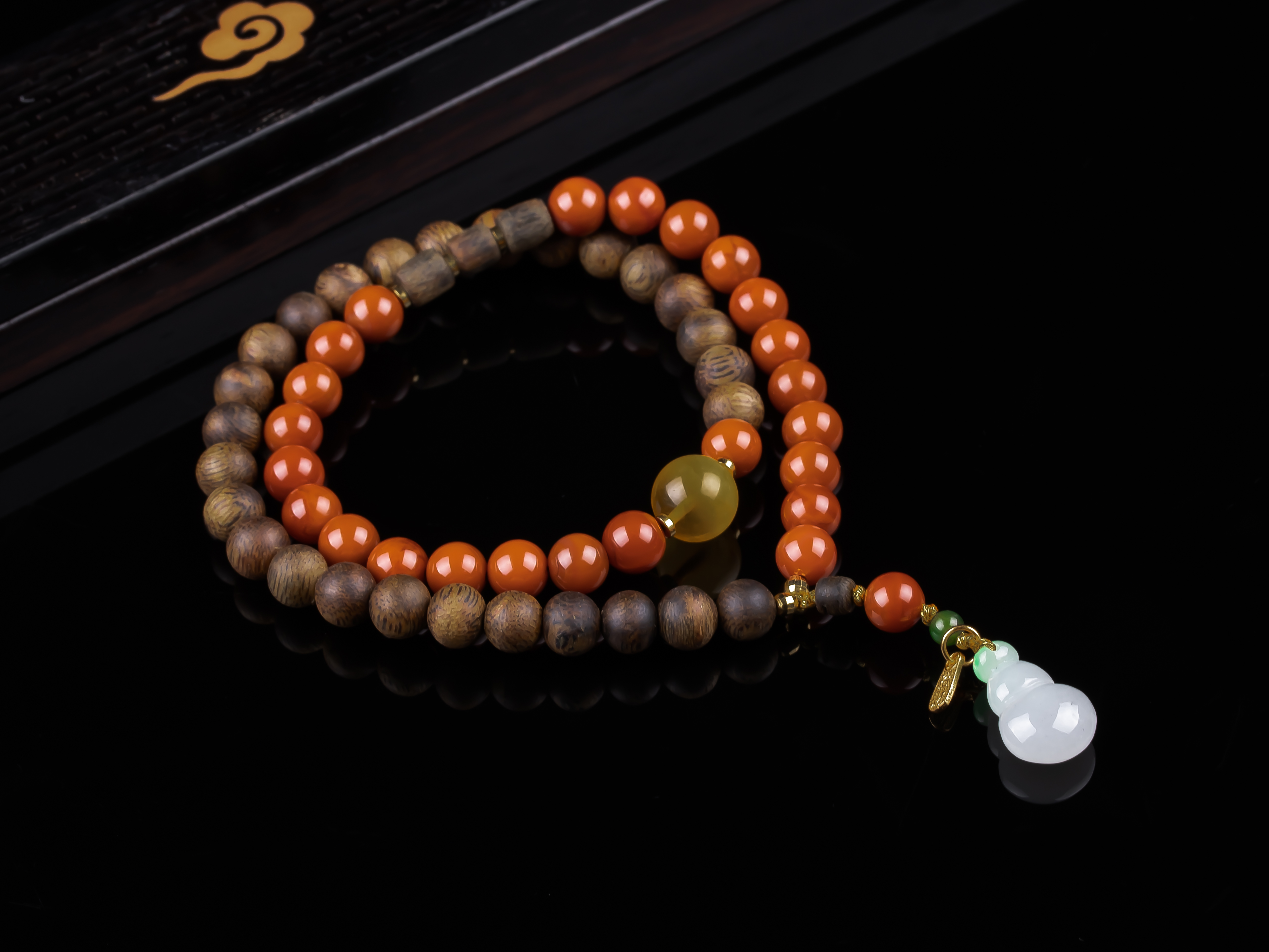 XY0272沉香+南红蜜蜡翡翠葫芦双圈手串,天然沉香7.4mm,原色原味,香味清甜自然,蜜蜡10.2mm,翡翠葫芦17.8*11.4*7.2mm,配珠:碧玉、925银,冰底带色的翡翠葫芦,半圈满色肉的南红,整体鸿运吉祥,福禄相伴。