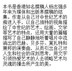 常有些朋友问我,为什么许多谈古典音乐作品或音乐家的书,读起来所写的人物,几乎千人一面?所介绍的作品,除了罗列一些专业名词,便是几个放之四海而皆准的赞誉之词,或除了近乎明星八卦般的逸事便一无所有?这情形在有关美术欣赏的文章中也几乎瞩目皆是,你读完一篇篇介绍某名画家的文字,得出的印象,除了诸如成功者必是天才加勤奋的公式之外,对于所谈论的那位画者的画到底好在何处,甚至想明白他到底想告诉观者什么,读者是全然找不着北的。读介绍著名诗人或小说家的书,常也如此这般地令人茫然……于是也常有人问我,这些东西是那样令人神往,但要得其门而入,却不容易,是否连欣赏,也要讲天分呢?