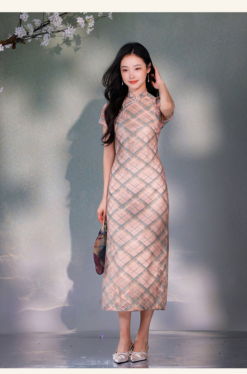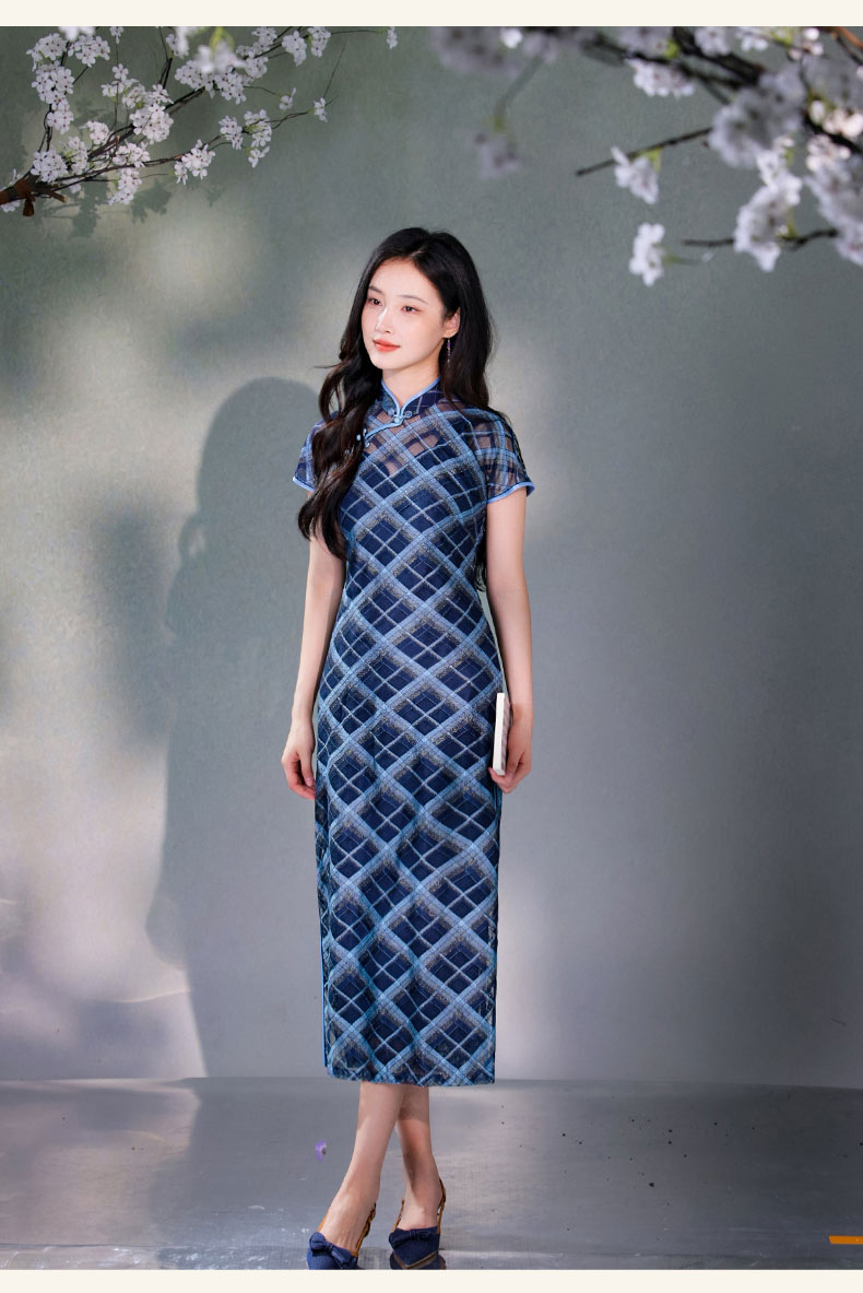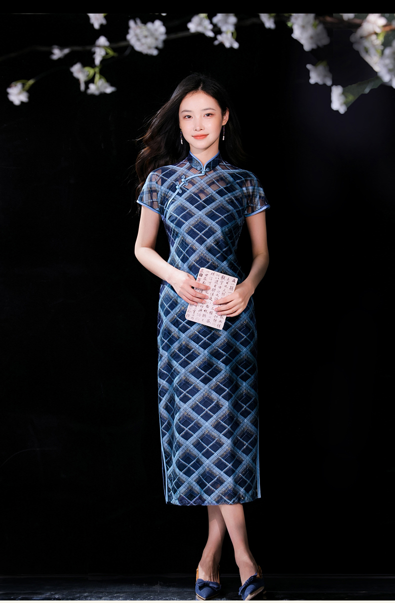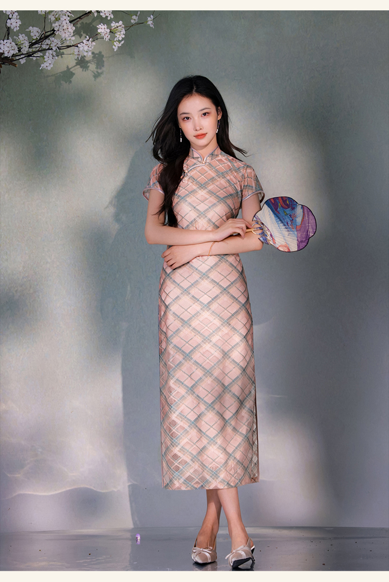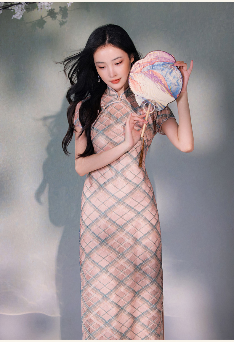 逸红颜若檬2025夏新款温婉气质新型鱼鳞细软菱形格蕾丝改良长旗袍