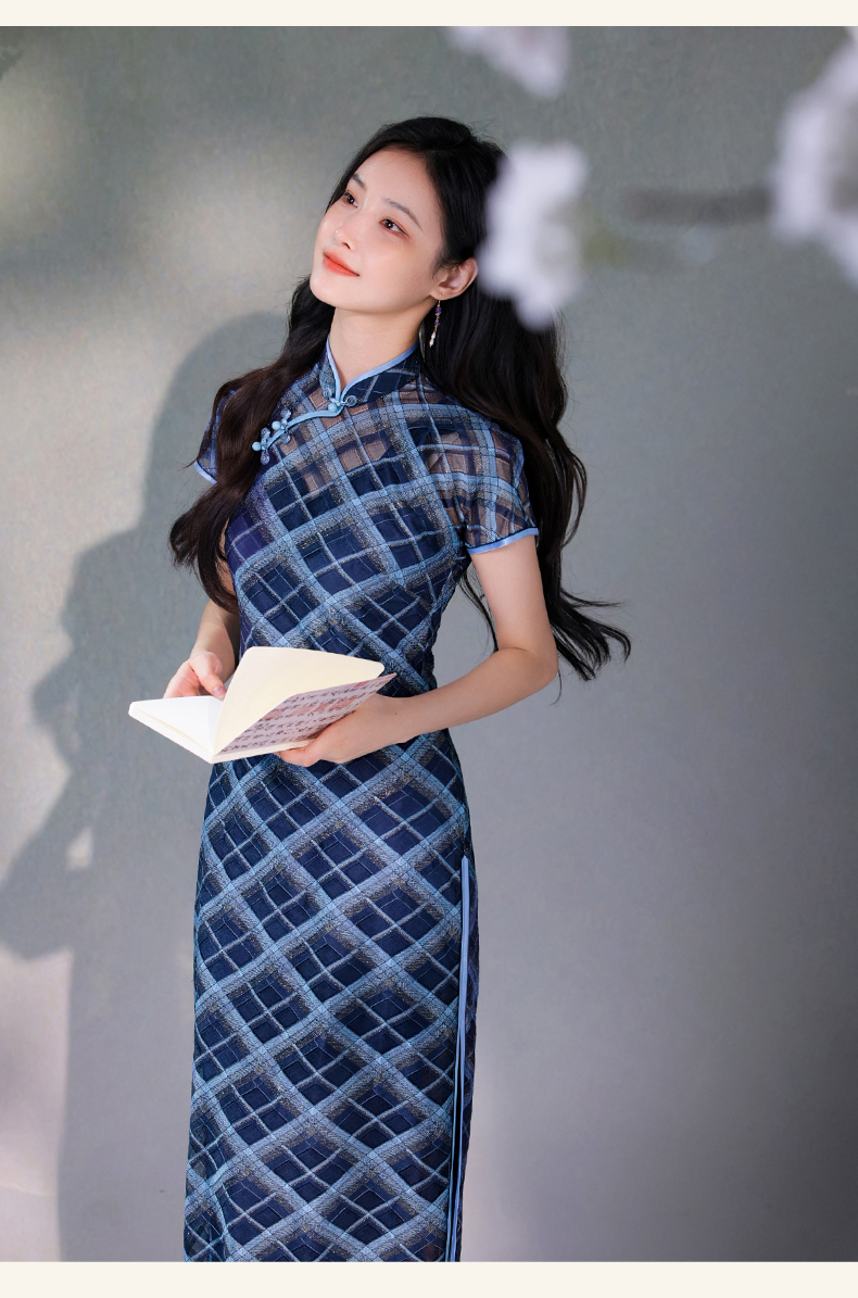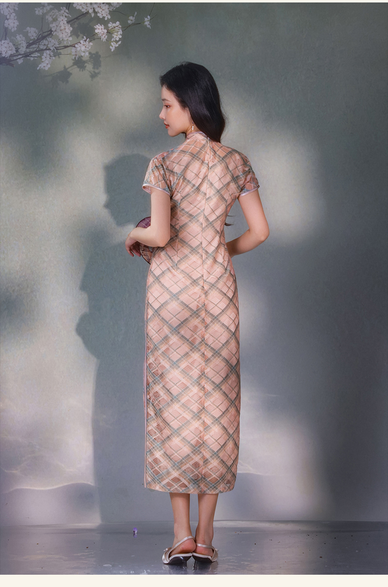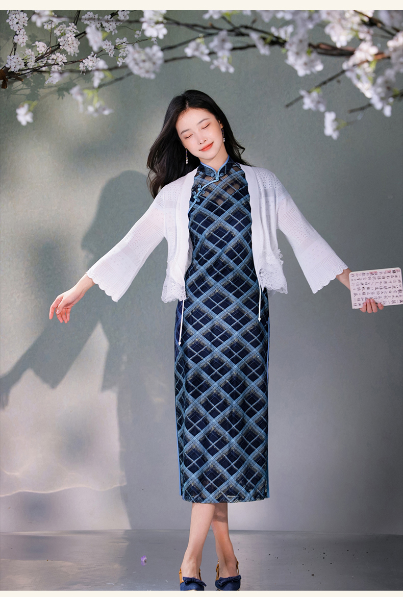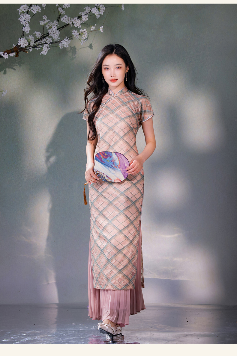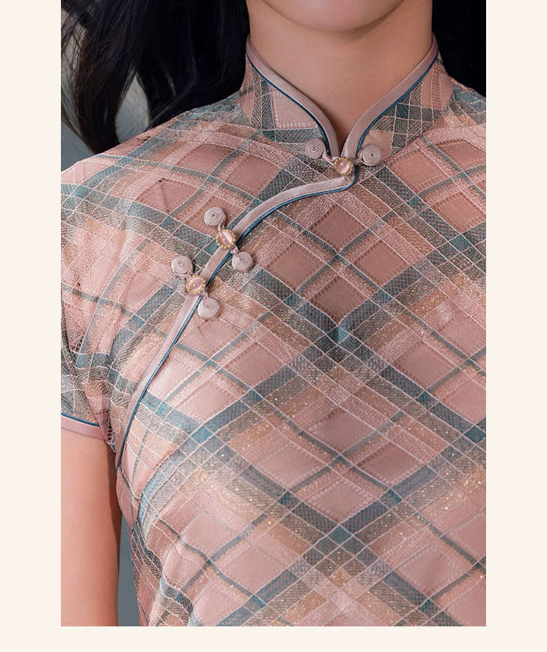 逸红颜若檬2025夏新款温婉气质新型鱼鳞细软菱形格蕾丝改良长旗袍