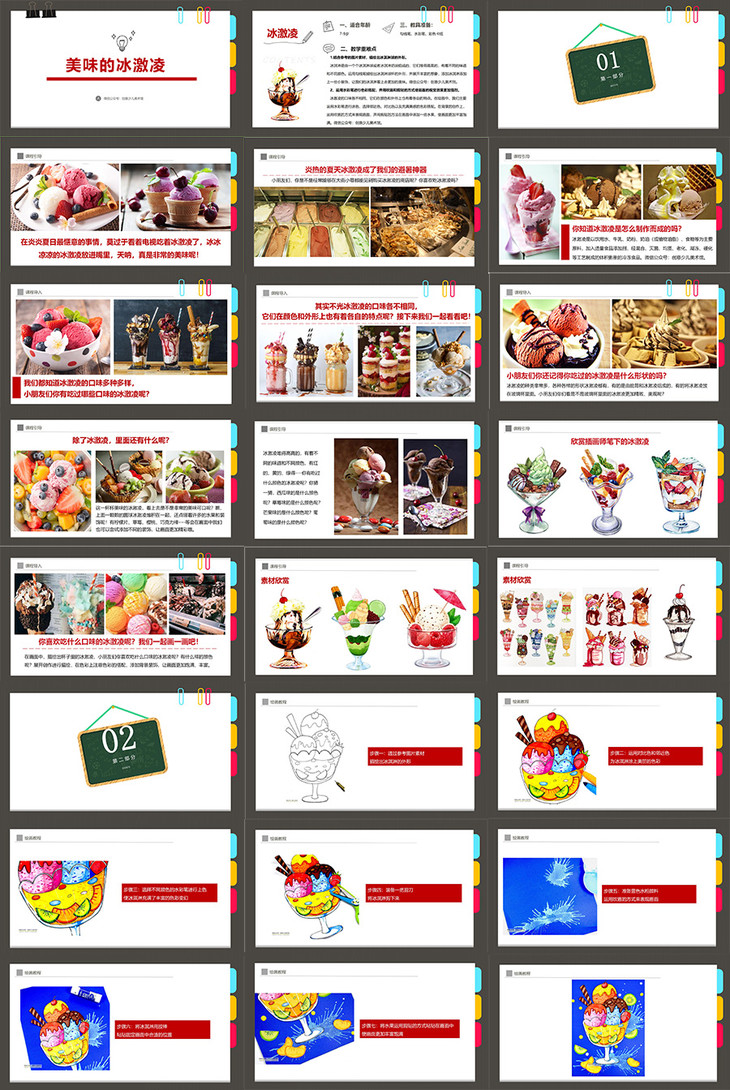 冰激凌的口味各不相同,它们在颜色和外形上也有着各自的特点。在绘画中,我们主要运用水彩笔进行涂色,选择邻近色、对比色以及充满美感的色彩搭配。在背景的创作上,运用吹画的方式来表现画面,并用剪贴的方法在画面中添加一些水果,使画面更加丰富饱满。