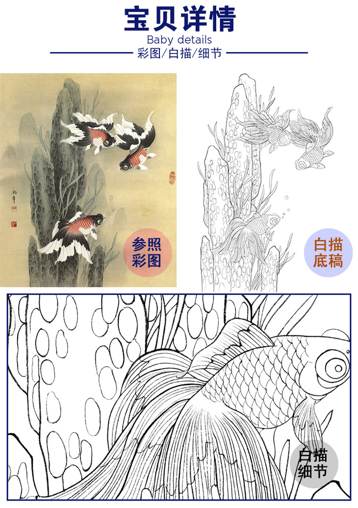 工笔花鸟白描底稿-路雨年-金鱼-斗方小品册页-A330