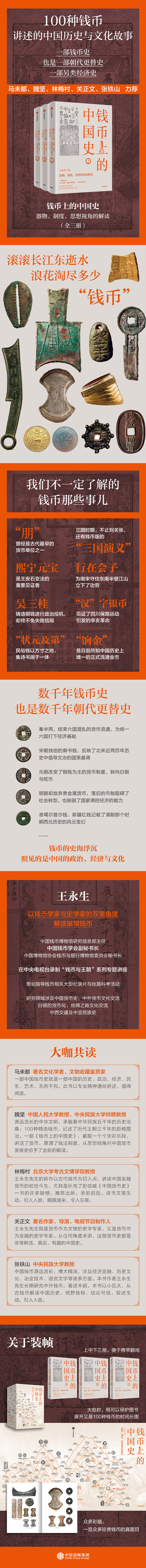 上中下三册平装,大包封包裹。分册便于携带翻阅;大包封既可以保护图书,展开又是100种钱币的时间长图;内含众多彩插,一览众多珍贵钱币的真貌。