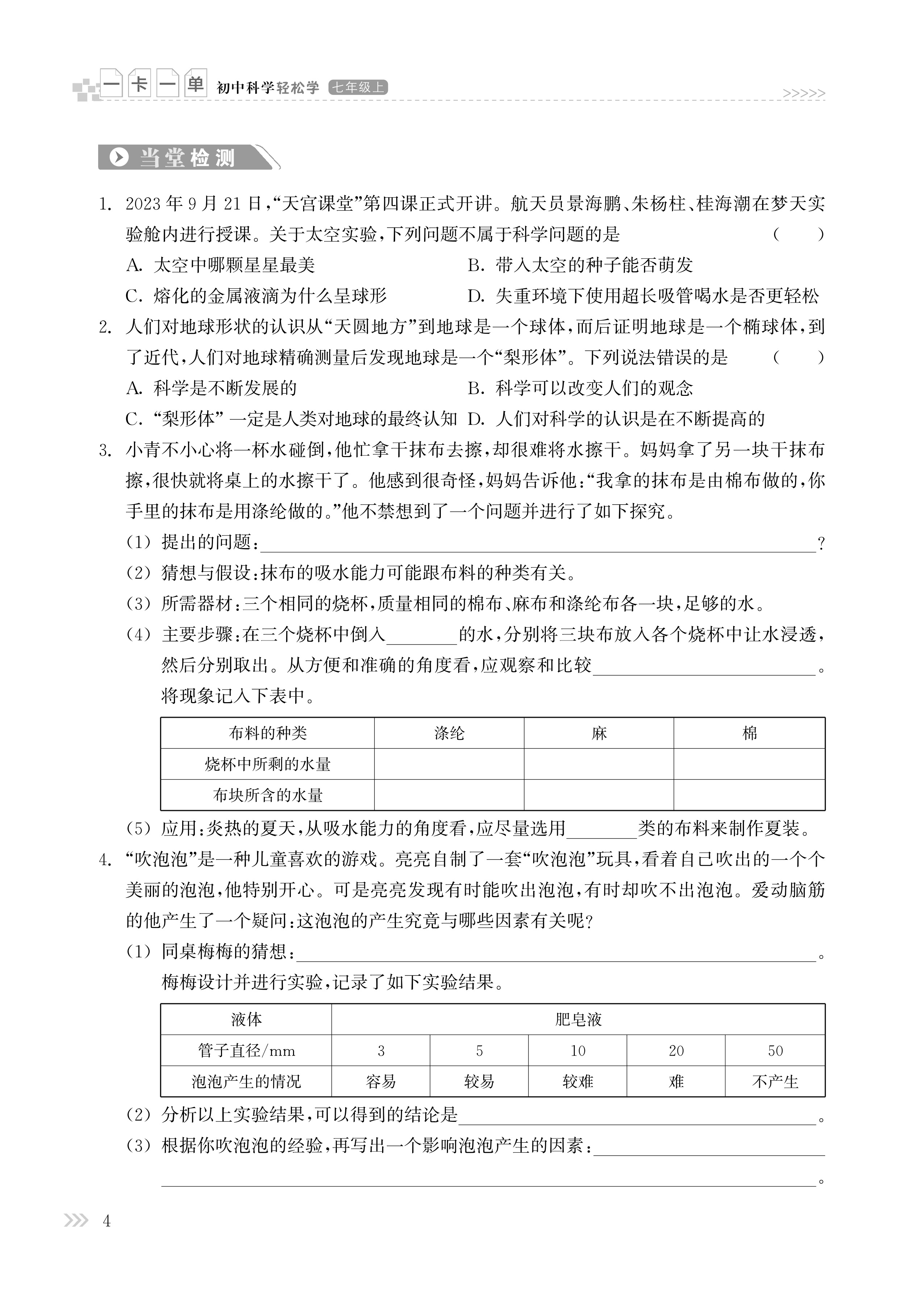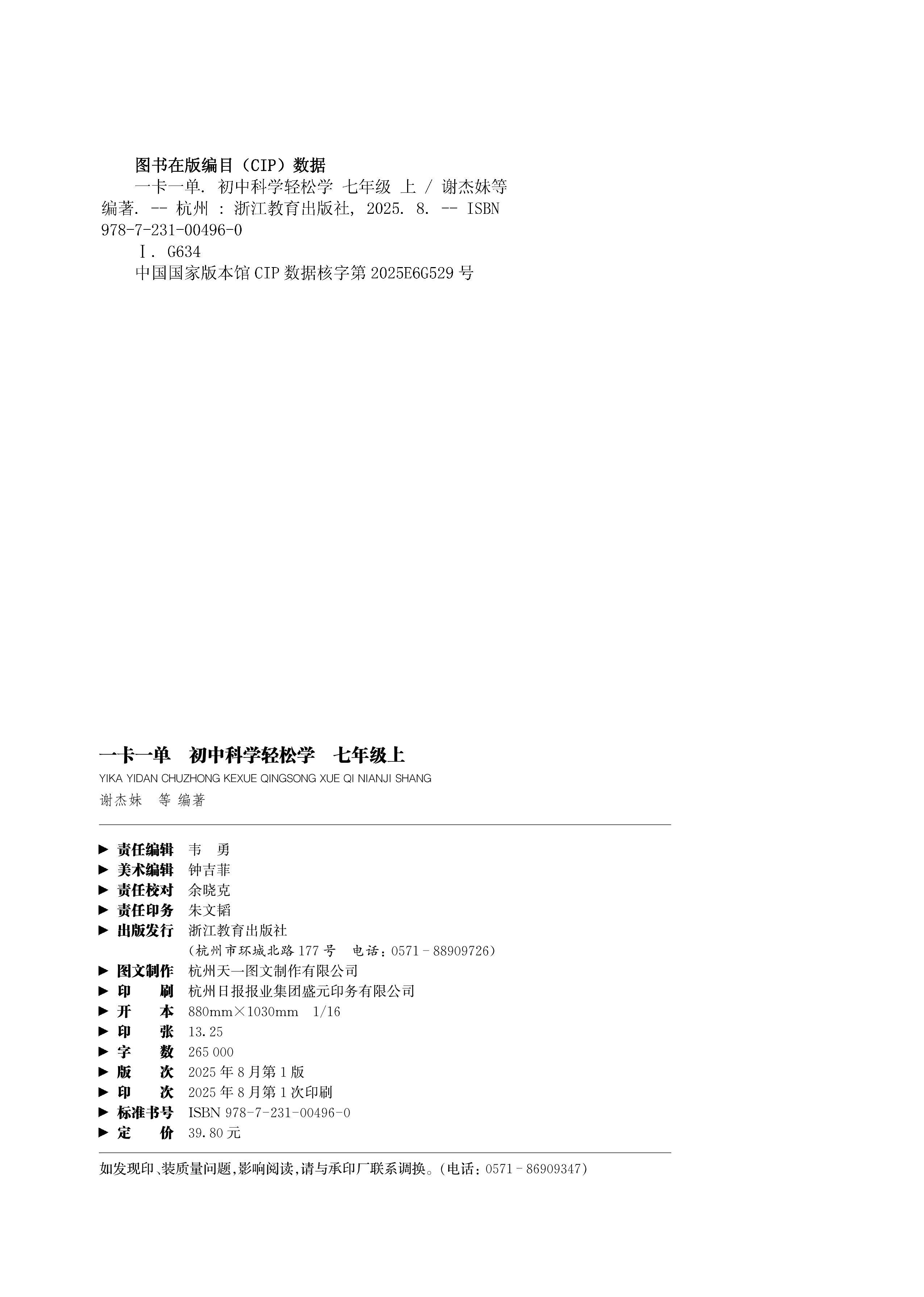 “一卡一单”是温州市瓯海区第二外国语学校的教学、教研品牌,也是谢杰妹校长以长期的研究和实践为基础,以当代学习理论为指导形成的富有特色的教学成果。该教学成果曾荣获浙江省教学成果一等奖和国家教学成果二等奖。“一卡一单”教学模式以“问题卡”和“任务单”作为载体,围绕课前预学、课中助学、课后延学,综合运用“问题卡”,依托“任务单”搭建学习支架,营造以“问题为牵引、任务为支架”的高效课堂,让每一个学生都积极参与科学探究和思维。《一卡一单 初中科学轻松学 七年级上》是该教学成果的纸质化,强调实践性与操作性,直接服务于教师的教与学生的学,有助于打造素养课堂,提升学生的科学核心素养。本册分A、B本,适用于七年级学生。