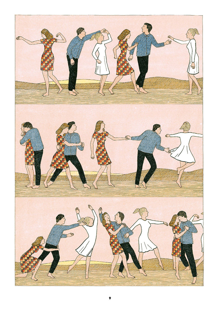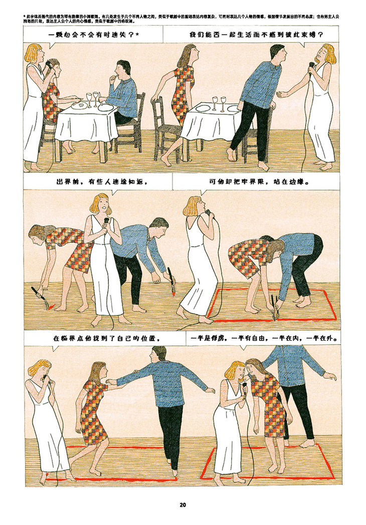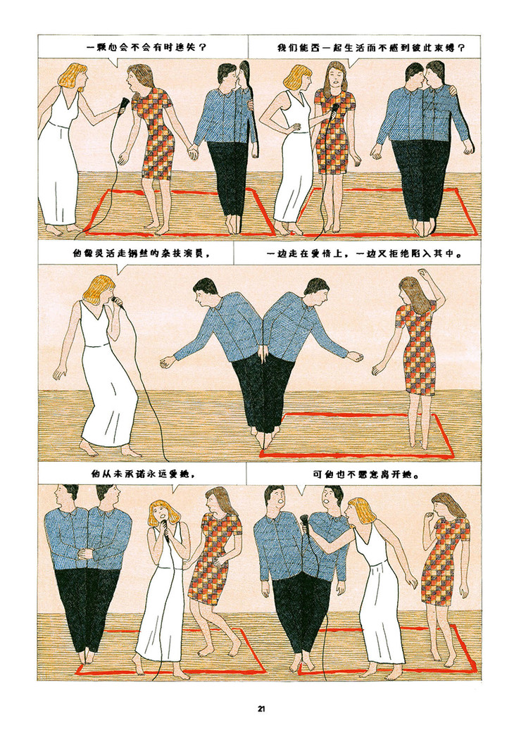 [法]马里翁·法约勒(Marion Fayolle):法国插画家,作品荒诞、幽默、充满诗意。因为总能以独特的视角解读爱情中的男性与女性而在法国受到关注。她的系列作品初看让人感觉是在表达某种性暗示,细思发现是在探索关于两性关系的哲学。《悬停的爱》是马里翁的代表作,获得第45届法国安古兰国际漫画节年度评委会特别奖。
