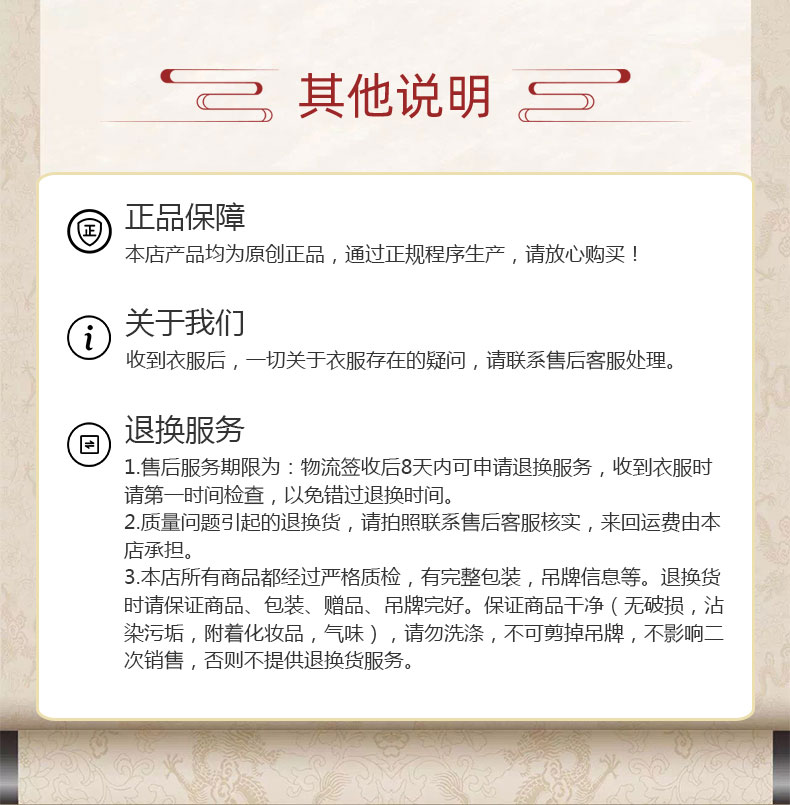 2) 非质量问题售后运费自理,拒收到付件(商品不影响二次销售,包装袋、吊牌需要退回,袋子整洁,表面不能写字和粘胶纸)
