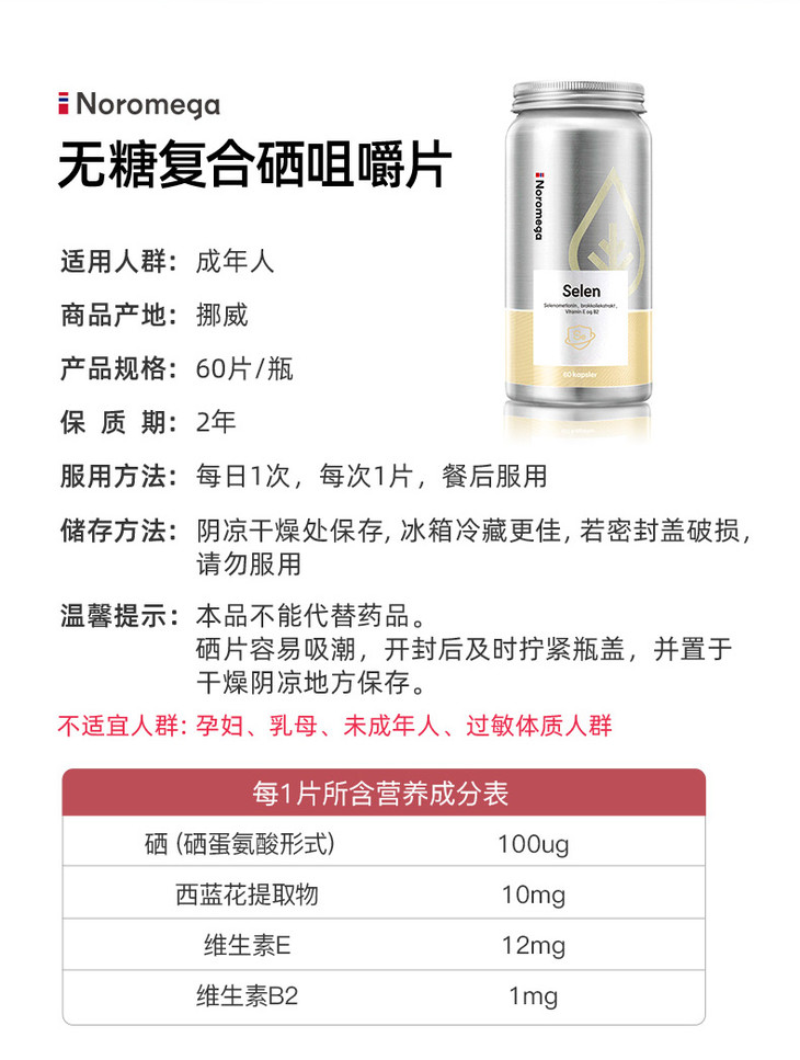 有机硒|Noromega无糖有机复合硒咀嚼片60片 挪威进口 男女补硒 甲状腺 结节 桥本 高吸收