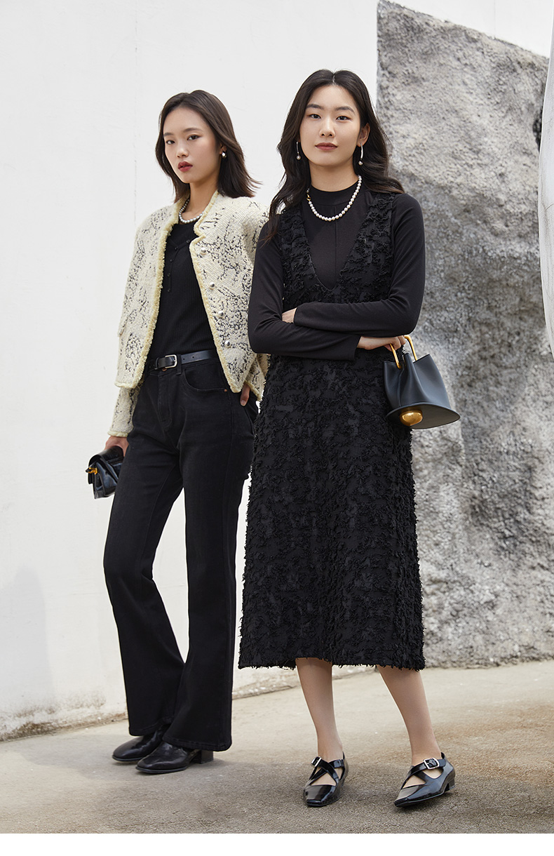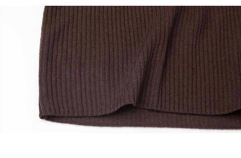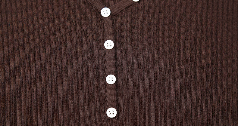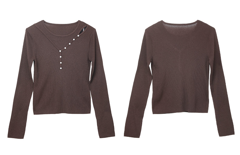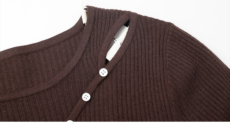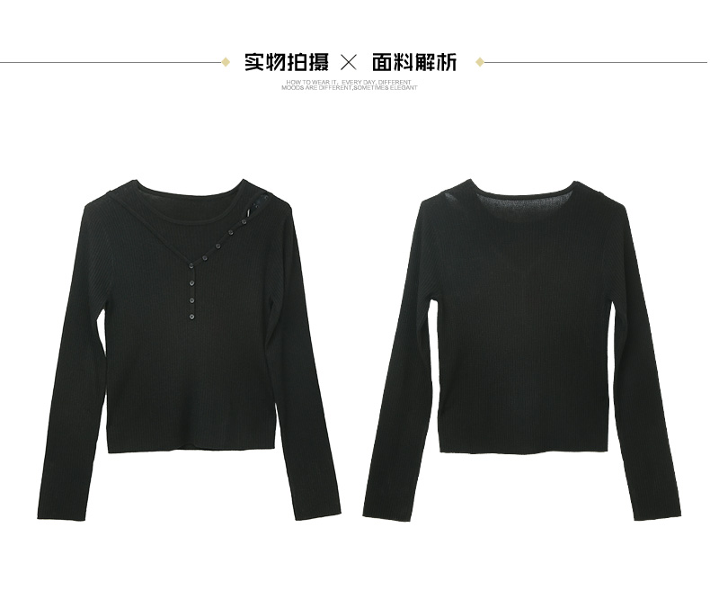 黑色斜襟纽扣设计坑条针织衫 修身长袖圆领打底衫 小众设计感秋冬内搭上衣
