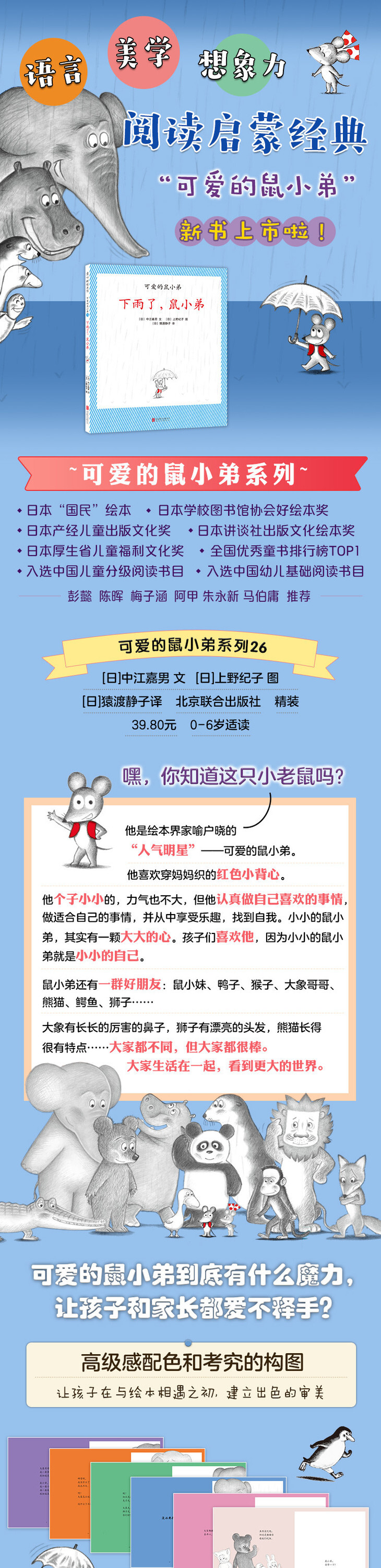 2020年是农历鼠年,也是鼠小弟系列问世45周年,爱心树童书自2004年引进鼠小弟的16个年头。值此契机,爱心树童书推出可爱的鼠小弟新书《下雨了,鼠小弟》,愿可爱的鼠小弟陪伴小朋友们茁壮成长!