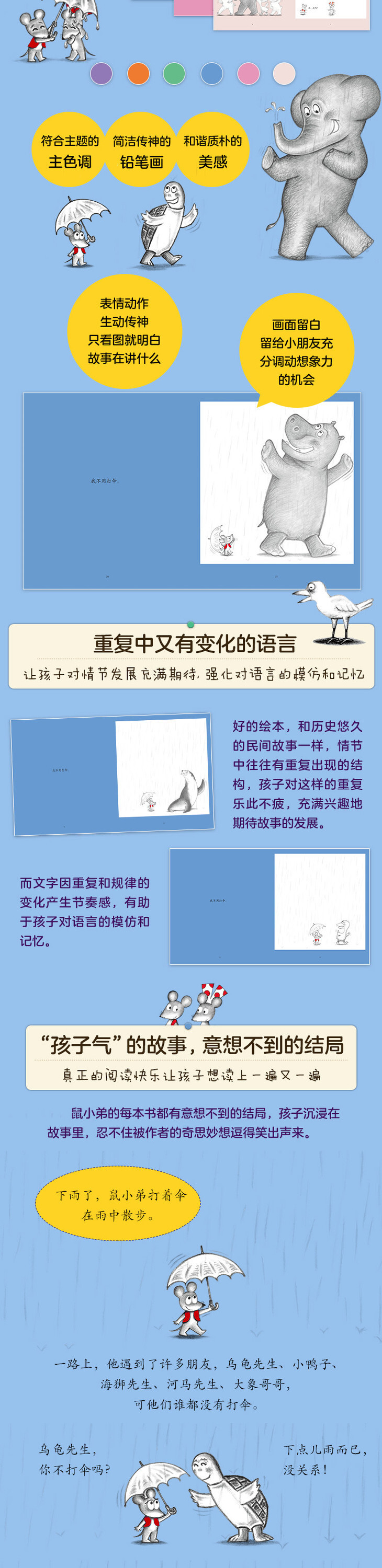 构思的巧妙,起、承、转、合的严谨,文图配合的默契,以及讲究的构图、色彩……当然,鼠小弟获得孩子们喜爱的重要的原因是它有趣,***有趣,真正有趣。——教育学博士 季颖