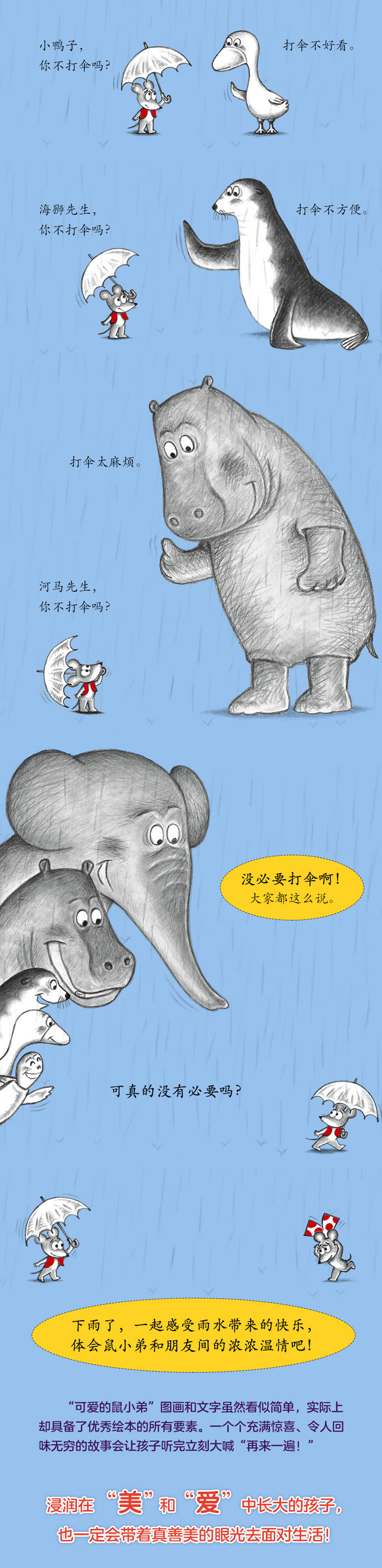 下雨了,鼠小弟打着伞在雨中散步。一路上,他遇到了许多朋友,有乌龟先生、小鸭子、海狮先生、河马先生、大象哥哥,可他们谁都没有打伞。小鸭子说打伞不好看,海狮先生说打伞不方便,河马先生说打伞太麻烦……没必要打伞啊,大家都这么说。可真的没有必要吗?