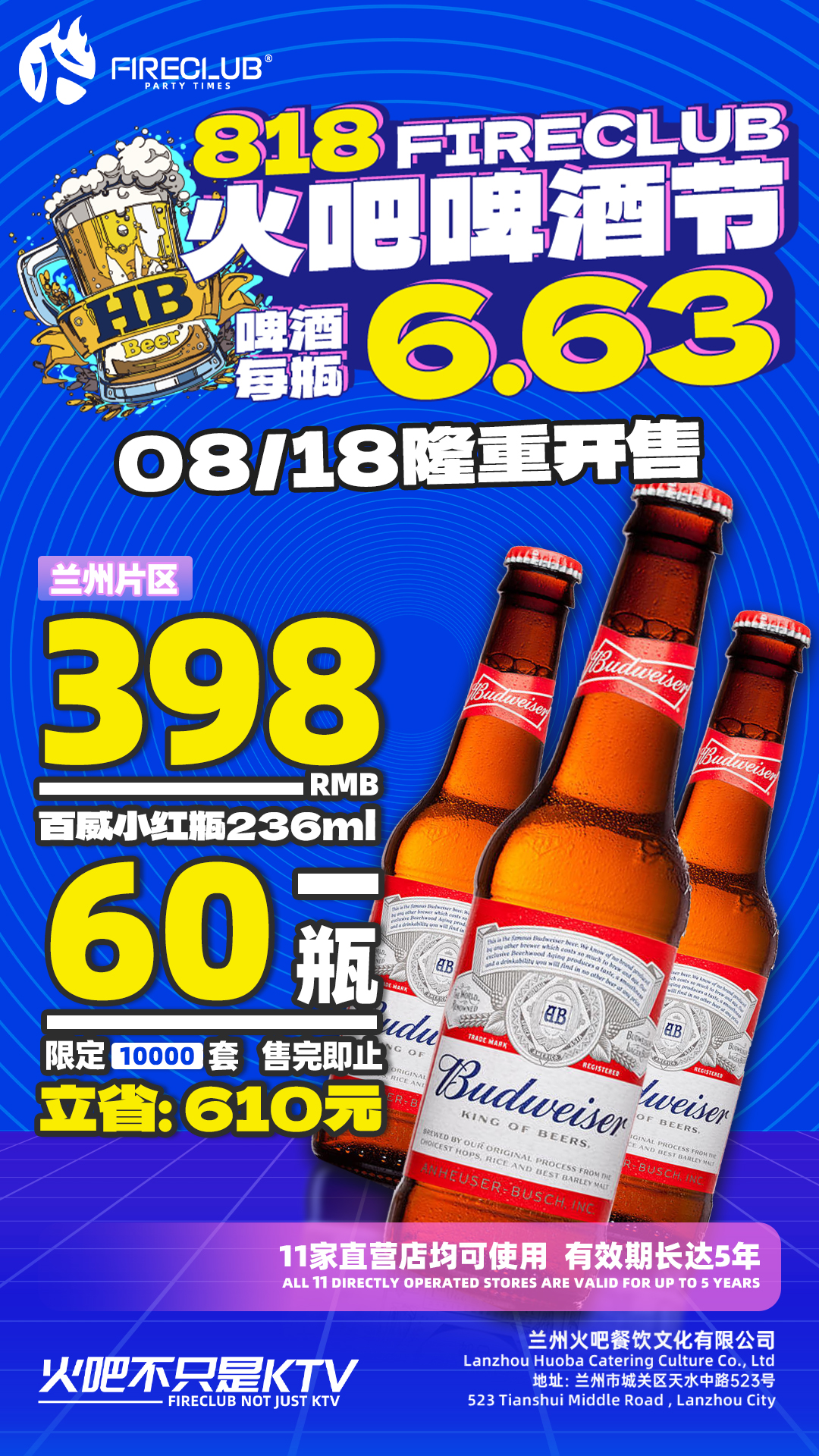 【兰州通用】8月18日火吧啤酒节—398元60瓶百威小红瓶236ml—超值存酒卡