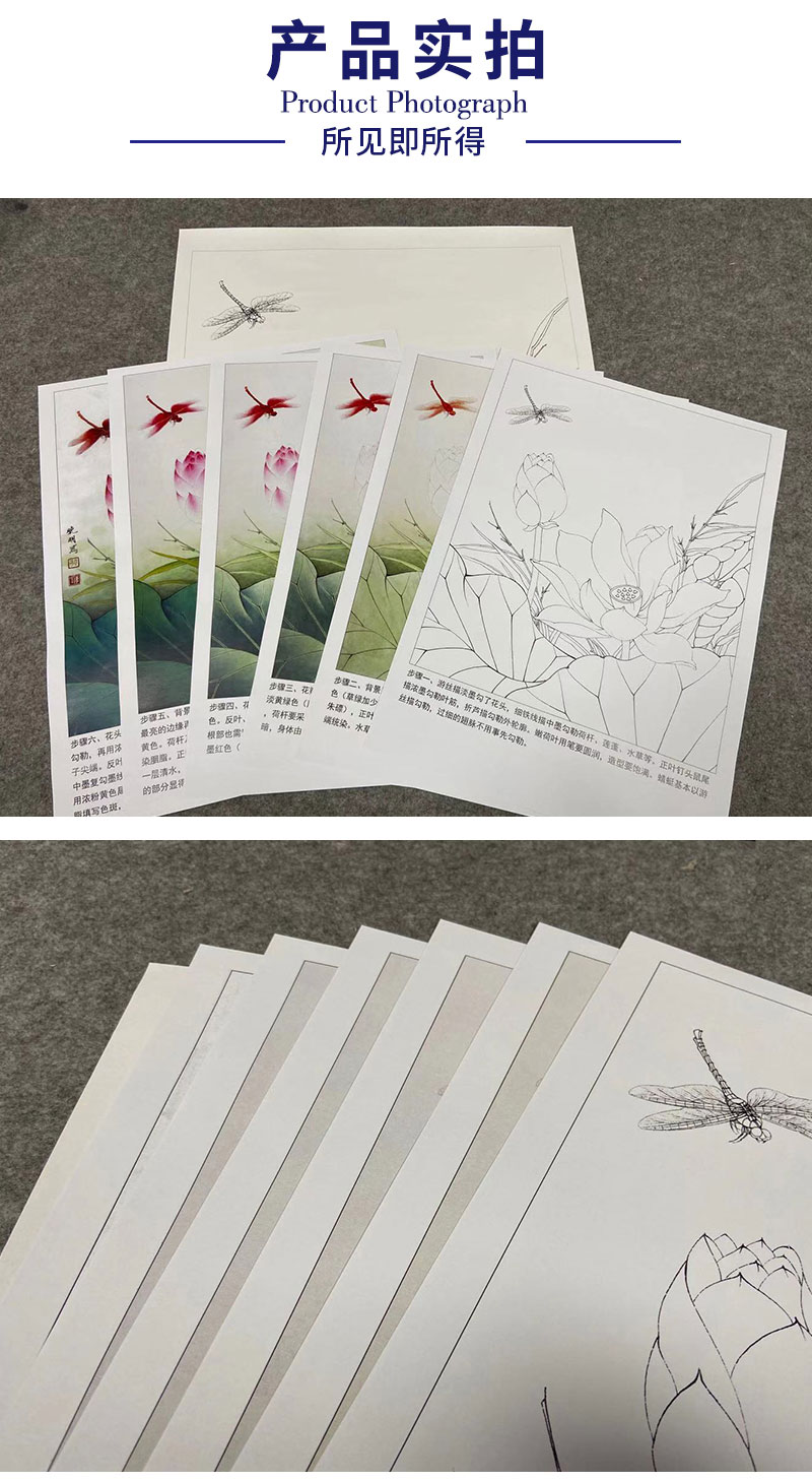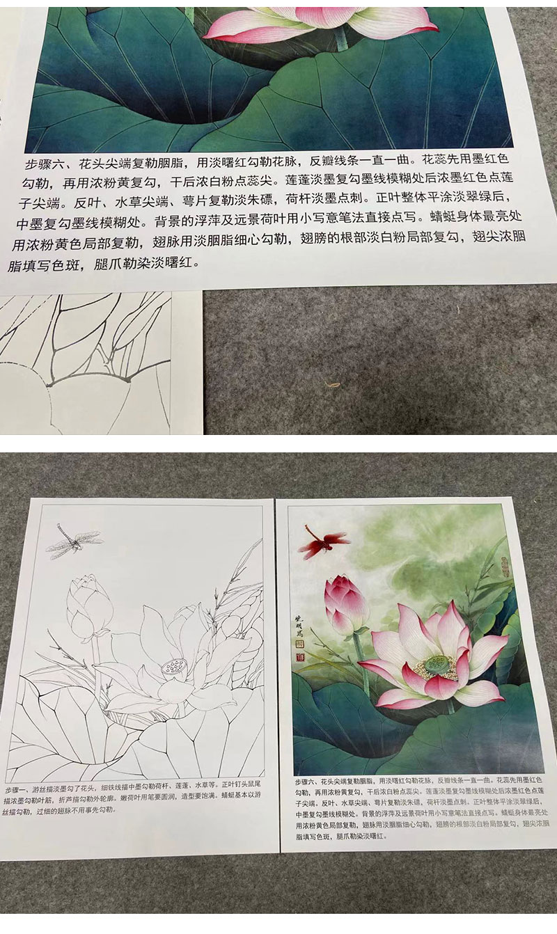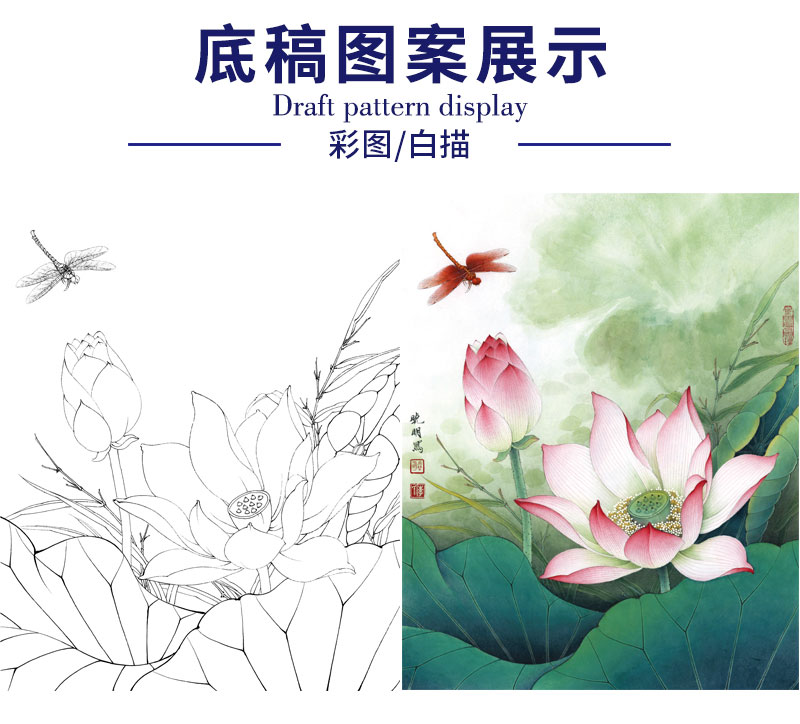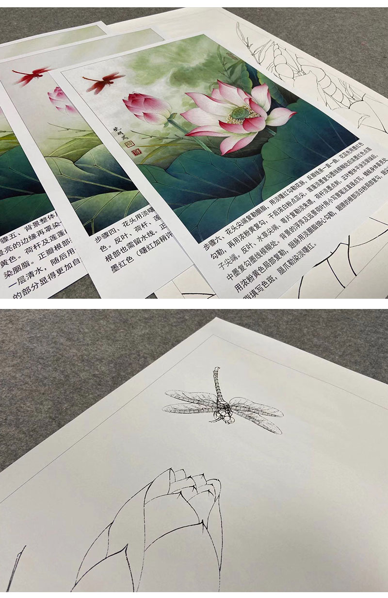 【有步骤、大彩图】李晓明工笔画白描底稿《荷花红蜻蜓图》初学者临摹花鸟线稿KE14