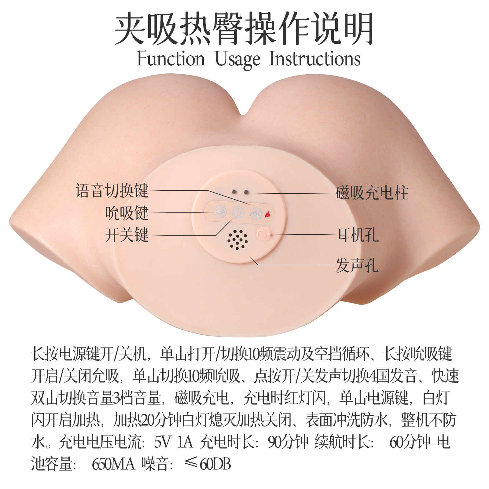漫渺硅胶夹吸热臀 型号:MG04 条码:6973736552744 Silicone Sucking and heating buttocks シリコン吸入加熱ヒップ 실리콘 흡입 가열 엉덩이 Silicone hút nóng mông 规格:31*24*14cm 重量:5480g 腰围直径:14cm 臀围直径:31cm 阴通道长:10cm 材质:硅胶Silicone+ABS 长按电源键开/关机,单击打开/切换10频震动及空挡循环、长按吮吸键开启/关闭允吸,单击切换10频吮吸、点按开/关发声切换4国发音、快速双击切换音量3档音量,磁吸充电,充电时红灯闪,单击电源键,白灯闪开启加热,加热20分钟白灯熄灭加热关闭、表面冲洗防水,整机不防水。充电电压电流:5V-1A 充电时长:90分钟 续航时长: 60分钟 电池容量: 650mA 噪音:≤60db 10频爆吸,10频震颤,四国叫声,内穴加热,铂金硅胶,生物复刻,感官革命,逼真美阴与肤纹,渐变色斑,脉管复刻,进口原料,精研成本