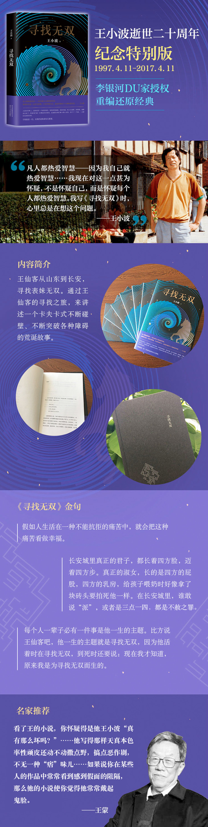 《寻找无双》通过王仙客从山东到长安,寻找表妹无双的故事,借用古代传奇为故事蓝本,融合现代元素,用历史反哺小说,通过王仙客的寻找之旅,来讲述一个卡夫卡式不断碰壁、不断突破各种障碍的荒诞故事。思维的快乐则是人生乐趣中重要的一种。本书就是一本关天智慧,更确切地说,关于智慧的遭遇的书。