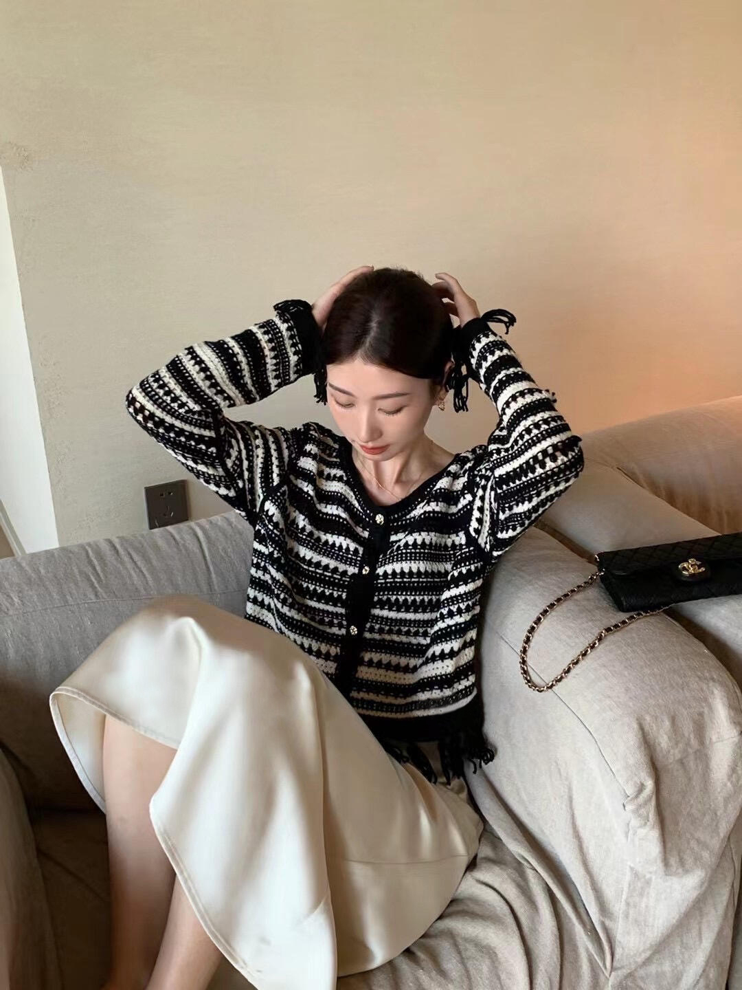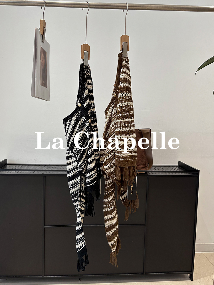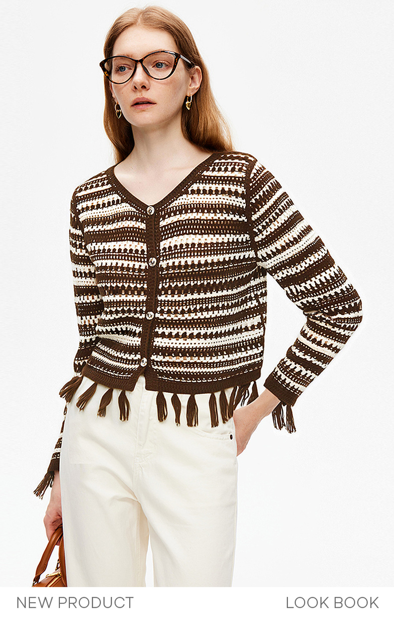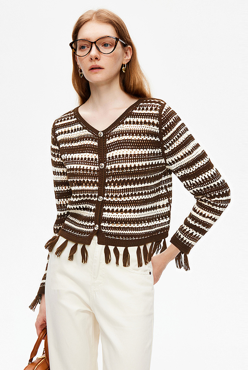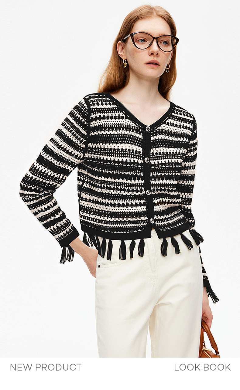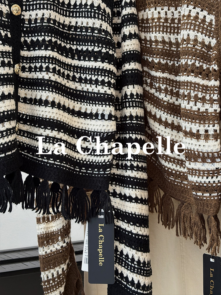 天猫同步【时髦复古】拉夏贝尔/La Chapelle复古小众流苏条纹长袖针织开衫女V领短款毛衣