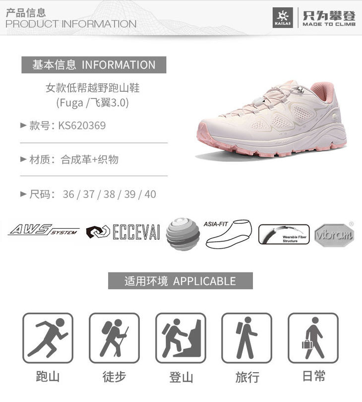 粤七 女款低帮越野跑山鞋(Fuga /飞翼3.0) KS620369跑马拉松比赛越野跑步耐力跑训练慢跑健身徒步运动