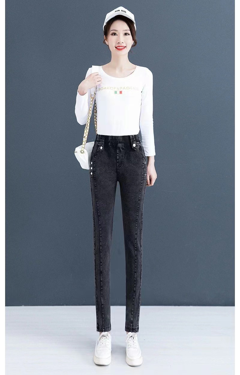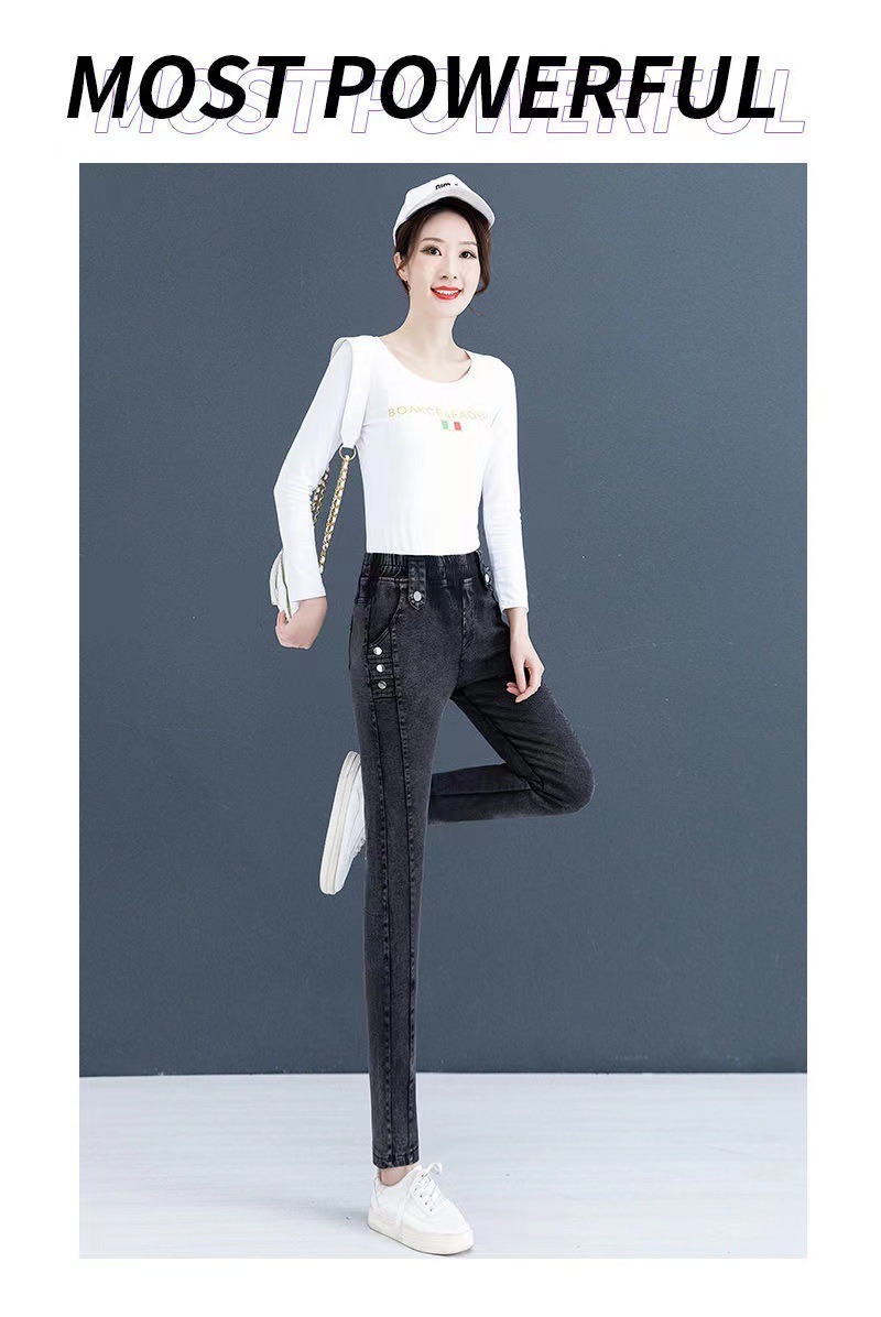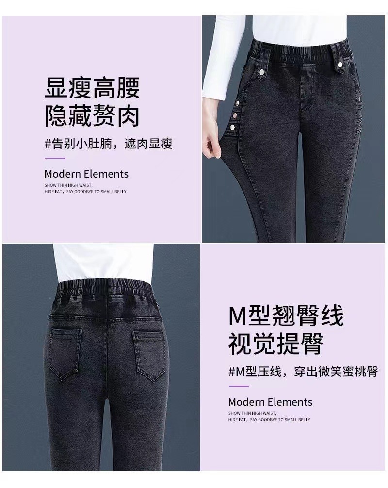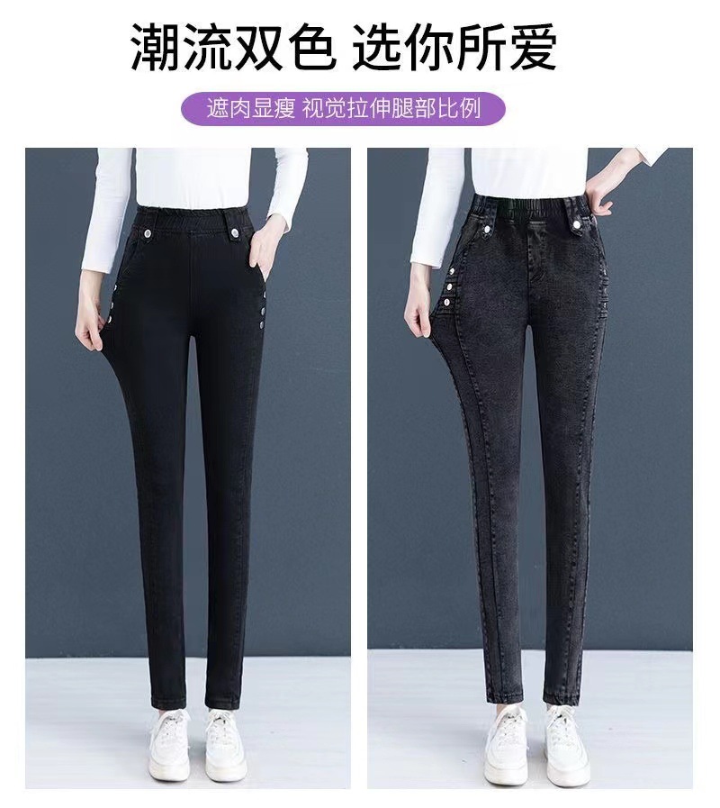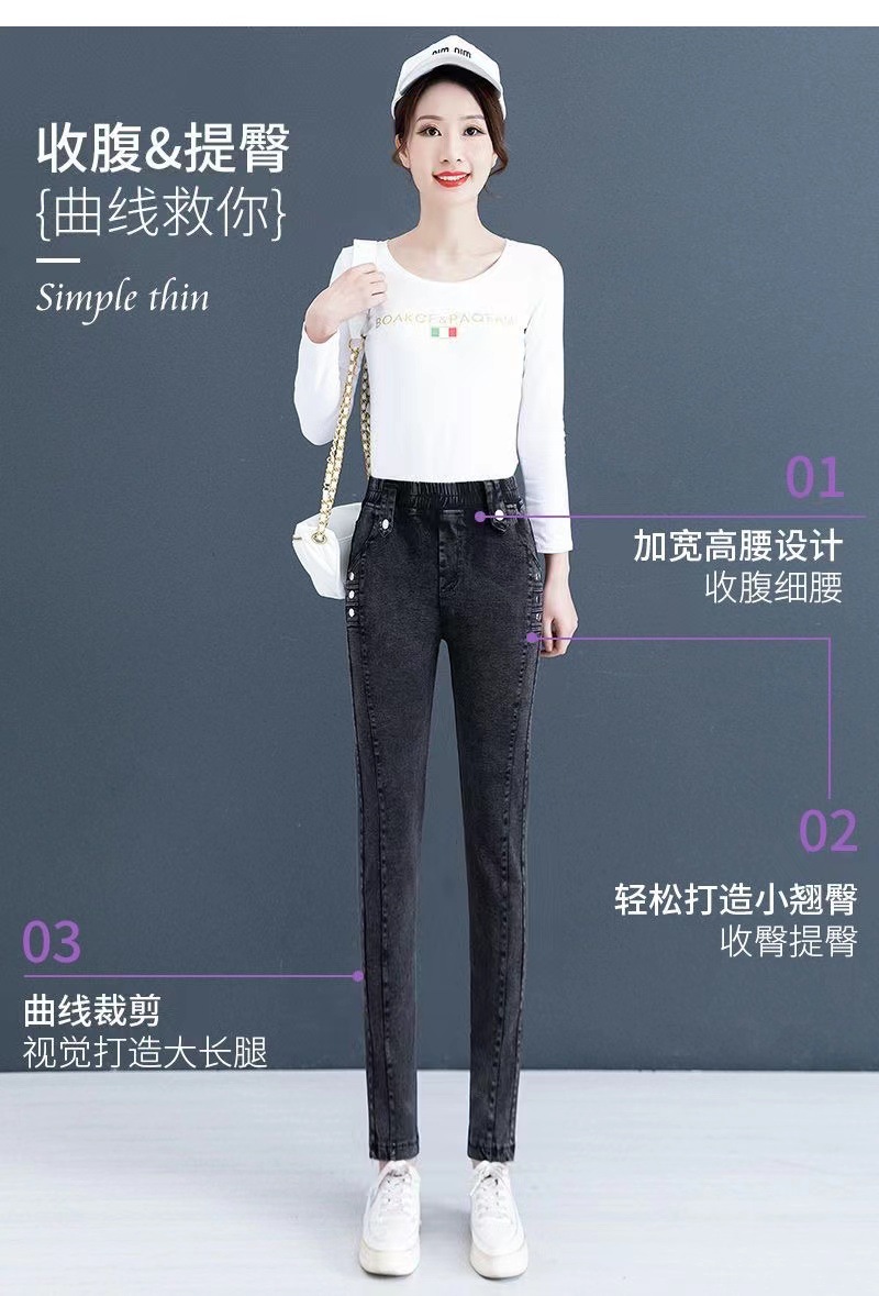 百媚生 【单里/加绒】松紧腰弹力牛仔裤高腰小脚裤9058