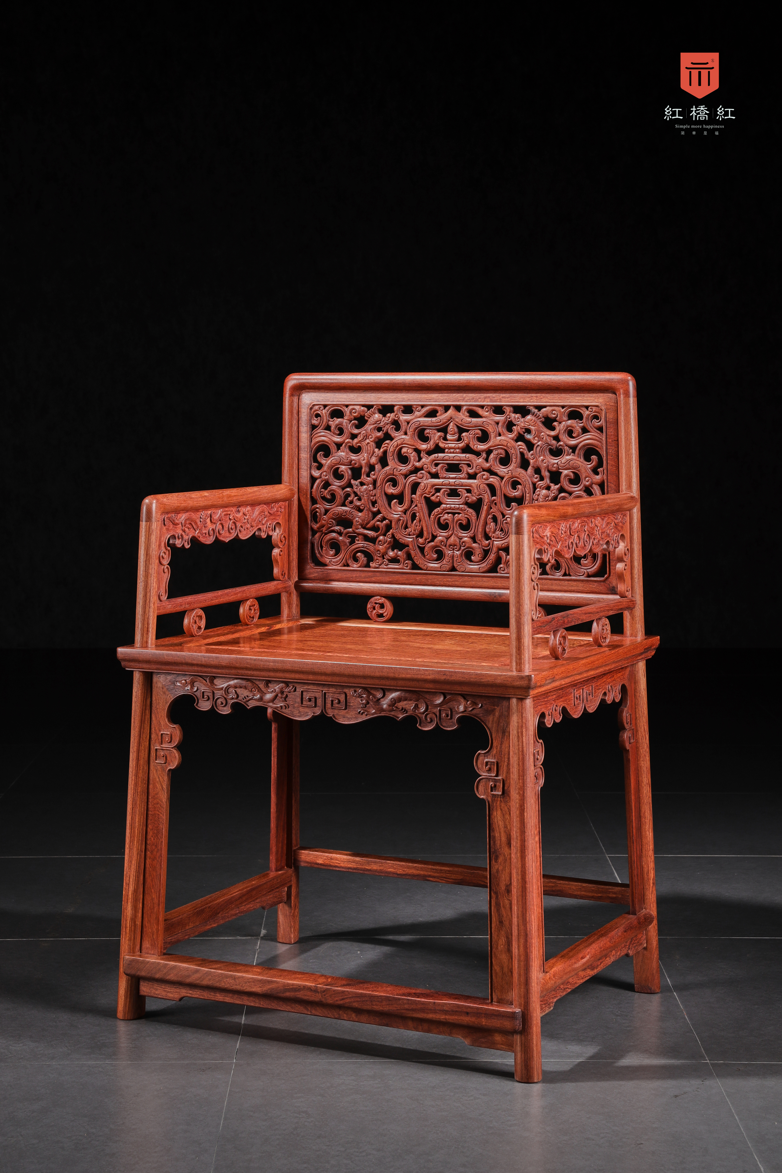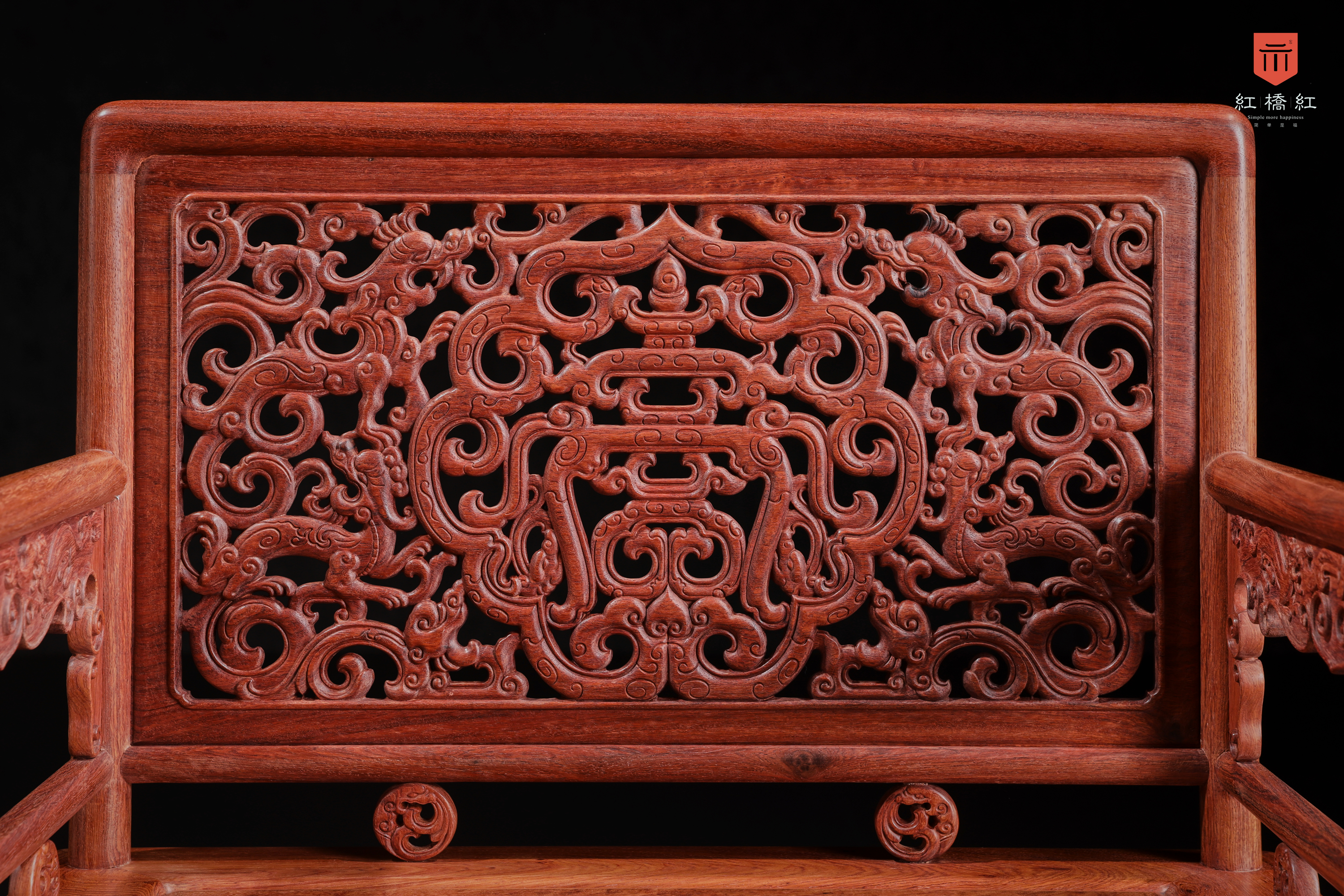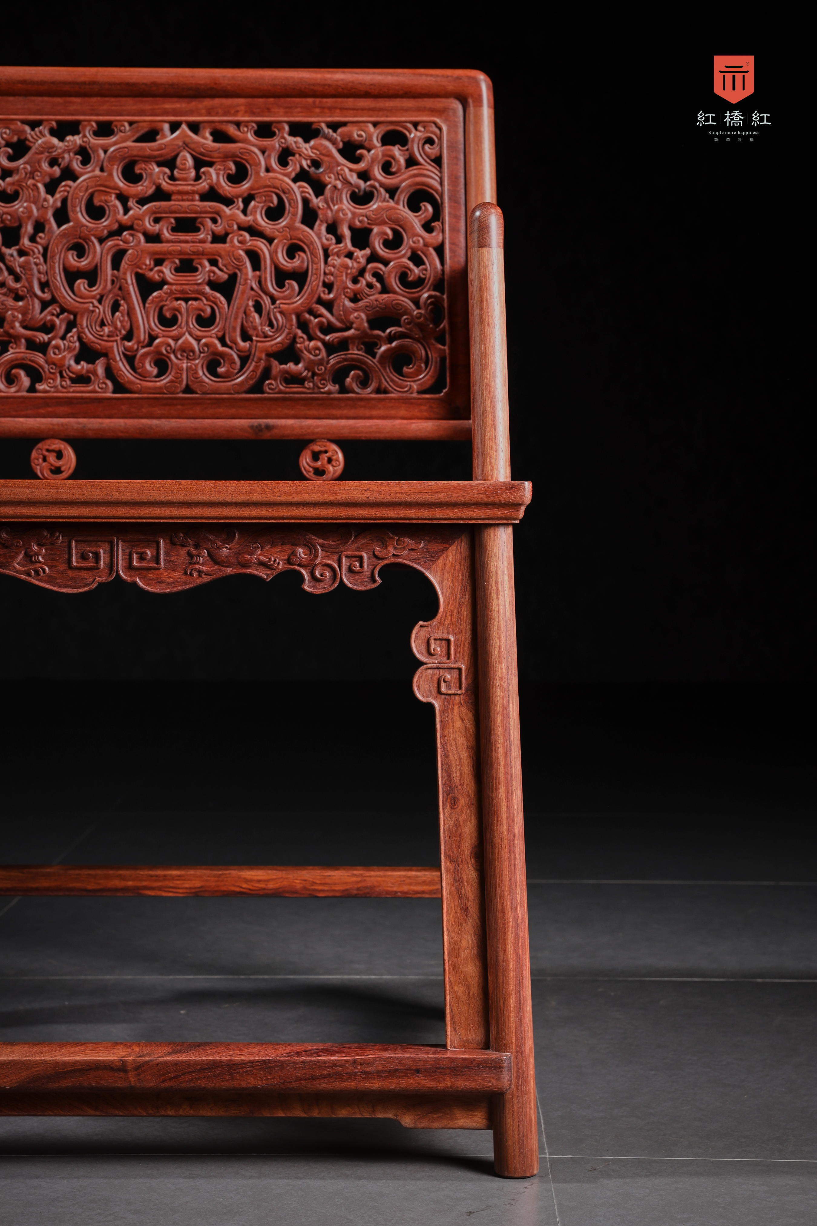 此款玫瑰椅原型为王世襄《明式家具珍赏》一书中,明黄花梨透雕靠背玫瑰椅,靠背板嵌装镂雕群龙捧寿纹,有“群龙捧寿”之意。