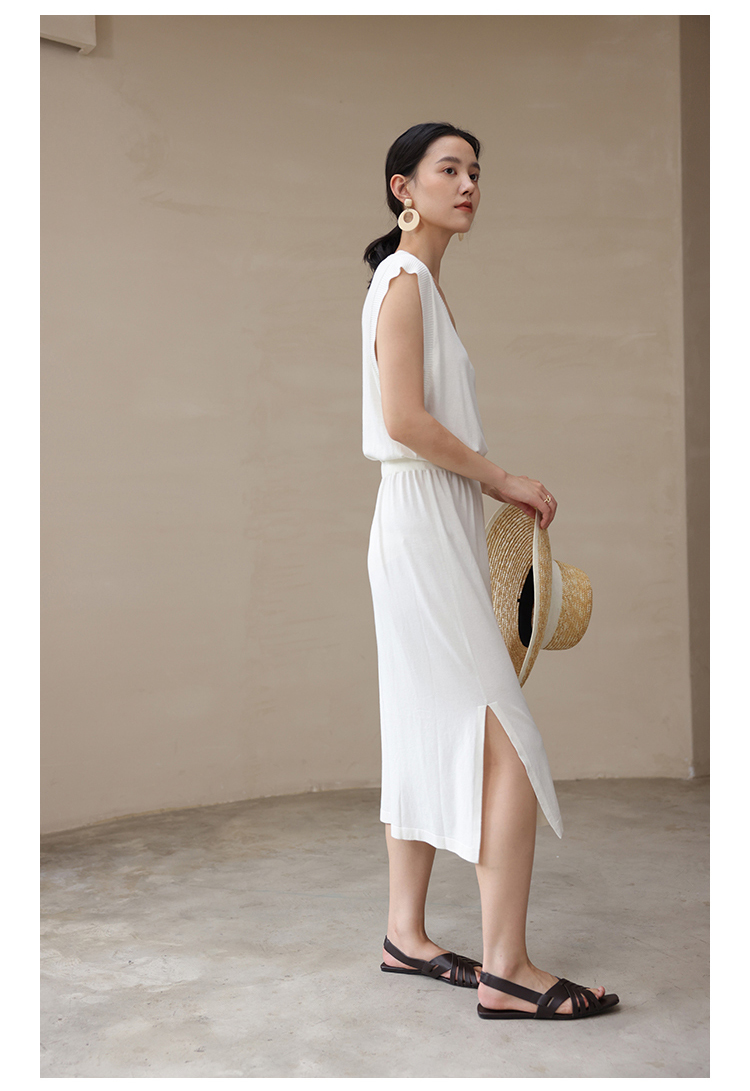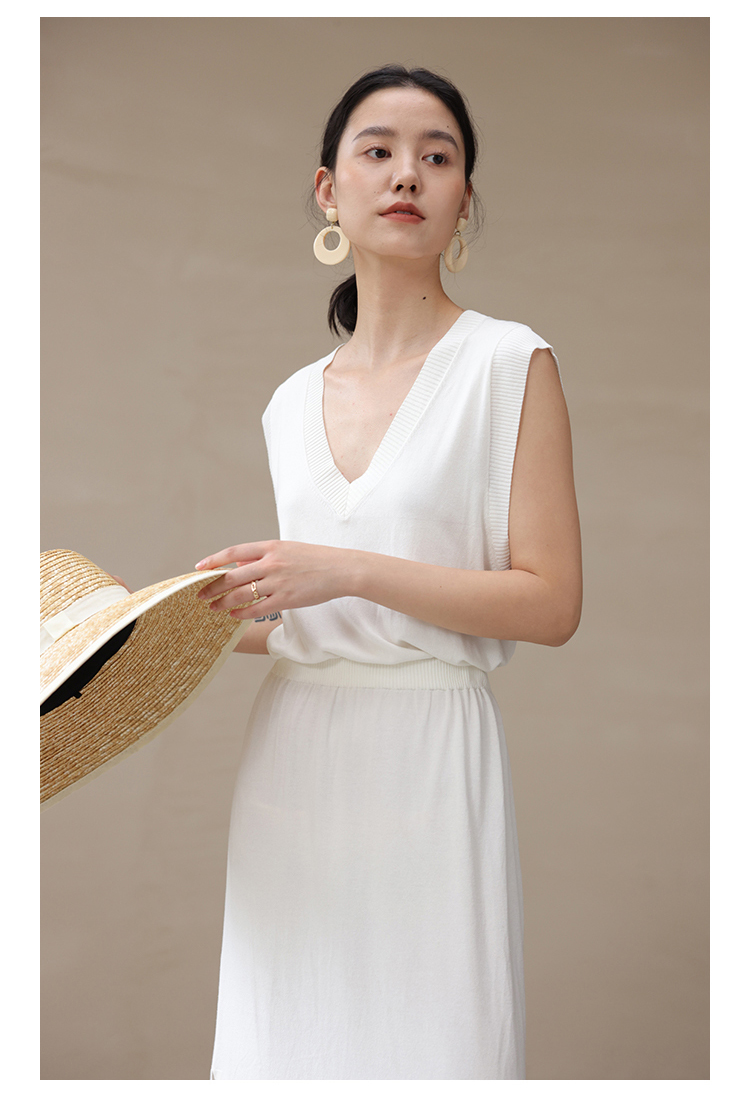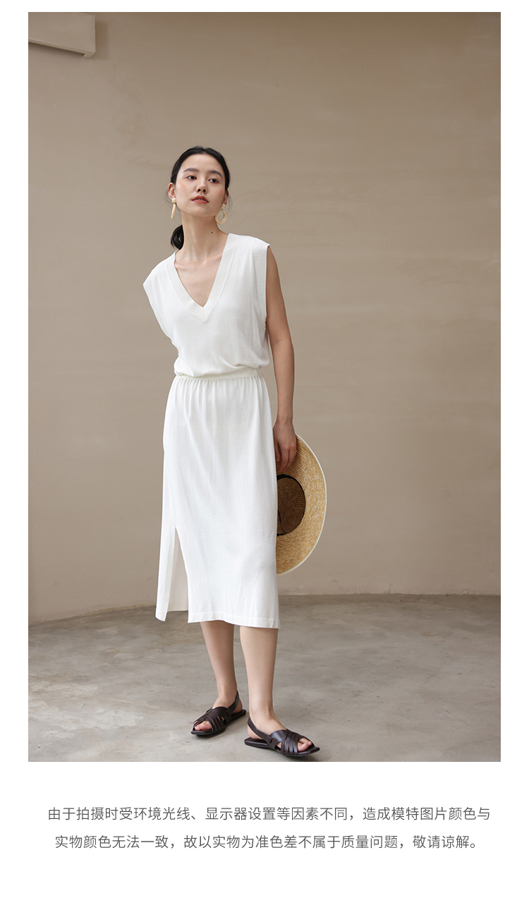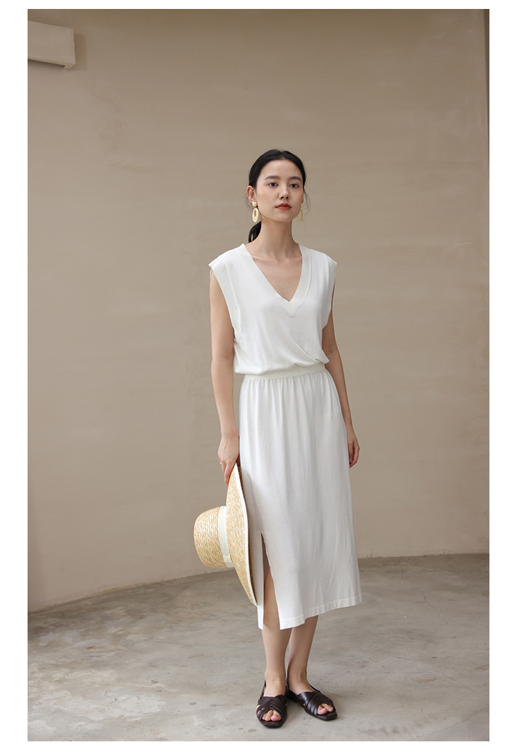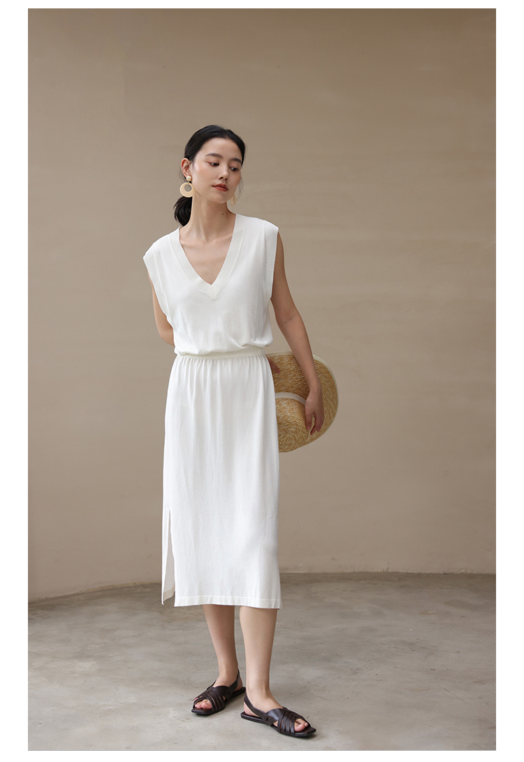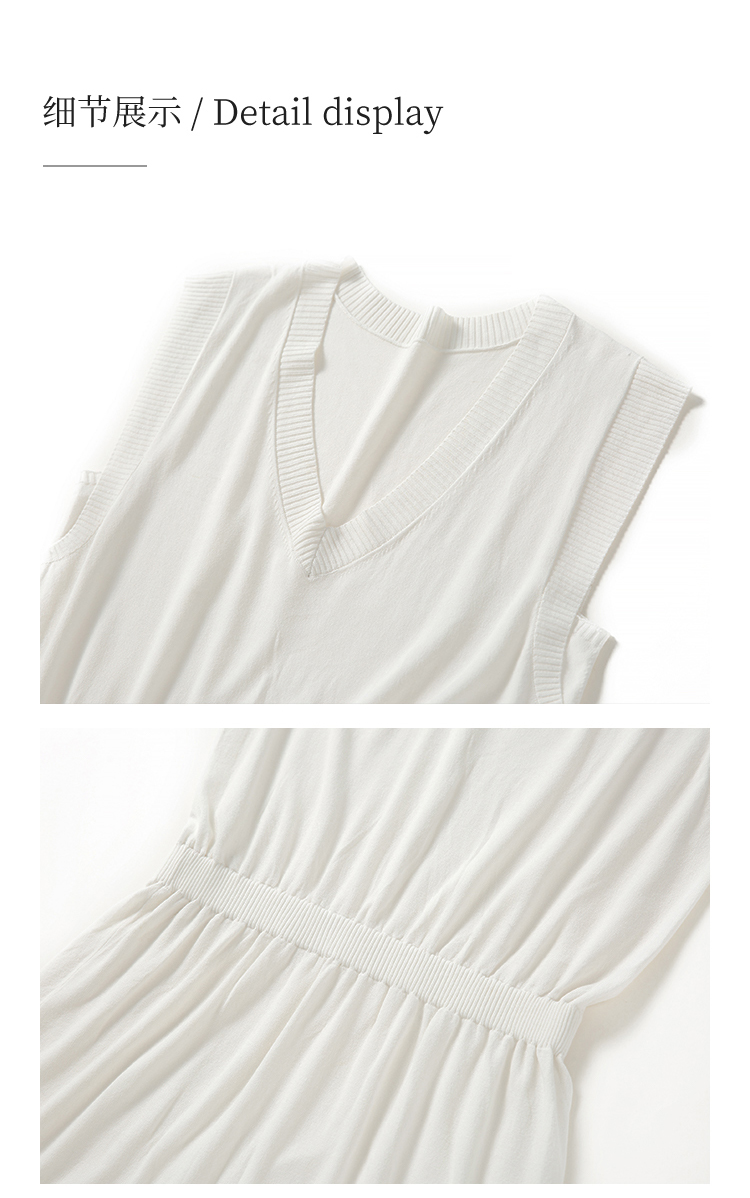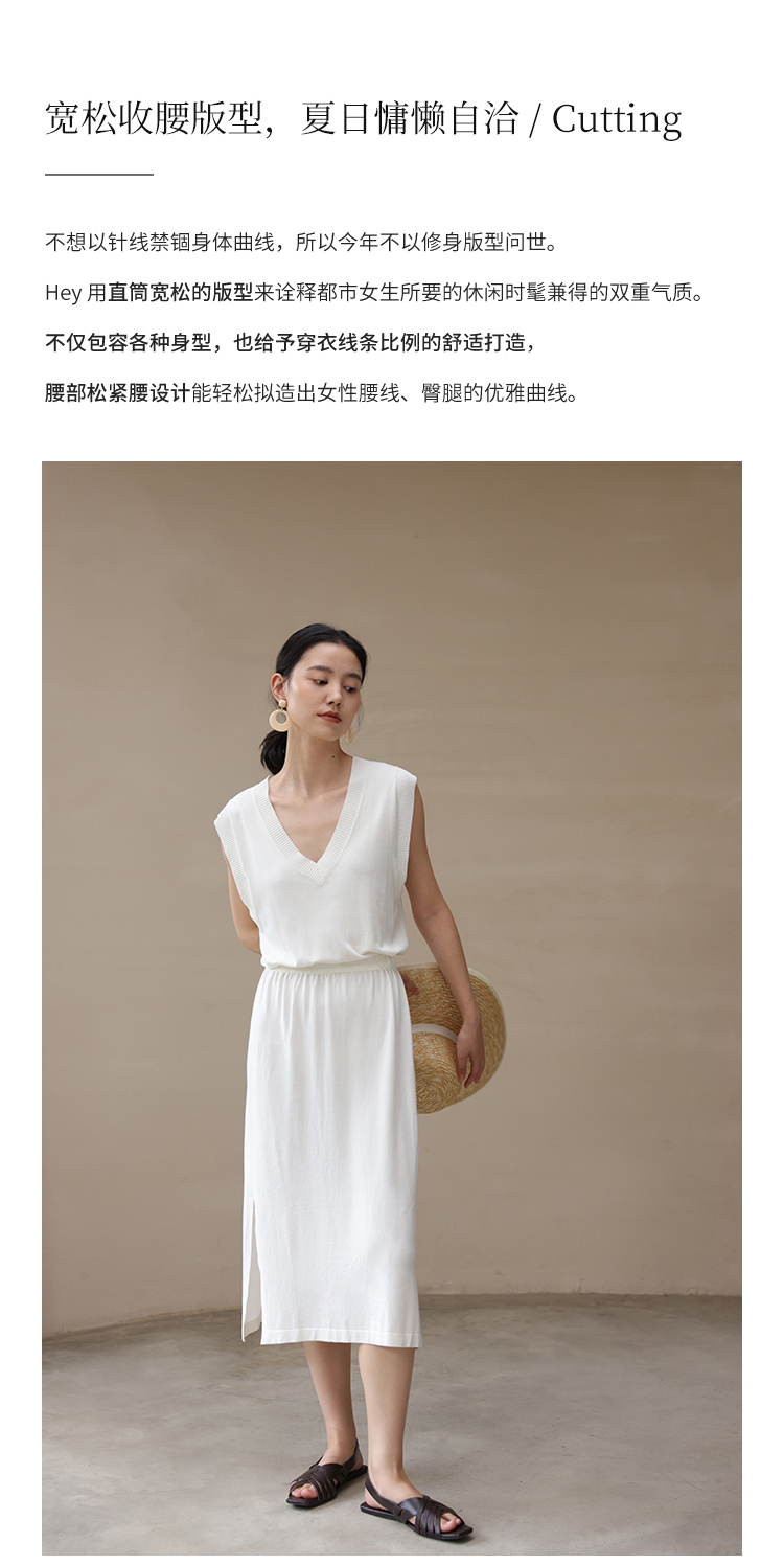 HeyDress法式针织连衣裙女夏季白色V领收腰显瘦设计气质无袖裙子